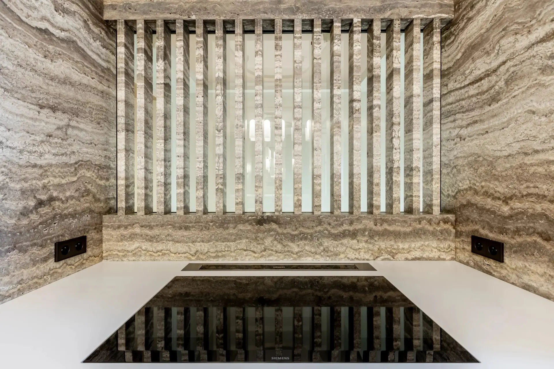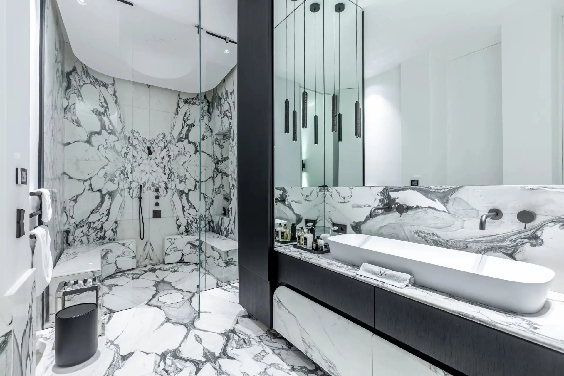 Het appartement is volledig afgewerkt in Italiaans marmer en voorzien van centrale airconditioning en vloerverwarming.