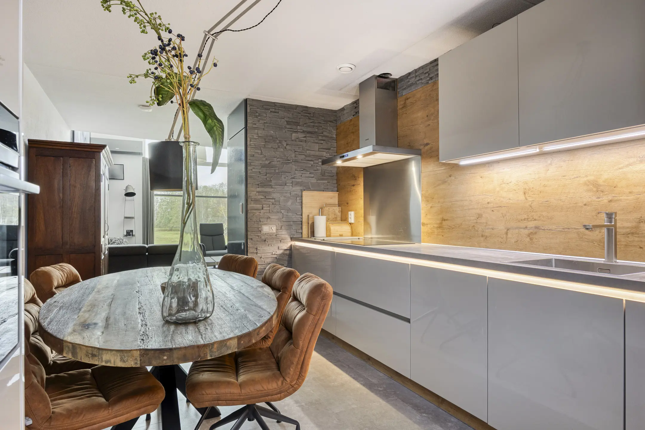 Aan de voorzijde van de woning bevindt zich de open keuken. Deze is voorzien van een lang werkblad met spoelbak, diverse kastruimte en moderne inbouwapparatuur, waaronder een inductie kookplaat, afzuigkap, combi-oven, vaatwasser en koelkast met vriesruimte. Hier is voldoende plek voor een grote eettafel, perfect voor lange diners met familie of vrienden.