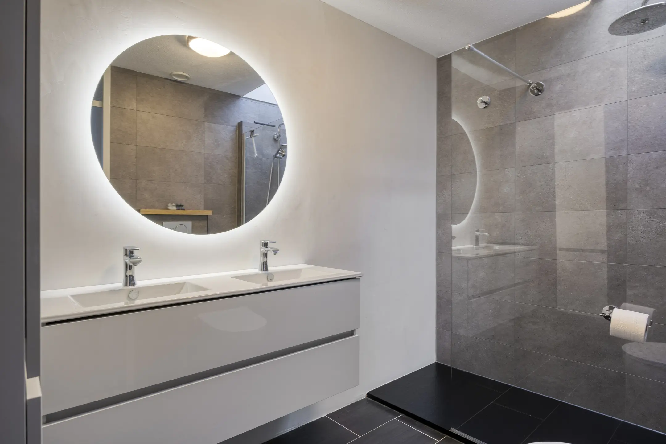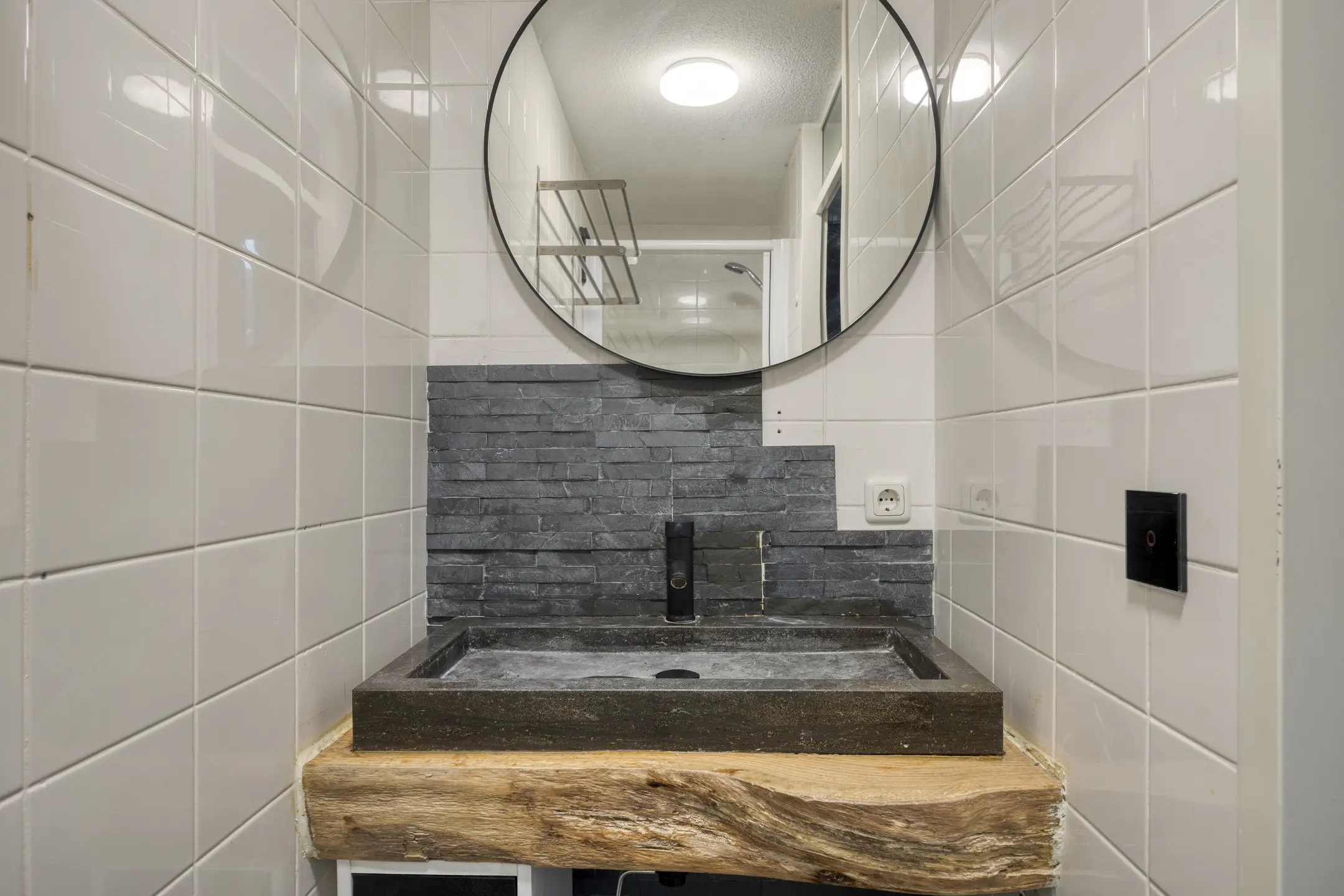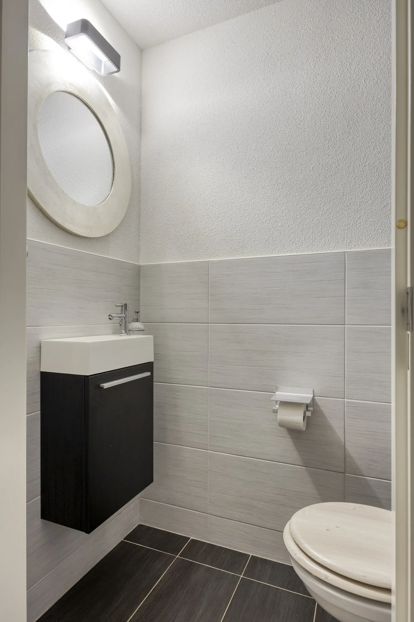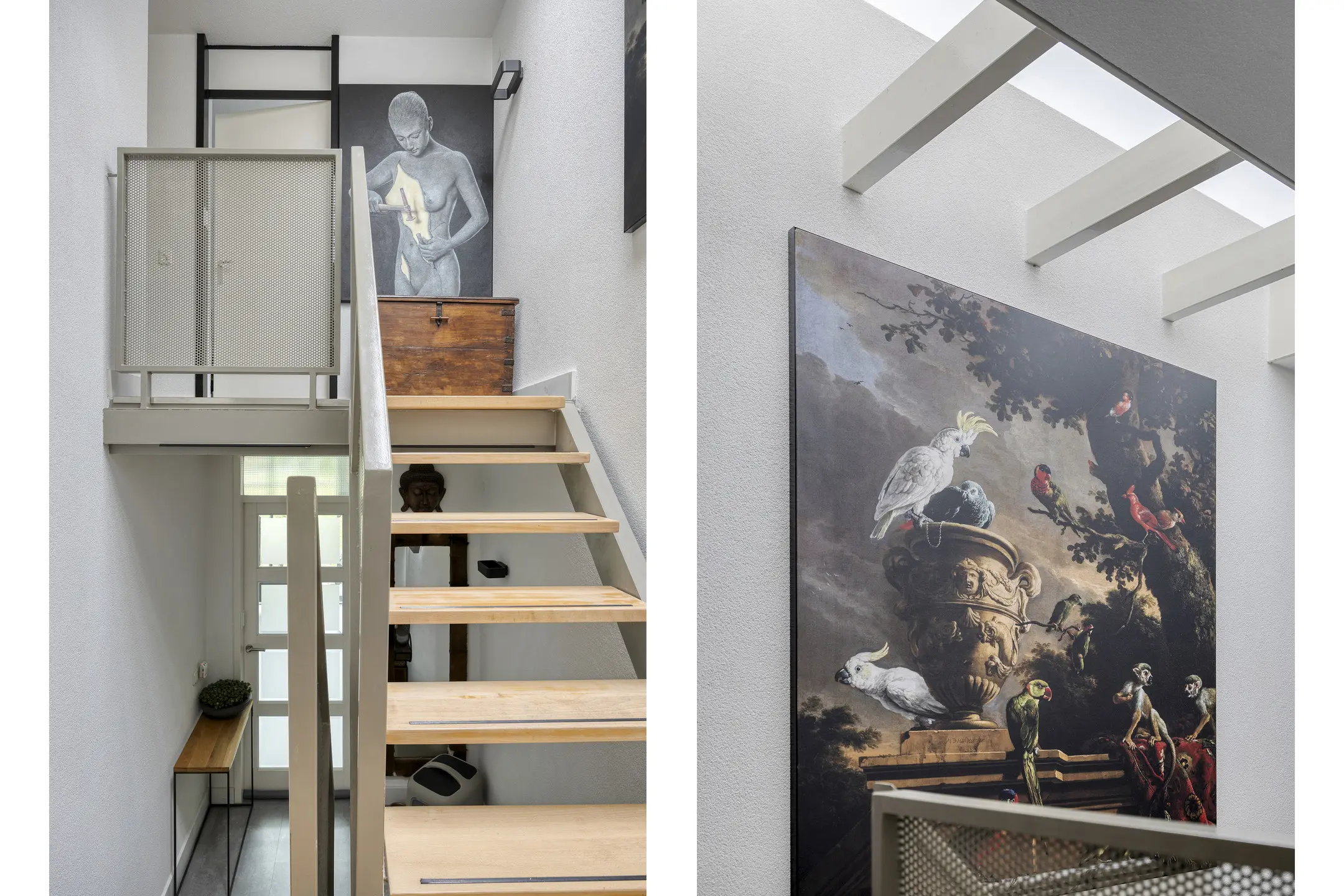 Via de voordeur stap je de ruime hal binnen, waar meteen de moderne uitstraling van de woning opvalt. Vanuit hier heb je toegang tot het trappenhuis én enkele treden omlaag naar het souterrainniveau.