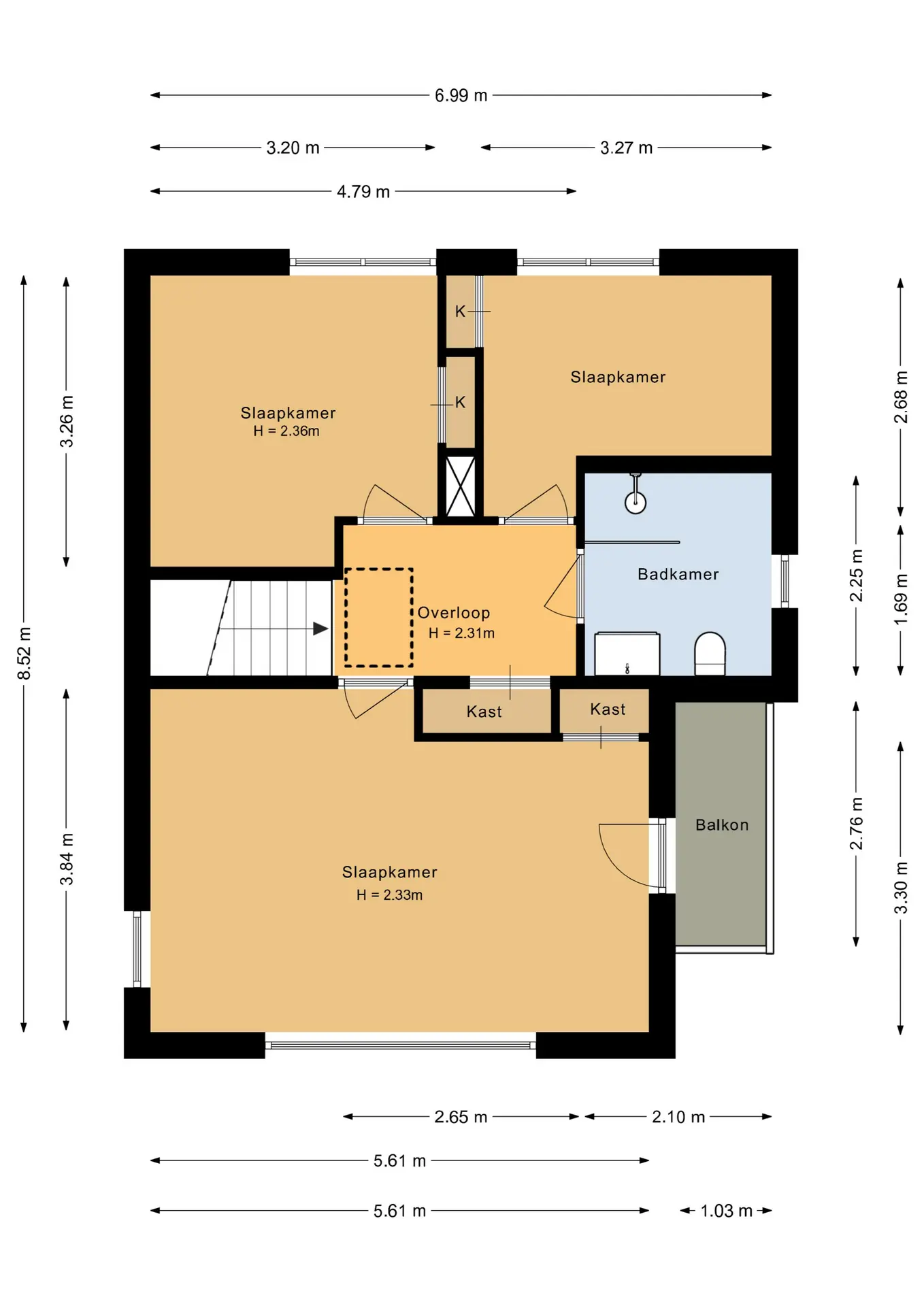 Op de eerste verdieping vinden we een drietal kamers welke allen zijn voorzien van een praktische inbouwkast, tevens biedt de hoofdslaapkamer ook toegang tot het balkon. De badkamer (2024) is voorzien van een hangend closet, wastafelmeubel, designradiator en inloopdouche met hand- en regendouche.