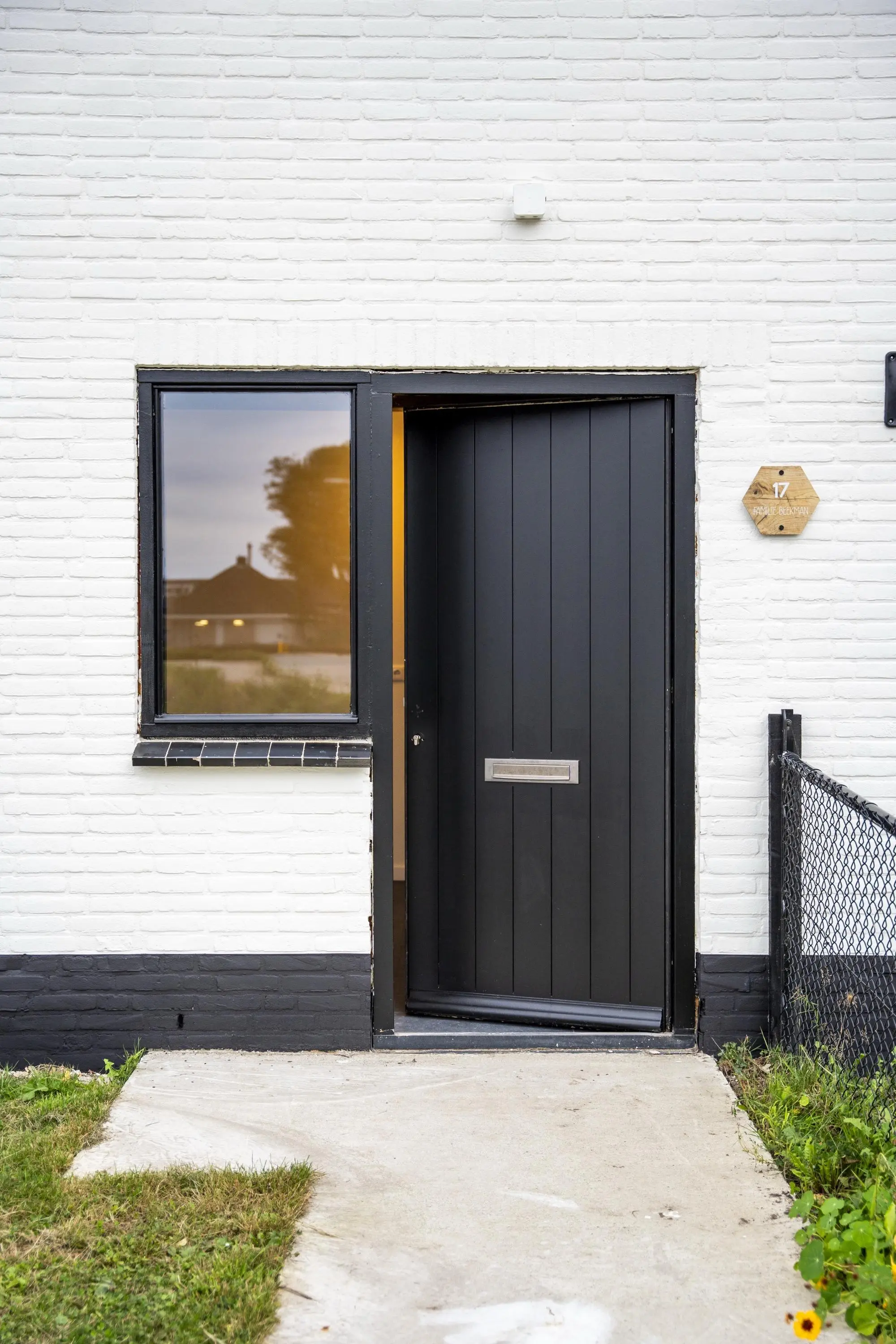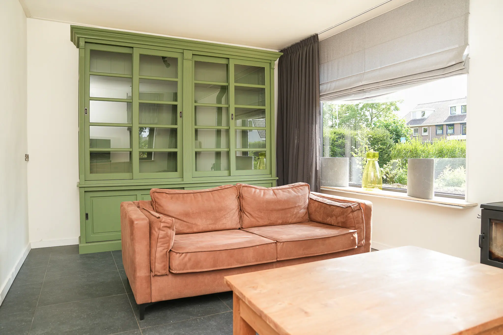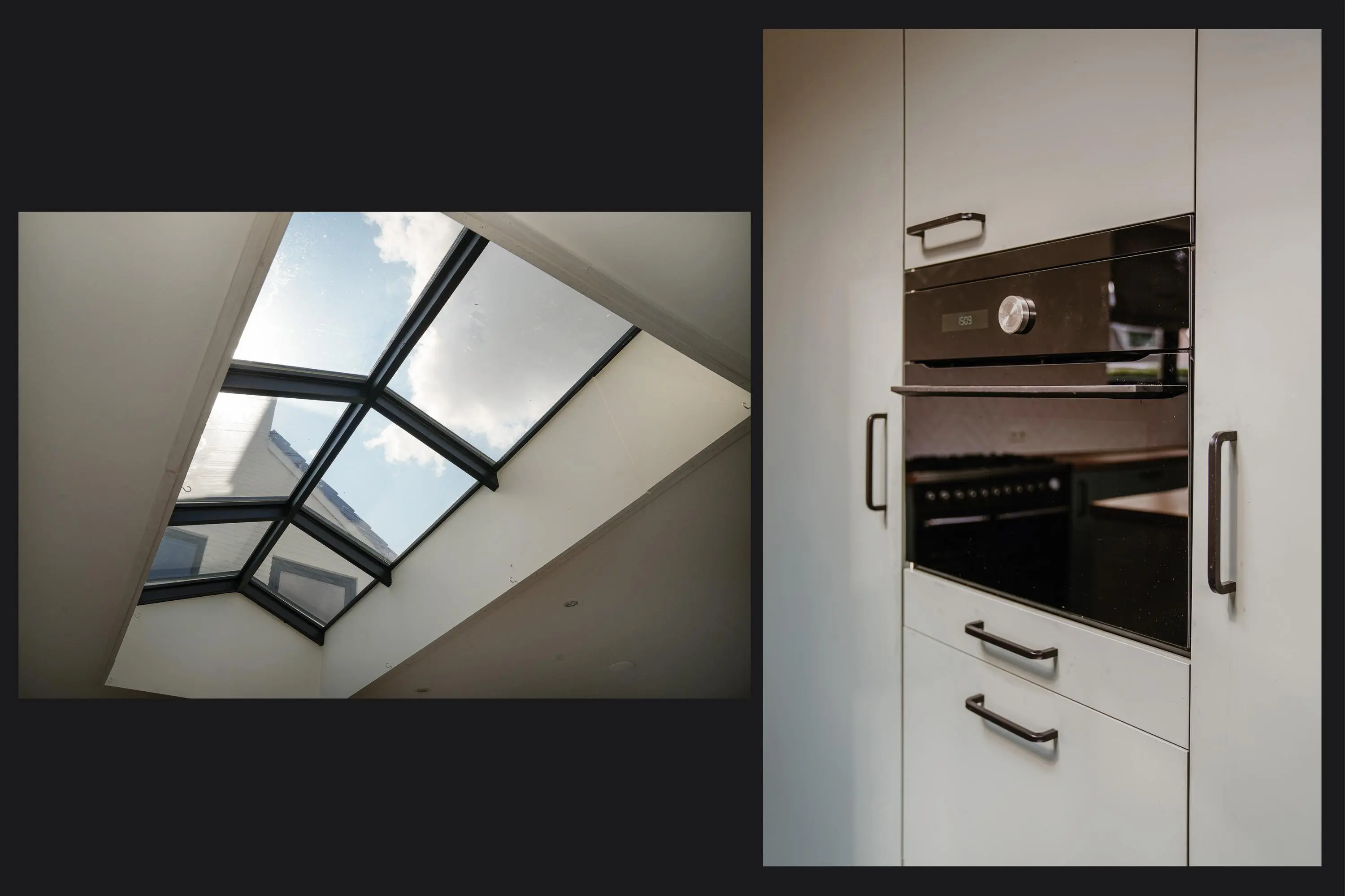 Je begint in de uitbouw aan de achterzijde – het kloppend hart van het huis. Hier ligt de open keuken met robuust keukeneiland, boretti gasfornuis, combi-oven, grote koelkast, grote vriezer en vaatwasser. De dubbel openslaande tuindeuren brengen het buitenleven naar binnen en verbinden koken, tafelen en genieten in de tuin tot één geheel.