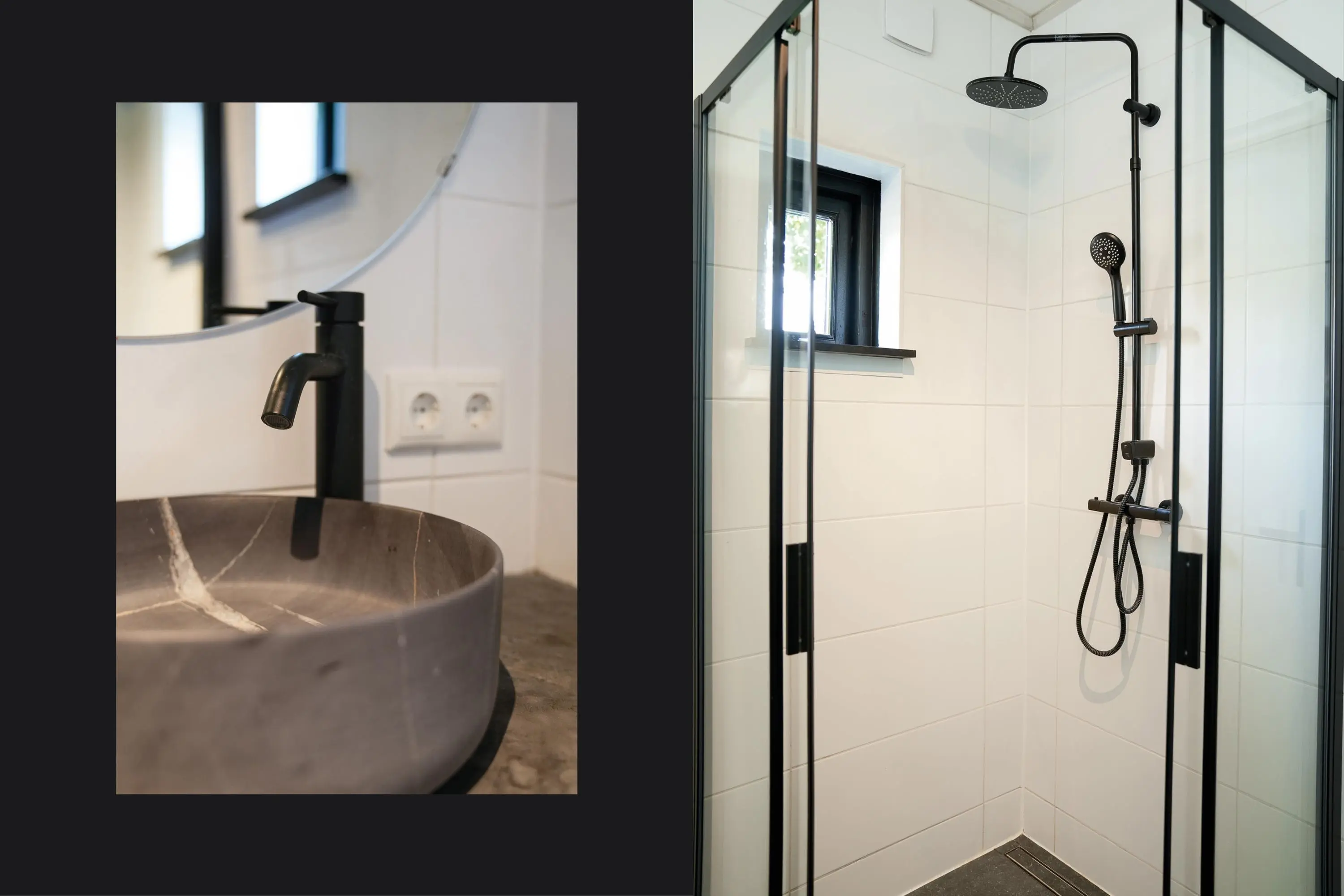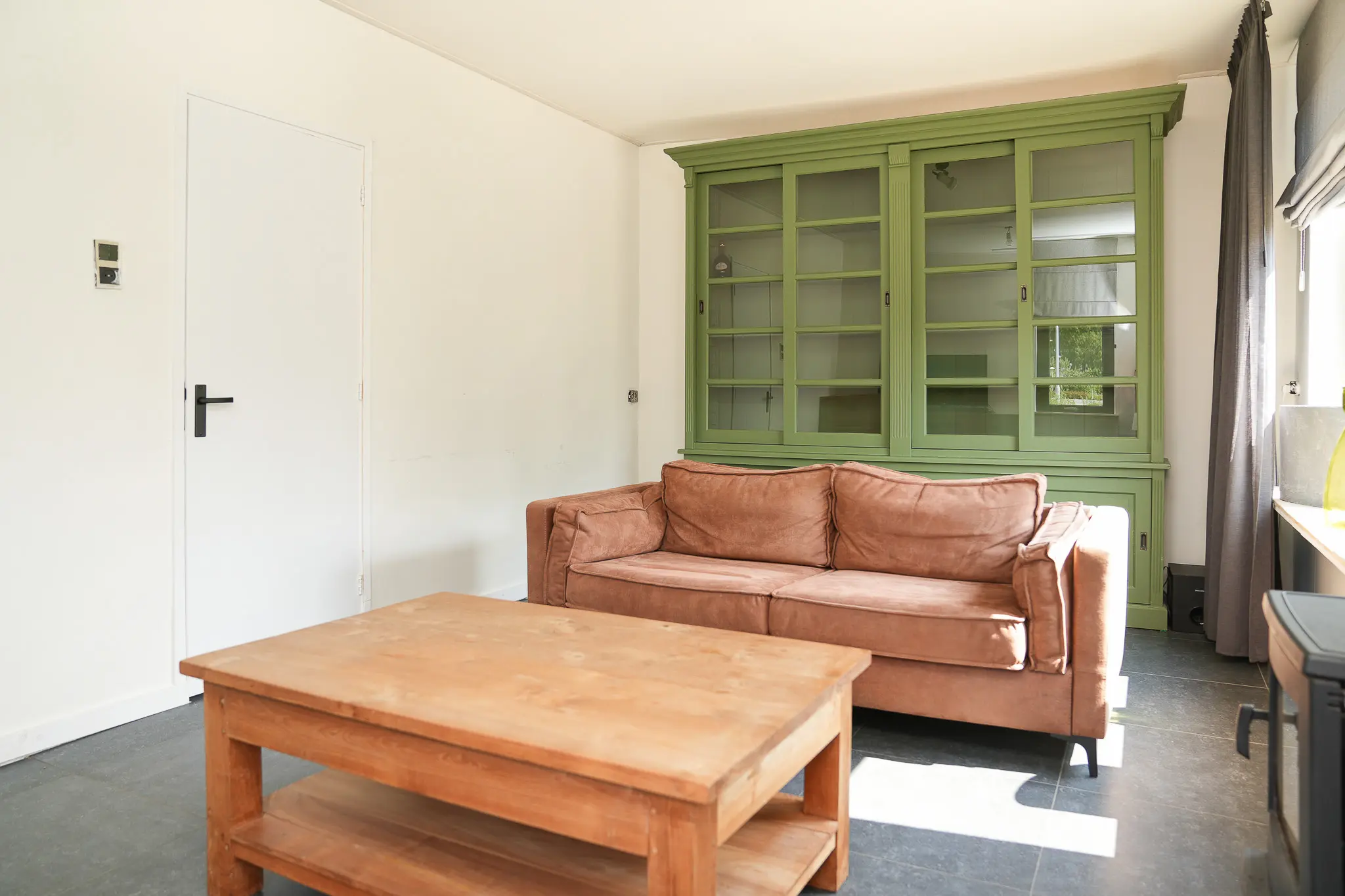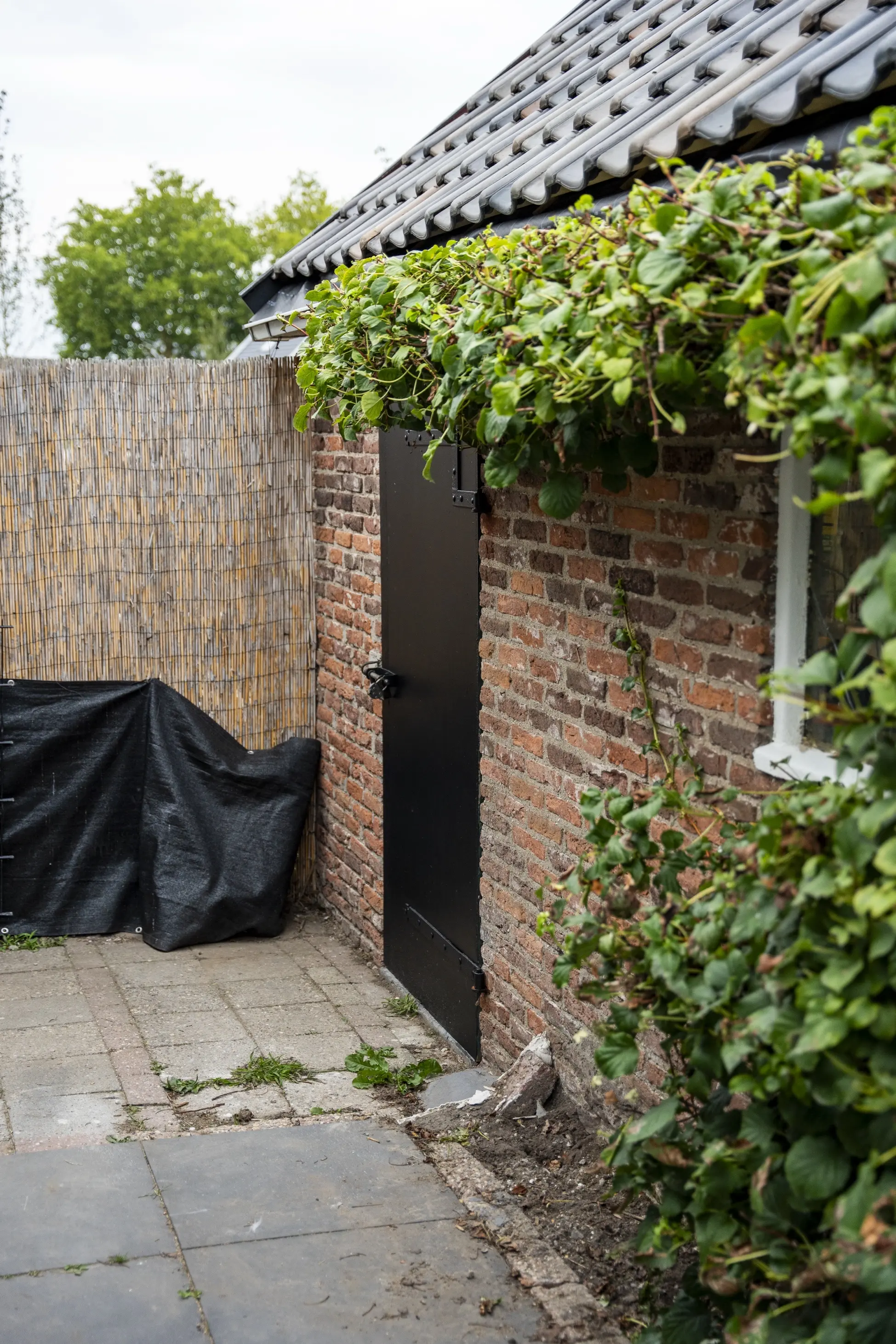 Je begint in de uitbouw aan de achterzijde – het kloppend hart van het huis. Hier ligt de open keuken met robuust keukeneiland, boretti gasfornuis, combi-oven, grote koelkast, grote vriezer en vaatwasser. De dubbel openslaande tuindeuren brengen het buitenleven naar binnen en verbinden koken, tafelen en genieten in de tuin tot één geheel.