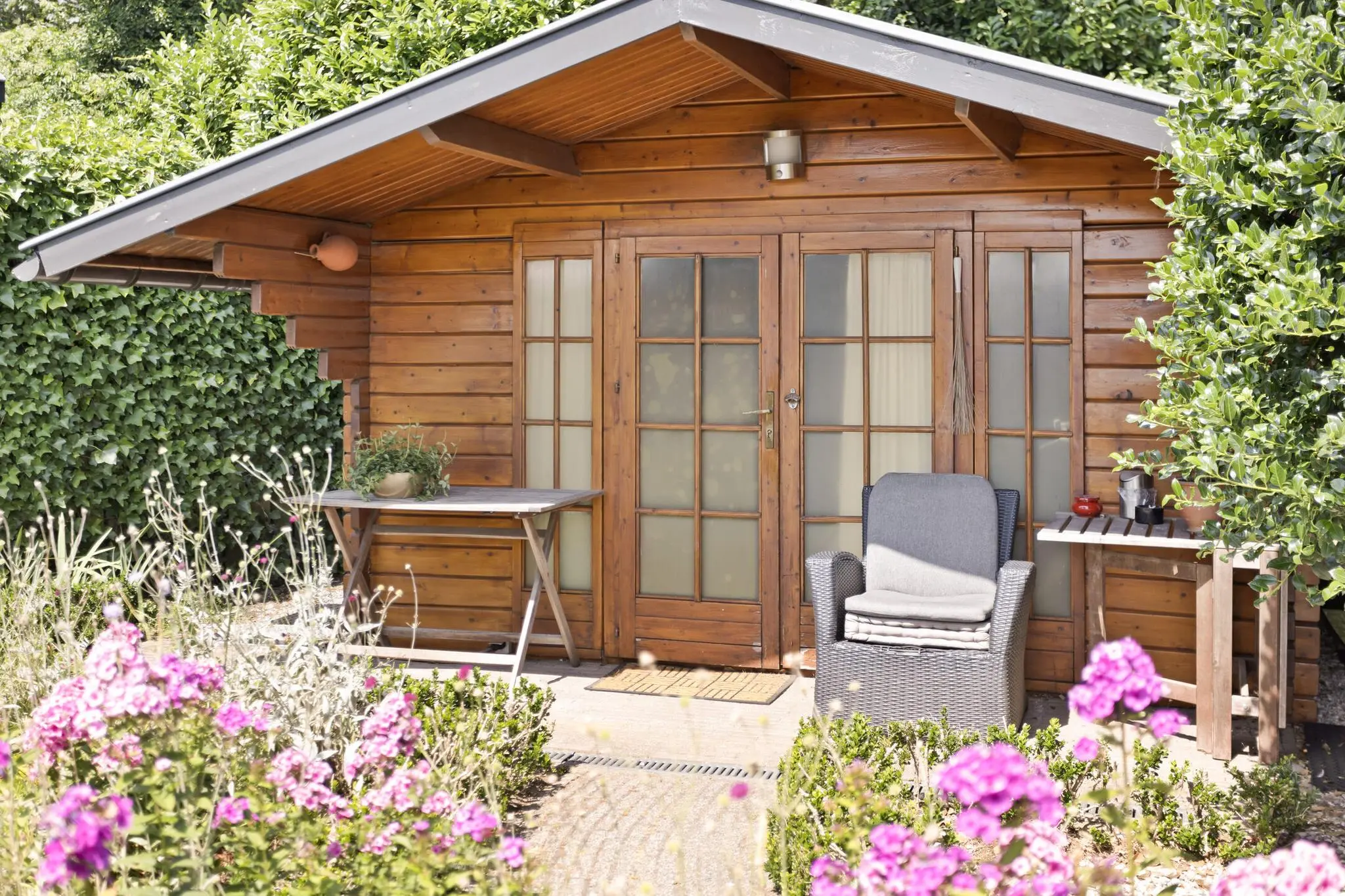• Handige houten schuur – ideaal voor fietsen, gereedschap of hobby’s