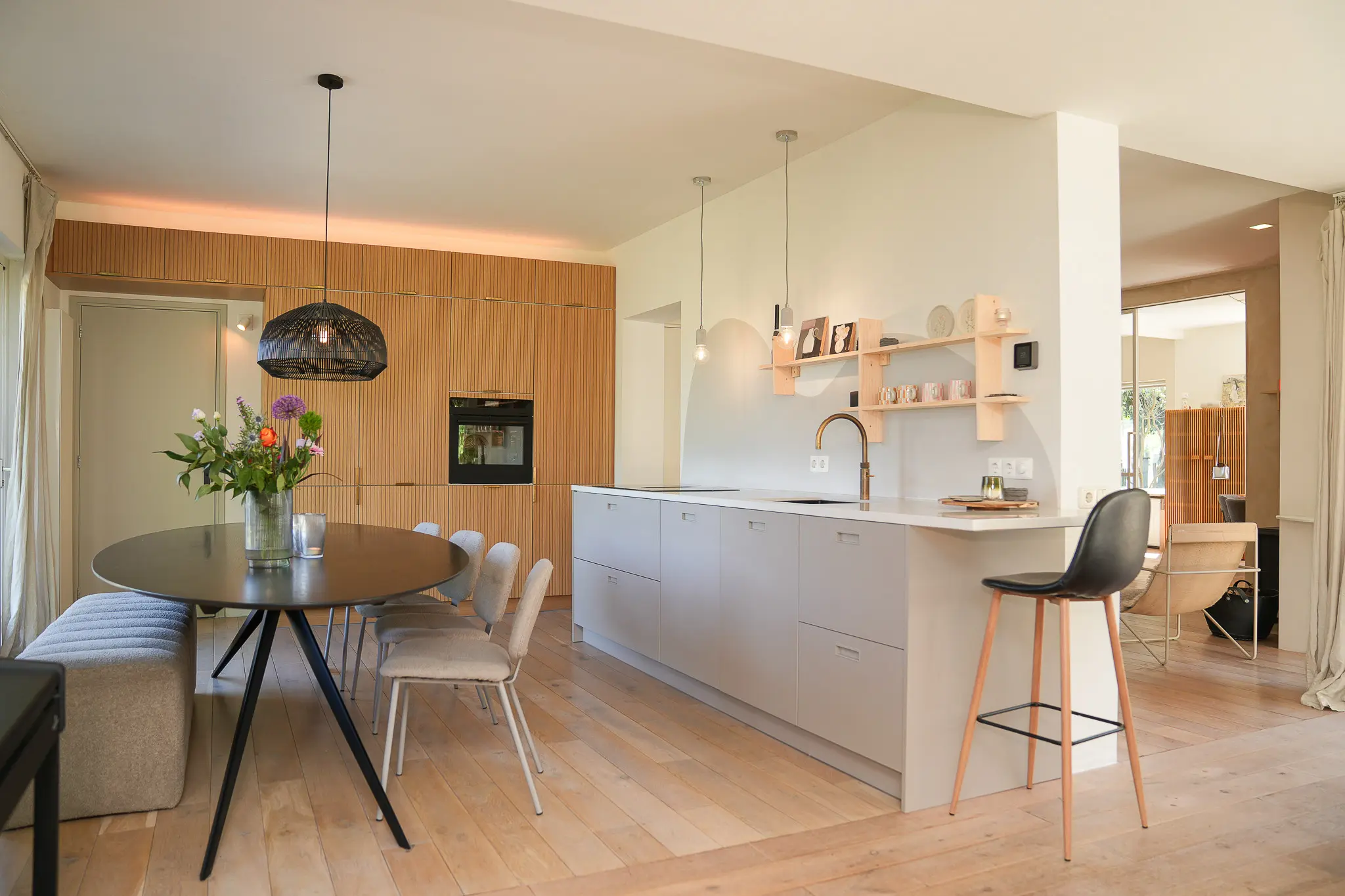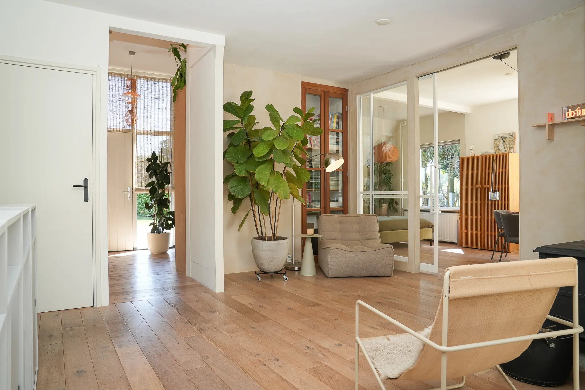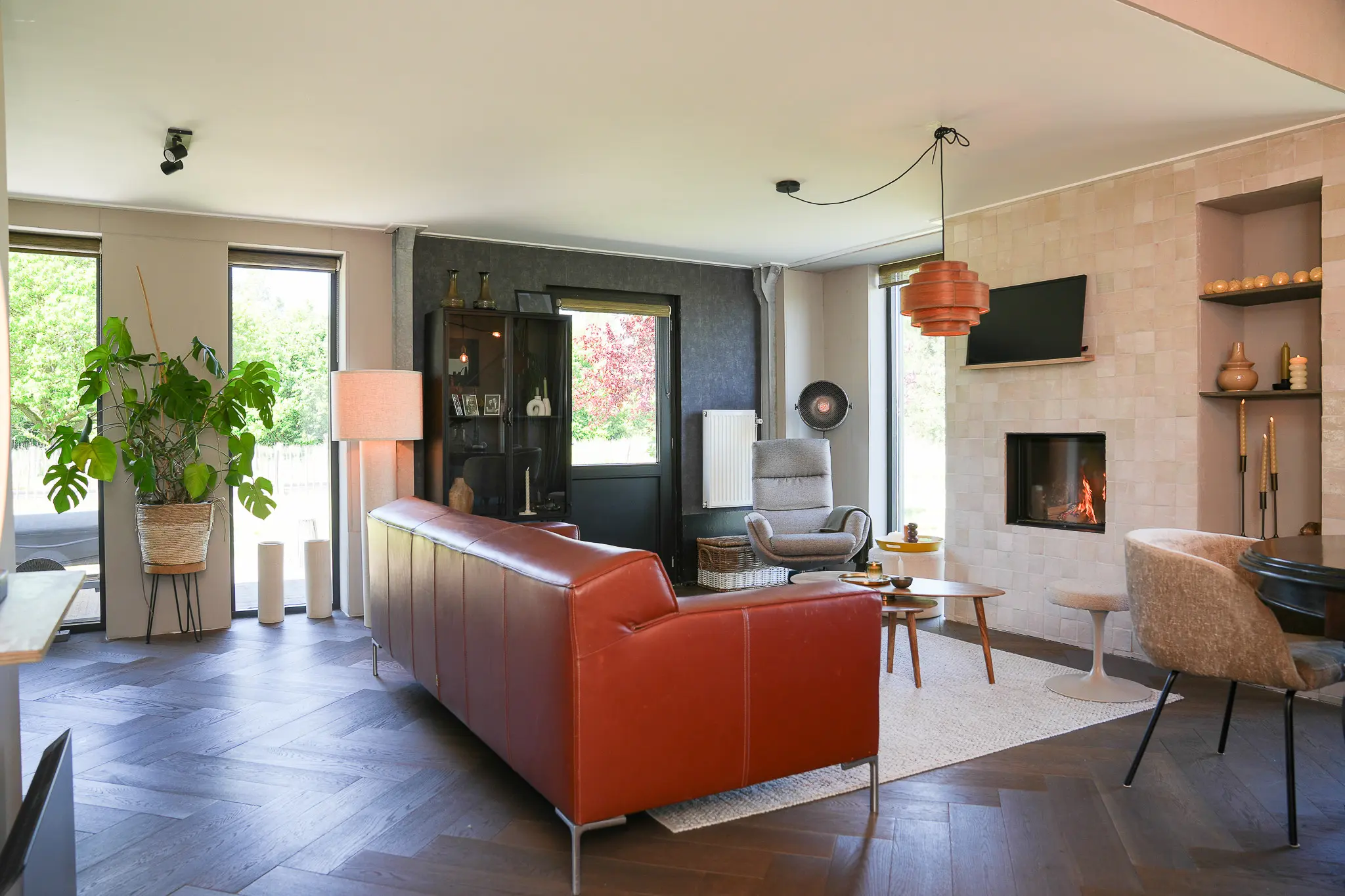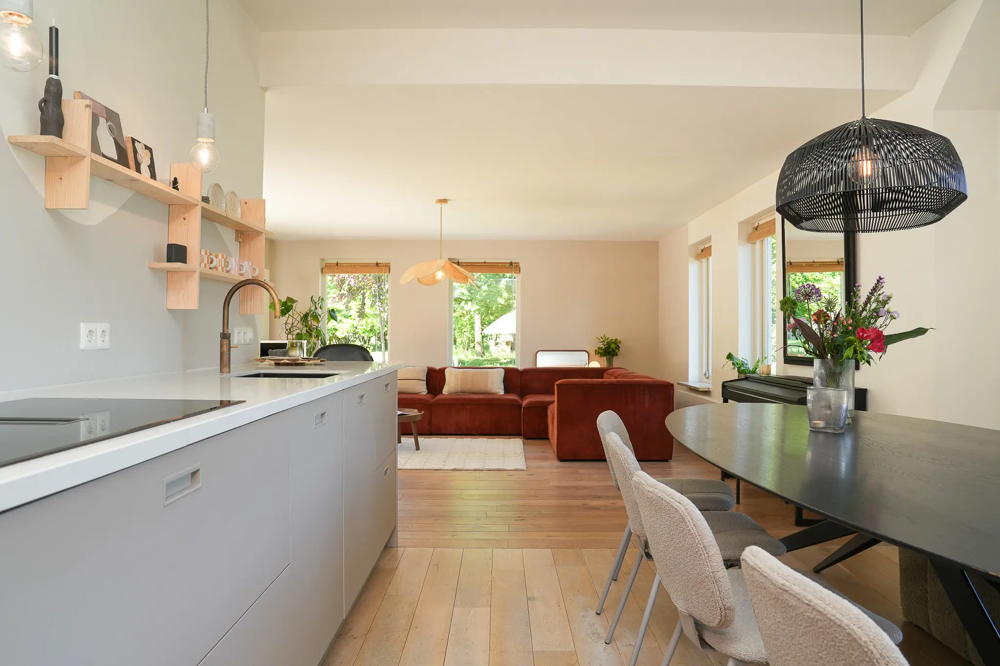 De hoofdwoning is modern afgewerkt met natuurlijke materialen, warme tinten en houten vloeren. De open keuken is een echte blikvanger, uitgerust met hoogwaardige inbouwapparatuur, een stoomoven, inductiekookplaat met geïntegreerde afzuiging, een Quooker en een gun metal spoelbak. De grote eiken wandkasten bieden volop opbergruimte en de keuken loopt direct over in de lichte woonkamer.