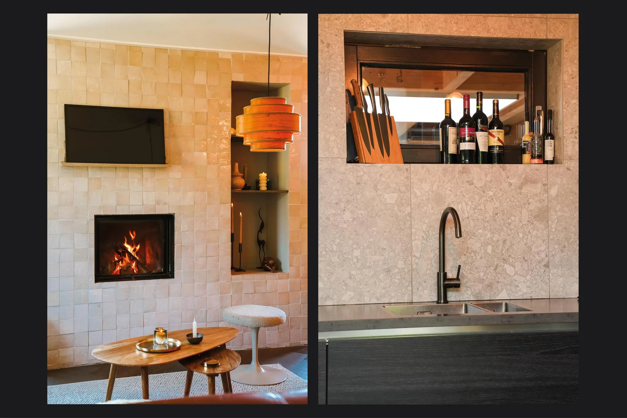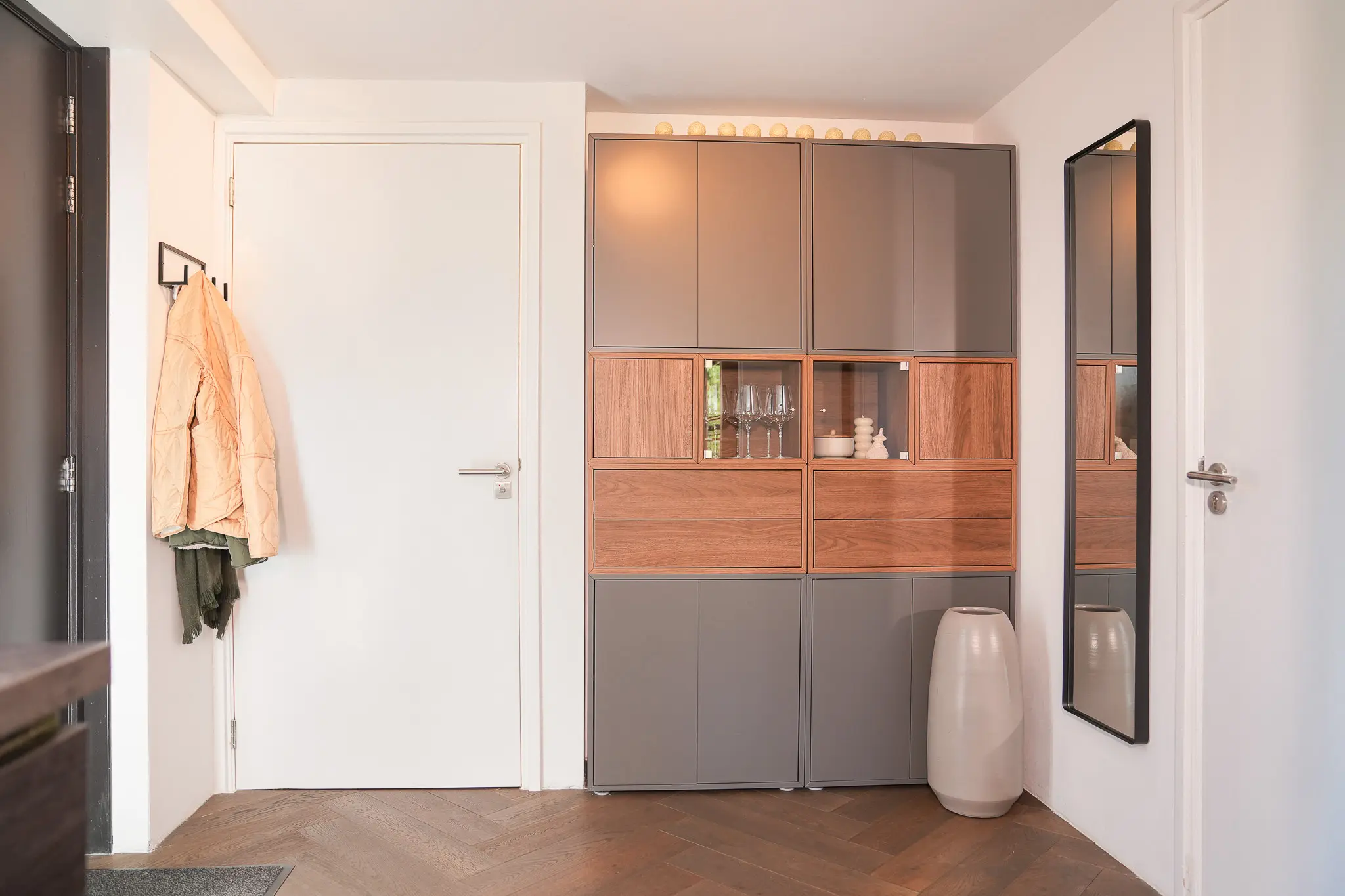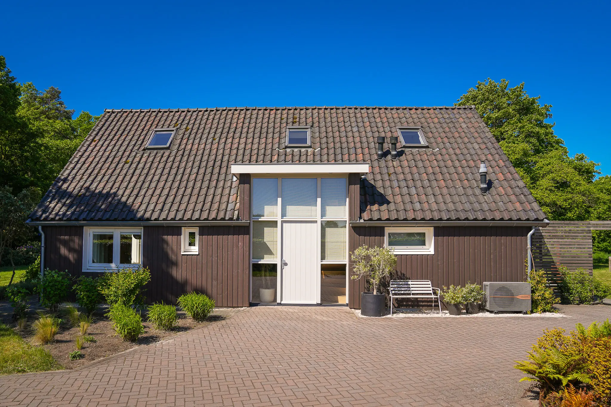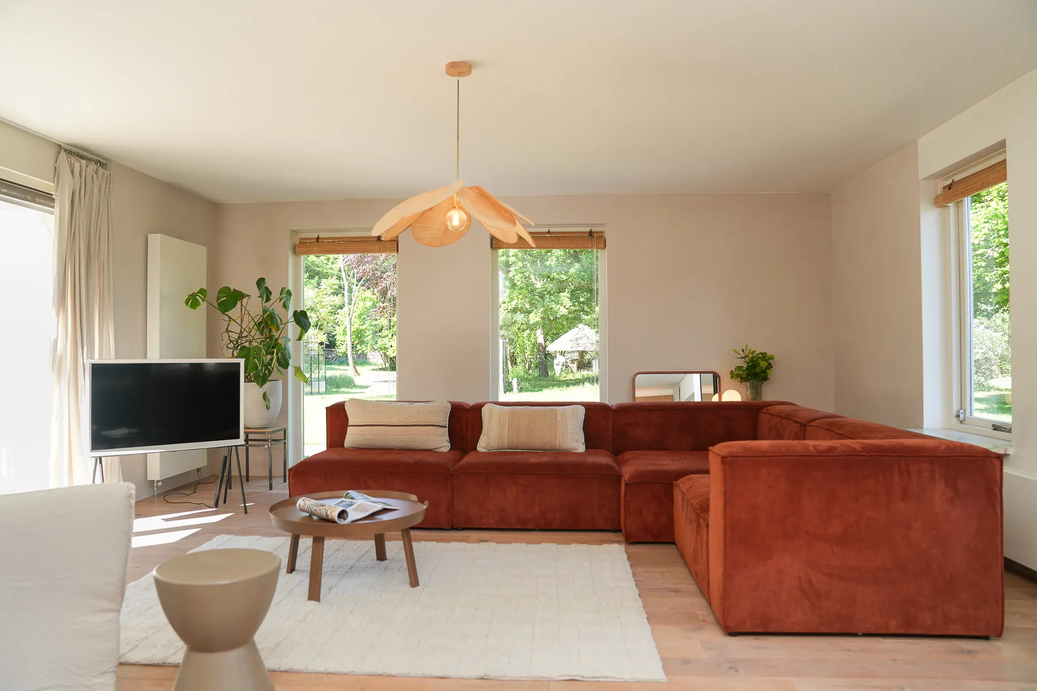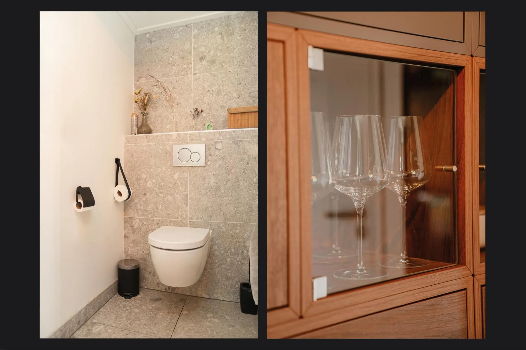 De hoofdwoning is modern afgewerkt met natuurlijke materialen, warme tinten en houten vloeren. De open keuken is een echte blikvanger, uitgerust met hoogwaardige inbouwapparatuur, een stoomoven, inductiekookplaat met geïntegreerde afzuiging, een Quooker en een gun metal spoelbak. De grote eiken wandkasten bieden volop opbergruimte en de keuken loopt direct over in de lichte woonkamer.