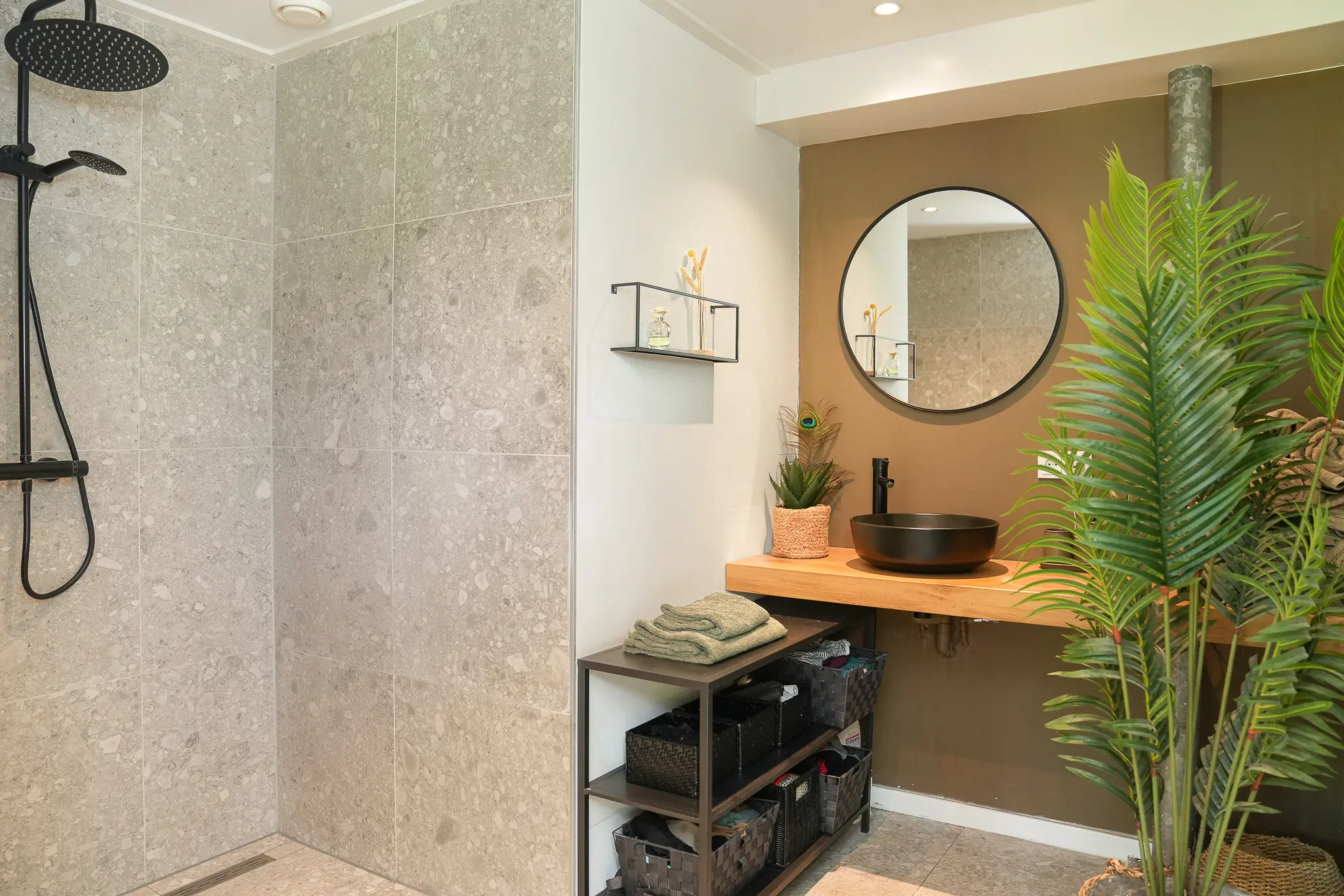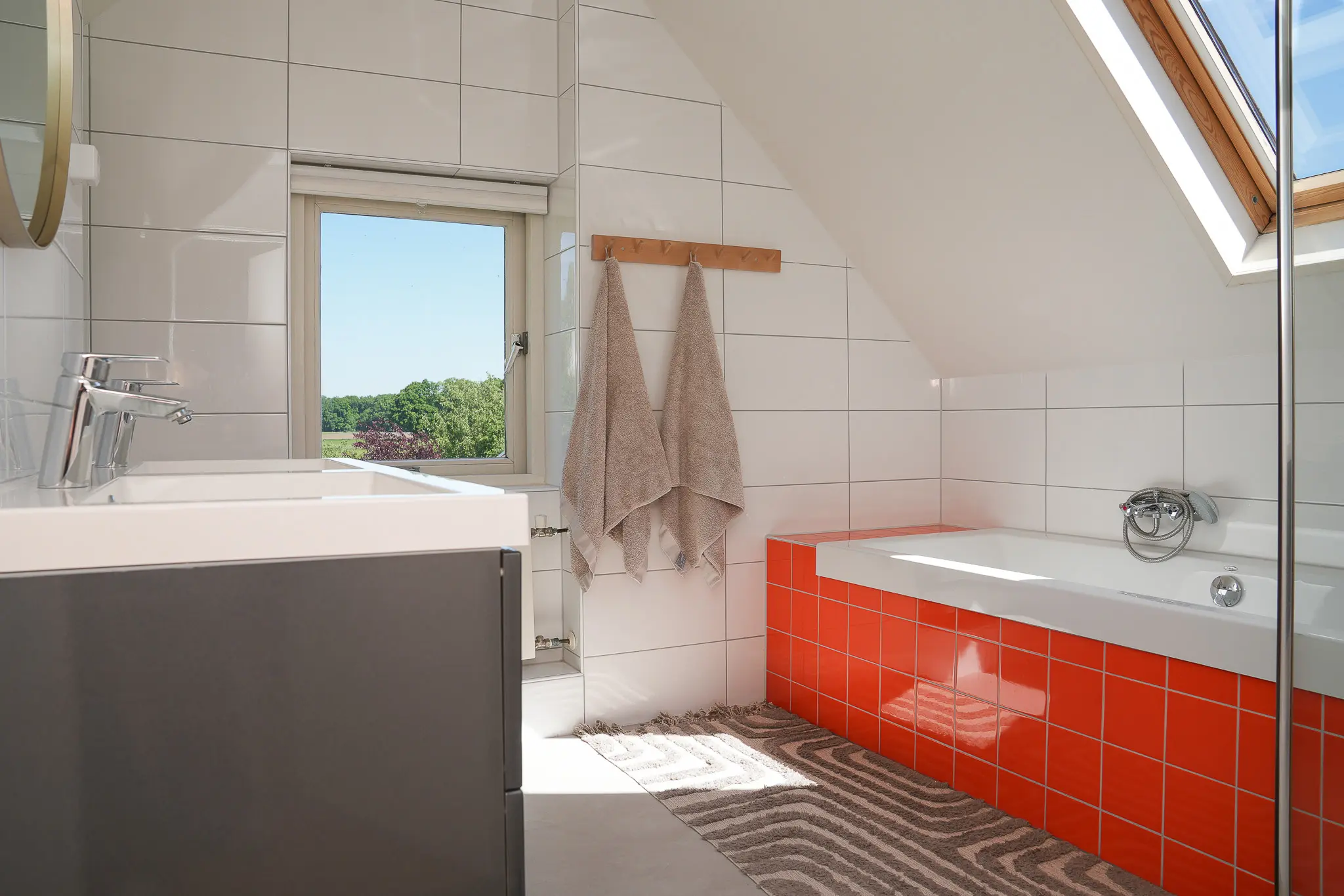De vier slaapkamers en twee badkamers in de hoofdwoning bieden volop ruimte voor het hele gezin. De luxe badkamers zijn voorzien van een duobad, ruime regendouche en dubbele wastafel – perfect om even helemaal tot rust te komen.