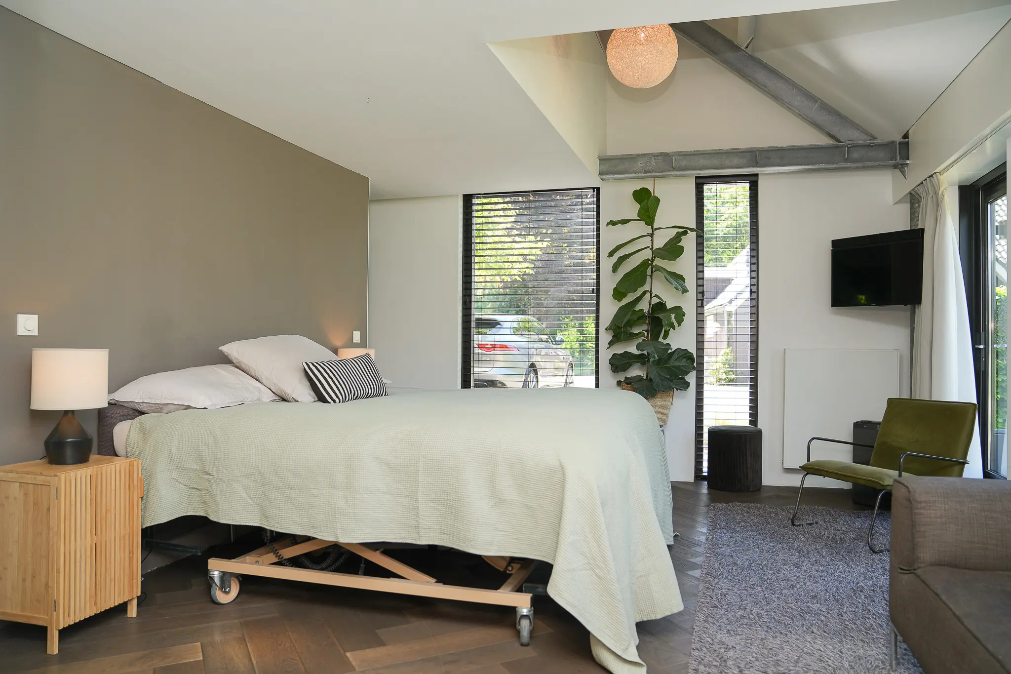 Het bijgebouw heeft een eigen entree en biedt drie slaapkamers, een moderne open keuken met VT wonen-tegelwerk en een stijlvolle badkamer ensuite. De donkere kleurstelling en luxe afwerking geven het geheel een chique uitstraling. Dankzij de indeling op de begane grond is het bijgebouw ideaal als zorgwoning, studio of gastenverblijf.
