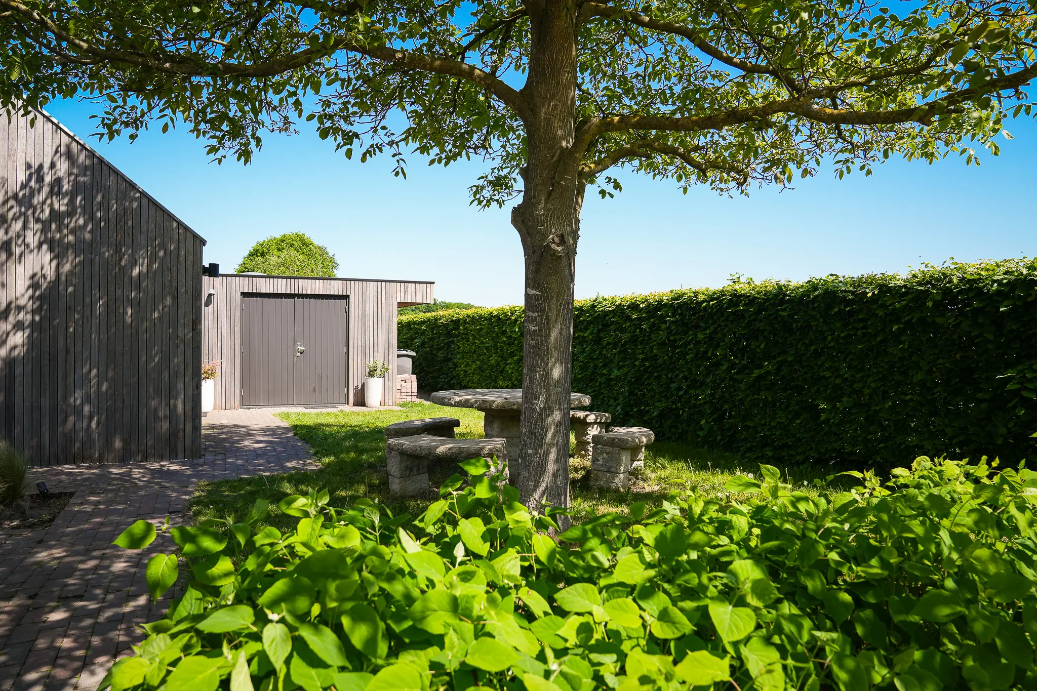 De tuin is een waar landgoed: een natuurlijke zwemvijver met zelfreinigend systeem, volwassen bomen, een kas voor je eigen moestuin en volop ruimte voor kinderen om te spelen. Of je nu wilt ontspannen op de veranda, een duik neemt in het zwembad, of samenkomt met vrienden en familie op het terras – hier beleef je het buitenleven in optima forma.