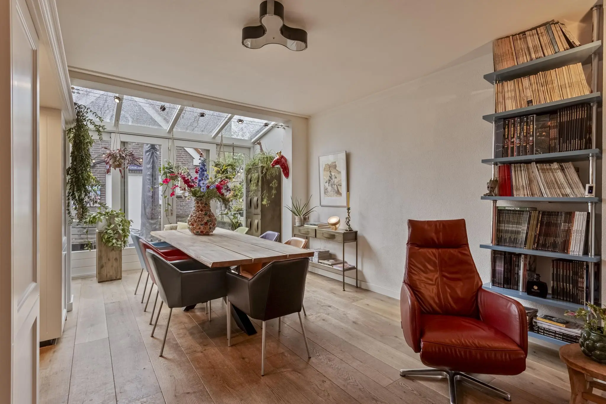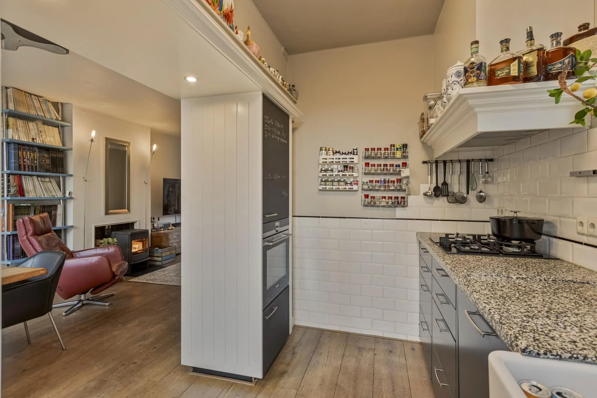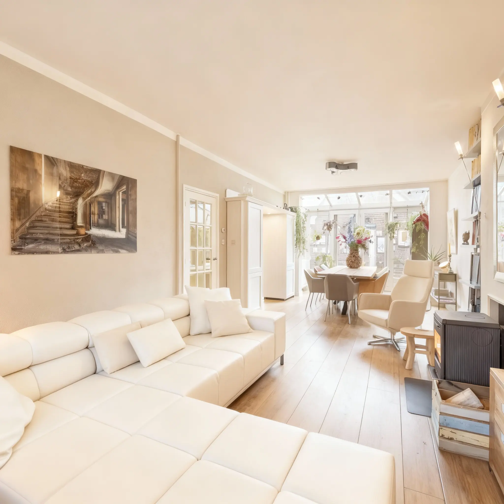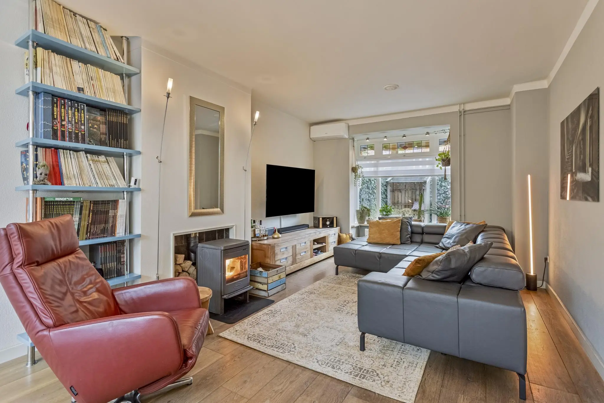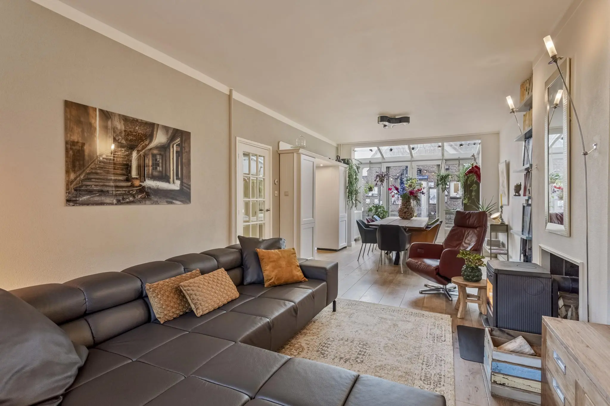 De hoofdwoning heeft een lichte woonkamer met een authentieke erker en glas-in-loodramen. Aan de achterzijde is de woning uitgebouwd met een glazen dak en houten kozijnen, wat zorgt voor veel licht en een natuurlijke verbinding met de tuin. De woonkamer is voorzien van een houtkachel en airconditioning. De moderne keuken is strak afgewerkt en uitgerust met inbouwapparatuur.