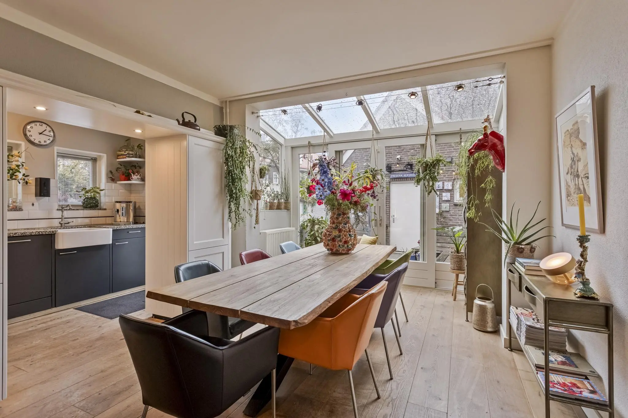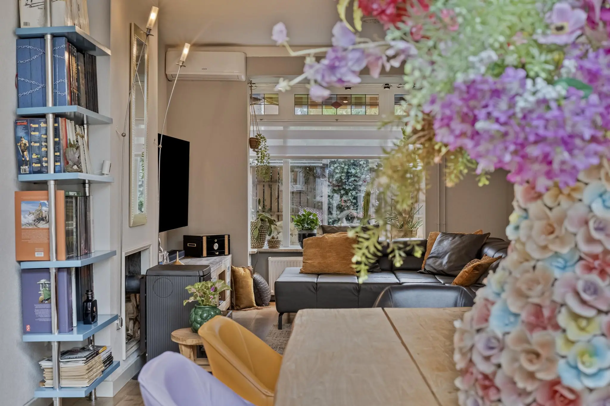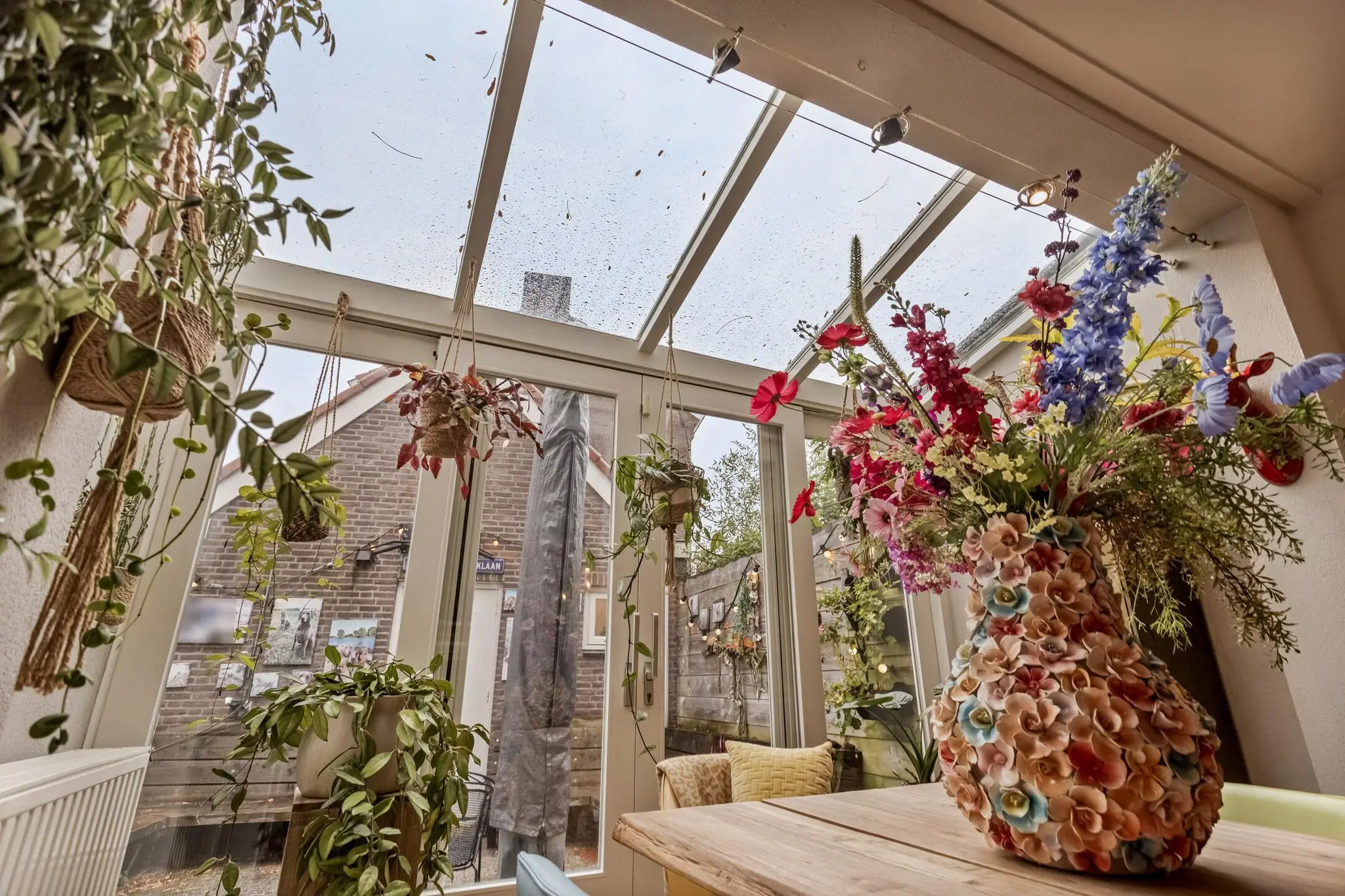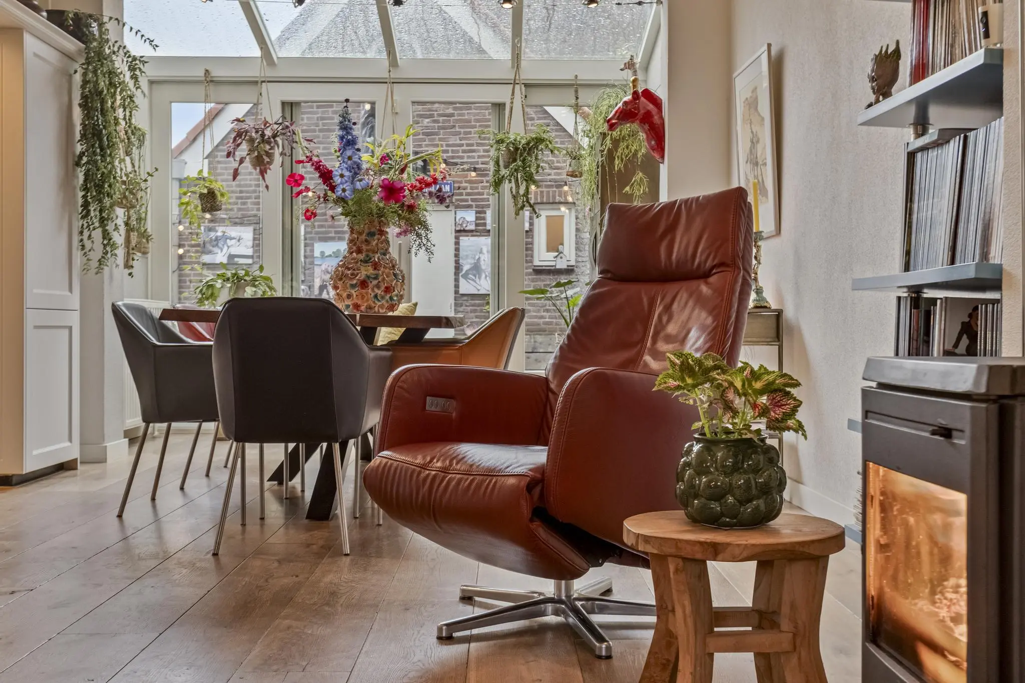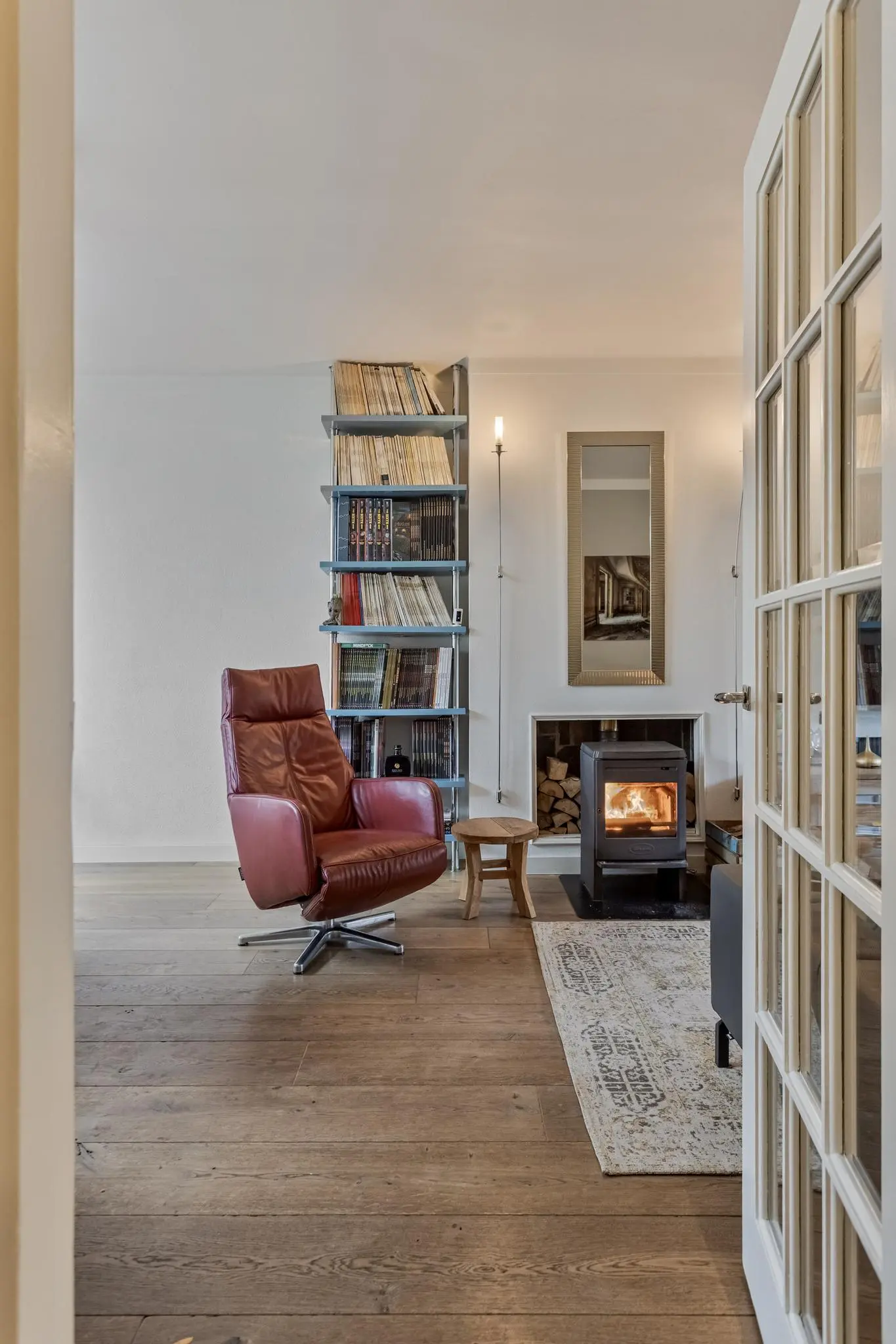 De hoofdwoning heeft een lichte woonkamer met een authentieke erker en glas-in-loodramen. Aan de achterzijde is de woning uitgebouwd met een glazen dak en houten kozijnen, wat zorgt voor veel licht en een natuurlijke verbinding met de tuin. De woonkamer is voorzien van een houtkachel en airconditioning. De moderne keuken is strak afgewerkt en uitgerust met inbouwapparatuur.