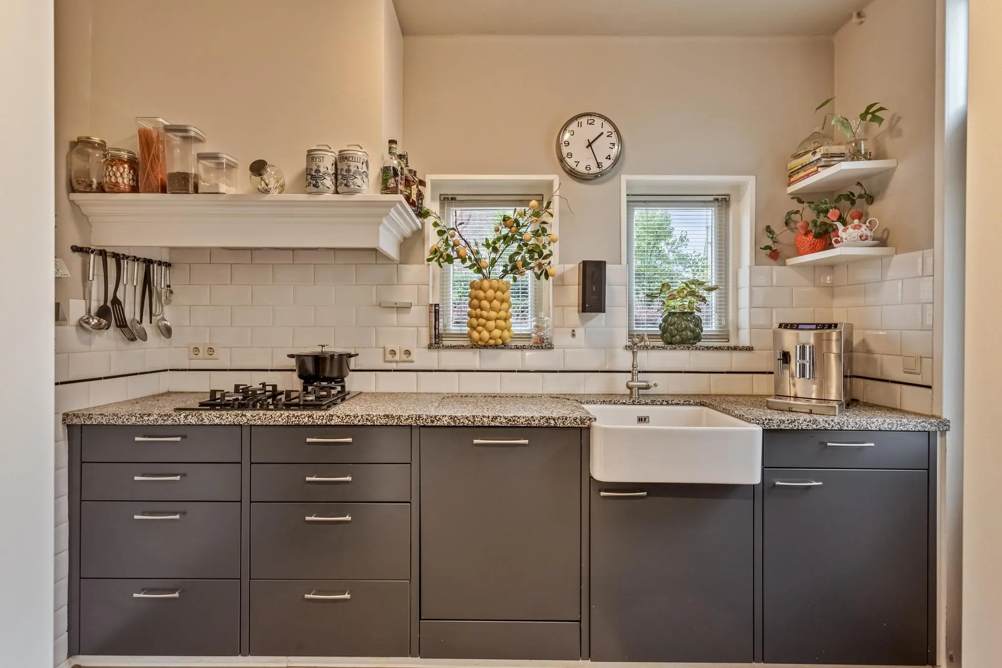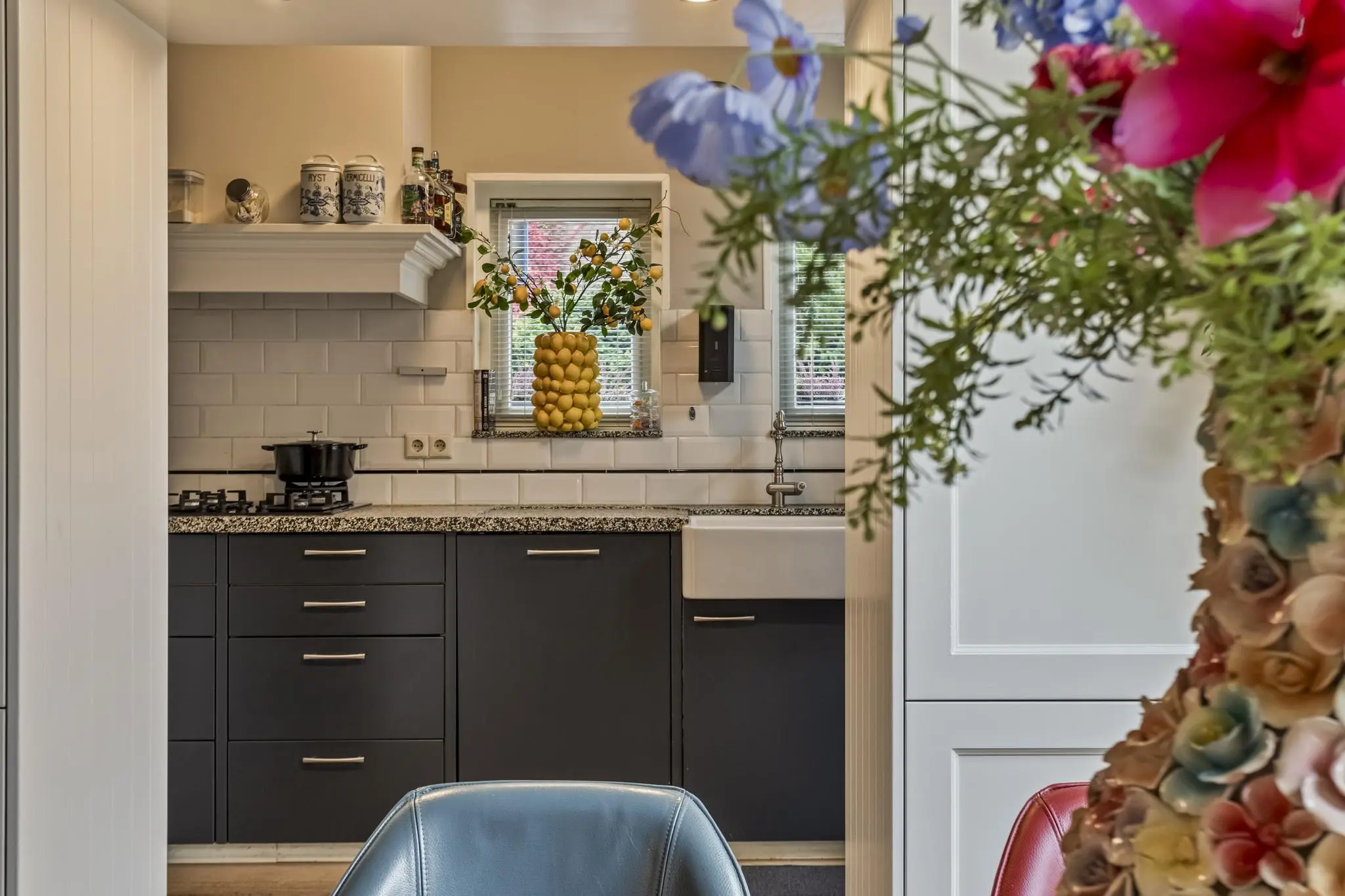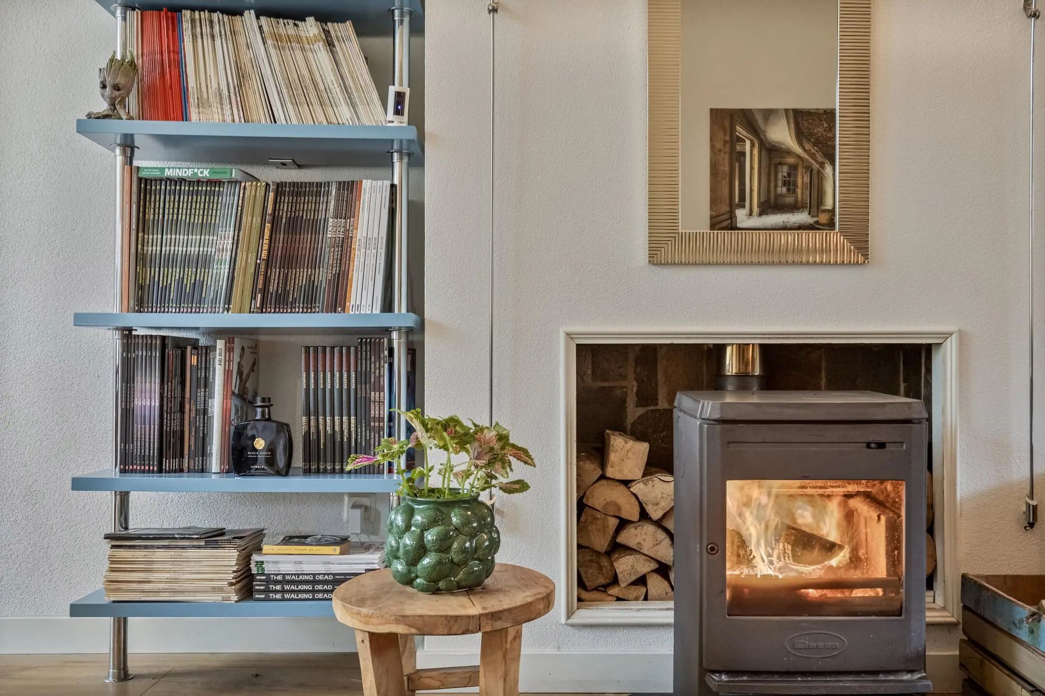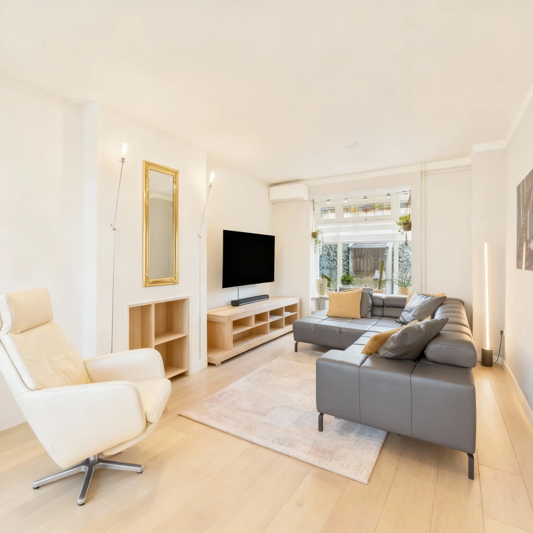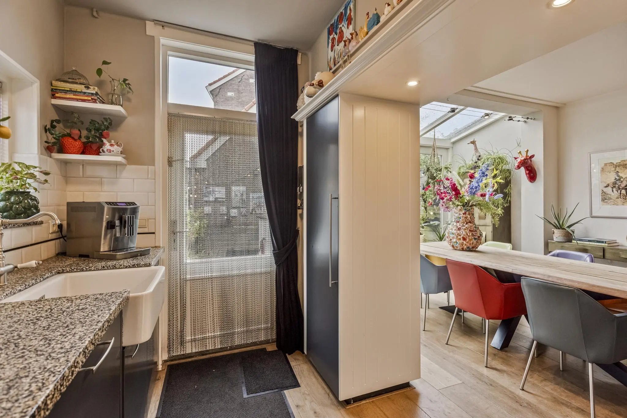 De hoofdwoning heeft een lichte woonkamer met een authentieke erker en glas-in-loodramen. Aan de achterzijde is de woning uitgebouwd met een glazen dak en houten kozijnen, wat zorgt voor veel licht en een natuurlijke verbinding met de tuin. De woonkamer is voorzien van een houtkachel en airconditioning. De moderne keuken is strak afgewerkt en uitgerust met inbouwapparatuur.