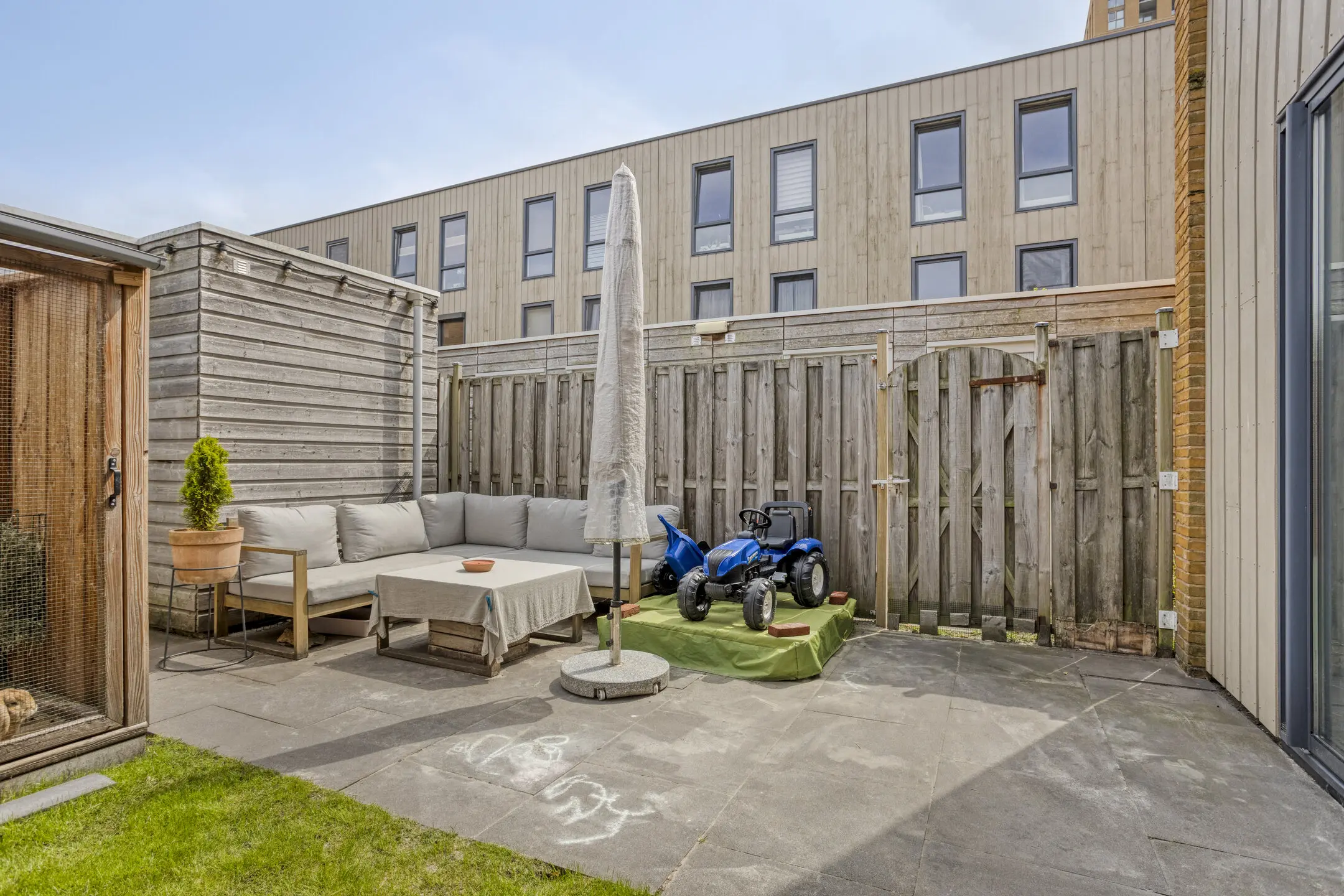 De achtertuin, gelegen op het noordwesten, is verzorgd aangelegd met bestrating en groenborders. Een heerlijke plek om te ontspannen, te borrelen of gezellig te barbecueën. Vanuit de tuin heb je toegang tot de berging en het achterpad dat leidt naar de privéparkeerplaats.