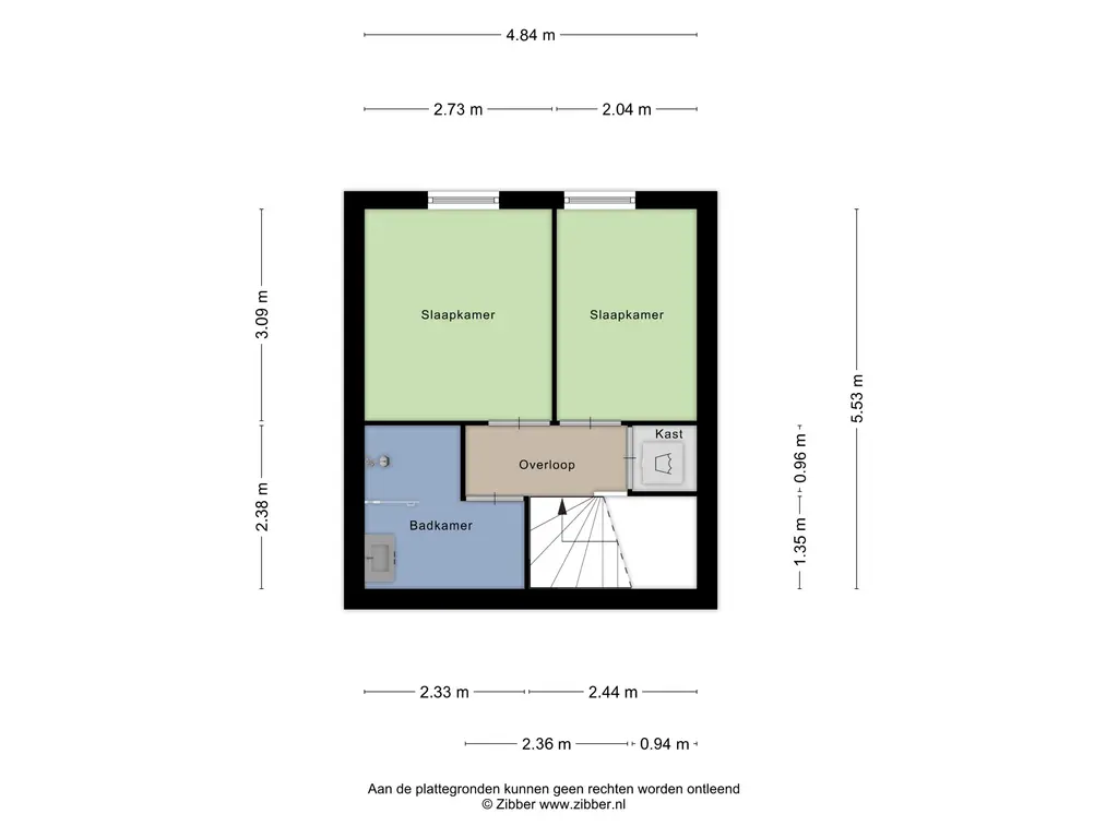 De overloop geeft toegang tot twee slaapkamers en de moderne badkamer, uitgerust met een inloopdouche, en wastafel. Op de overloop bevindt zich tevens een praktische vaste kast met de opstelplaats voor de wasmachine.