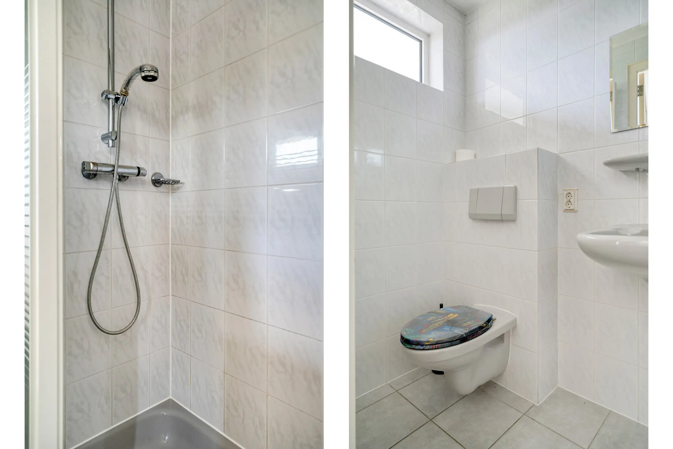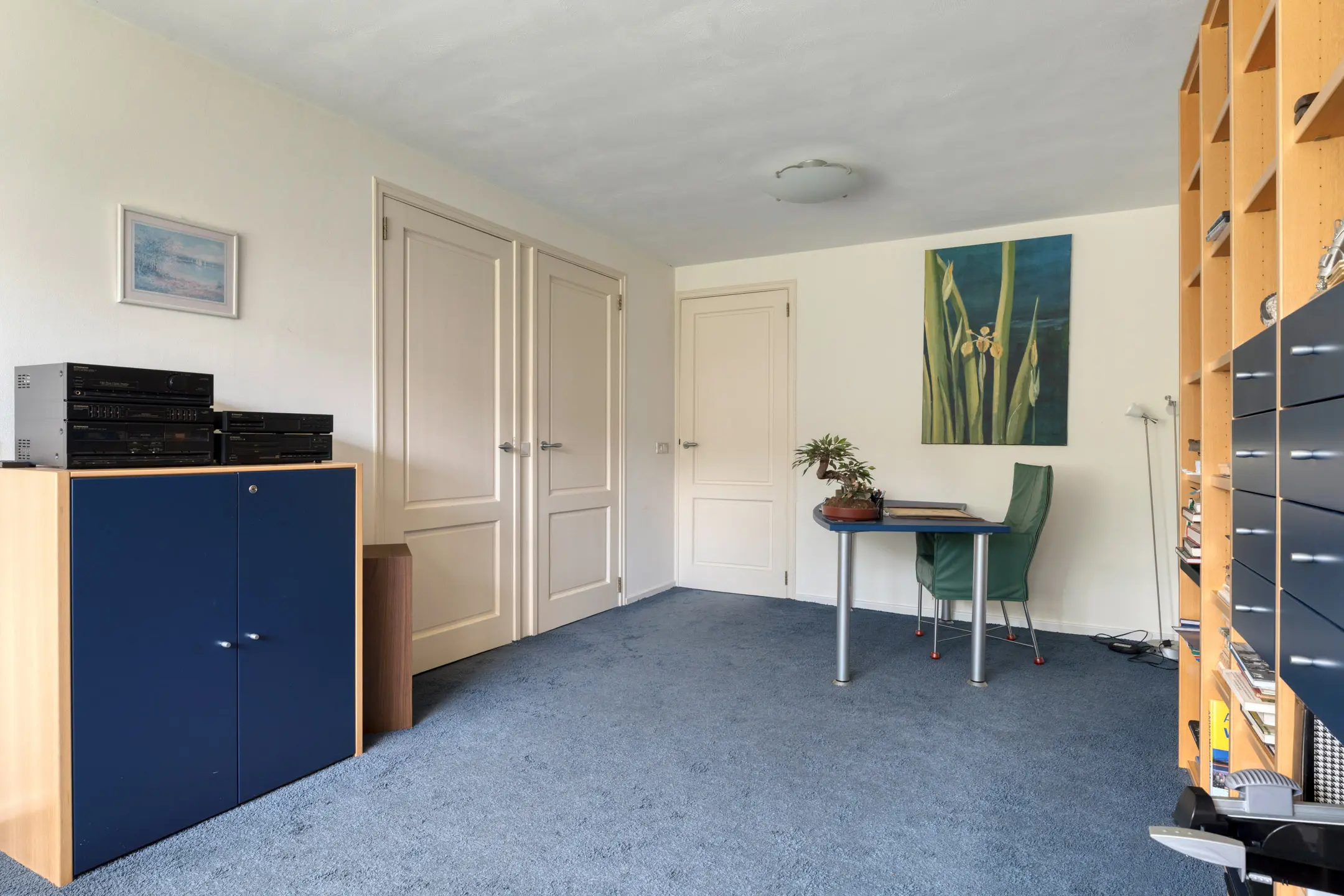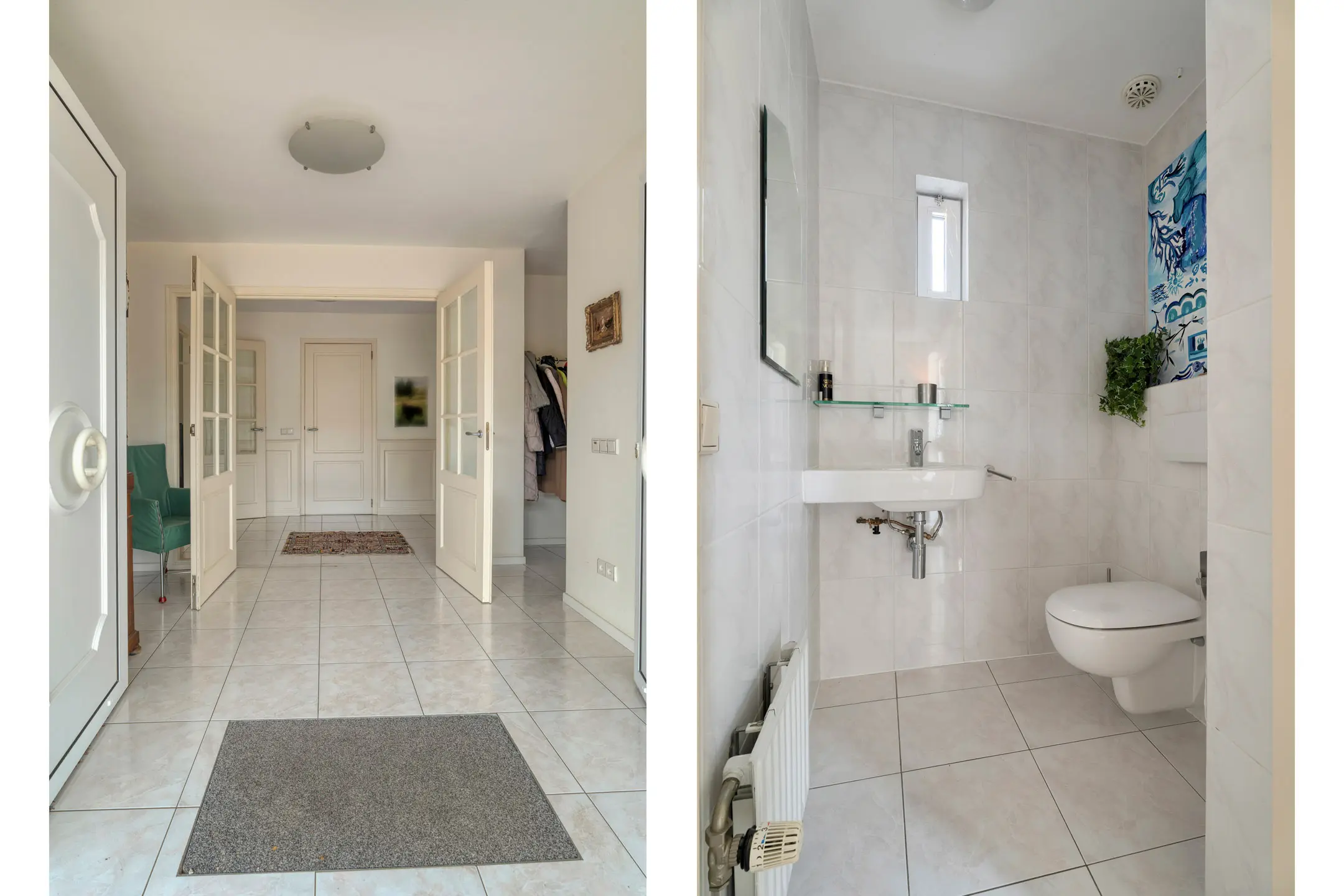 Bij binnenkomst wordt u verwelkomd in een ruime hal met toegang tot het toilet en de garderobe, die tevens de meterkast herbergt. Vanuit deze hal heeft u toegang tot een tweede hal, die op zijn beurt leidt naar de woonkamer, een ruime bergruimte en een gang naar de slaapvertrekken. Dankzij de speelse en open indeling en de vele grote ramen is de woning bijzonder licht. Alle vertrekken bevinden zich op de begane grond, wat bijdraagt aan de toegankelijkheid en het comfort van deze woning.
