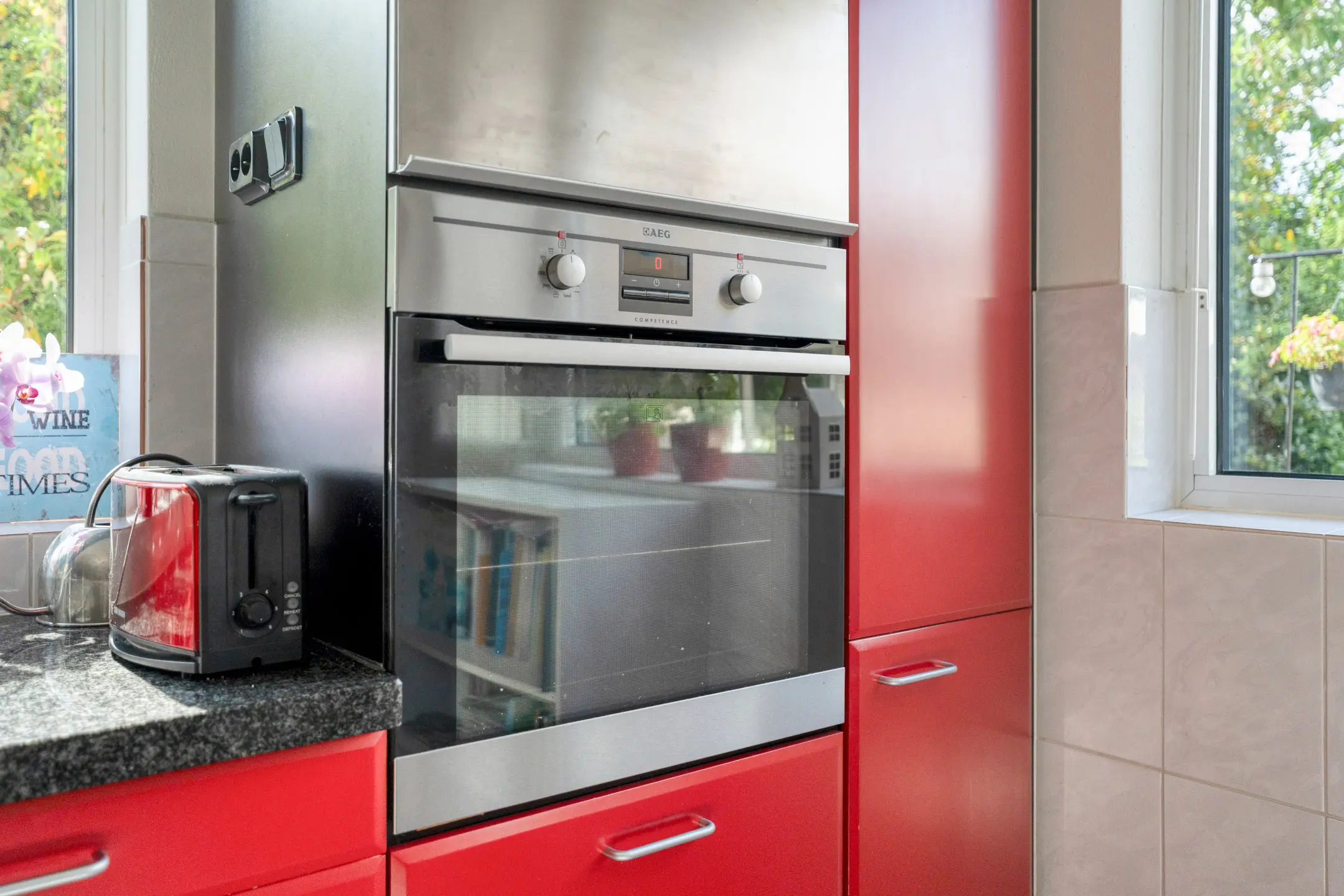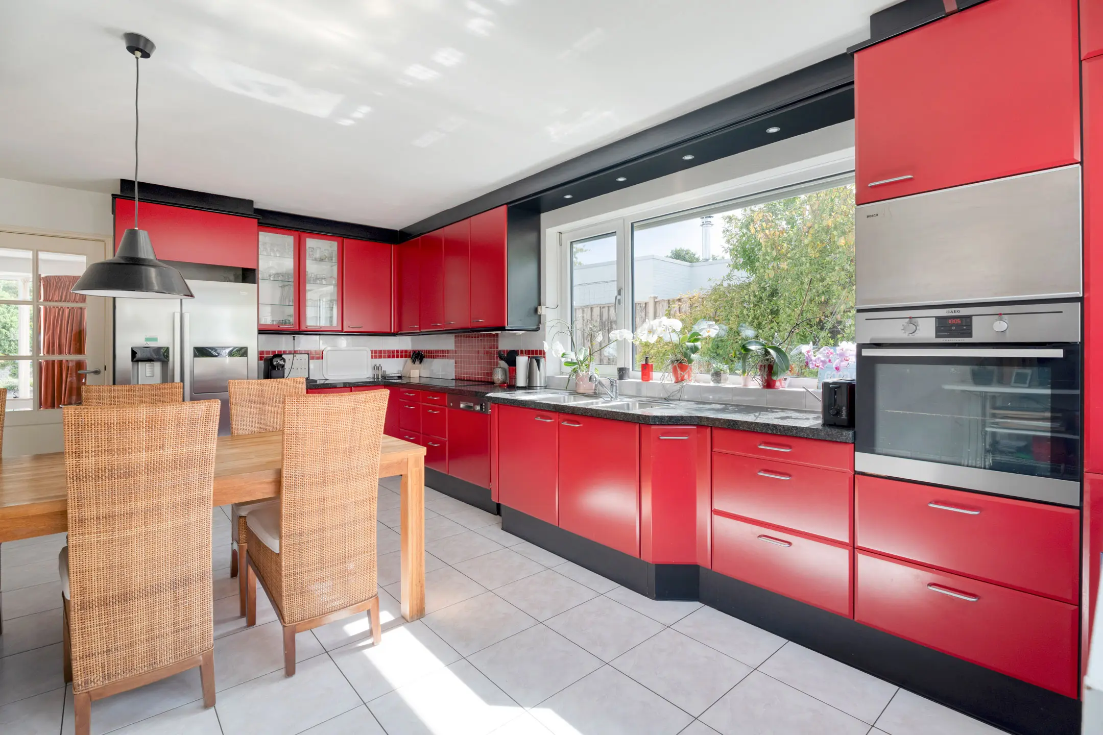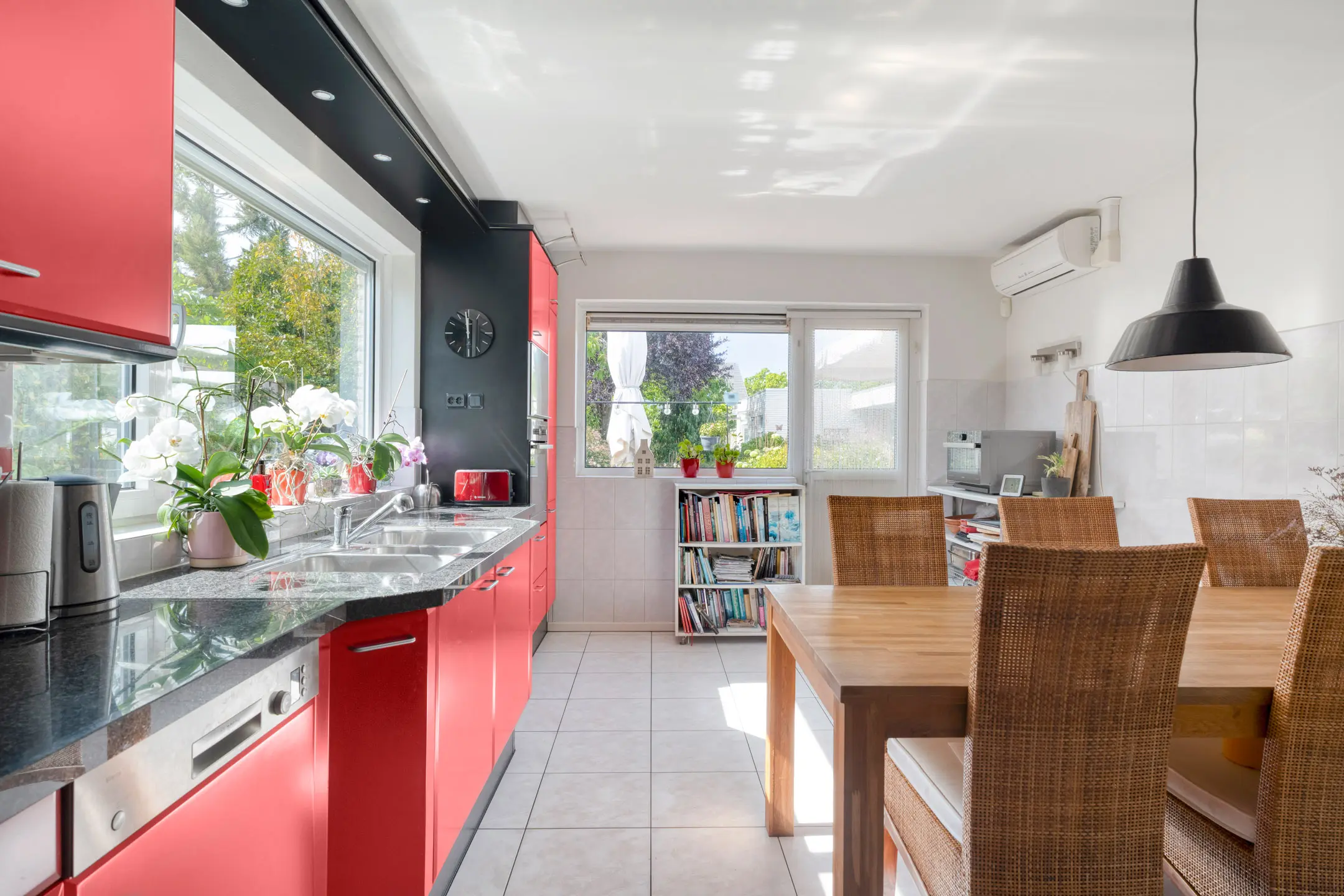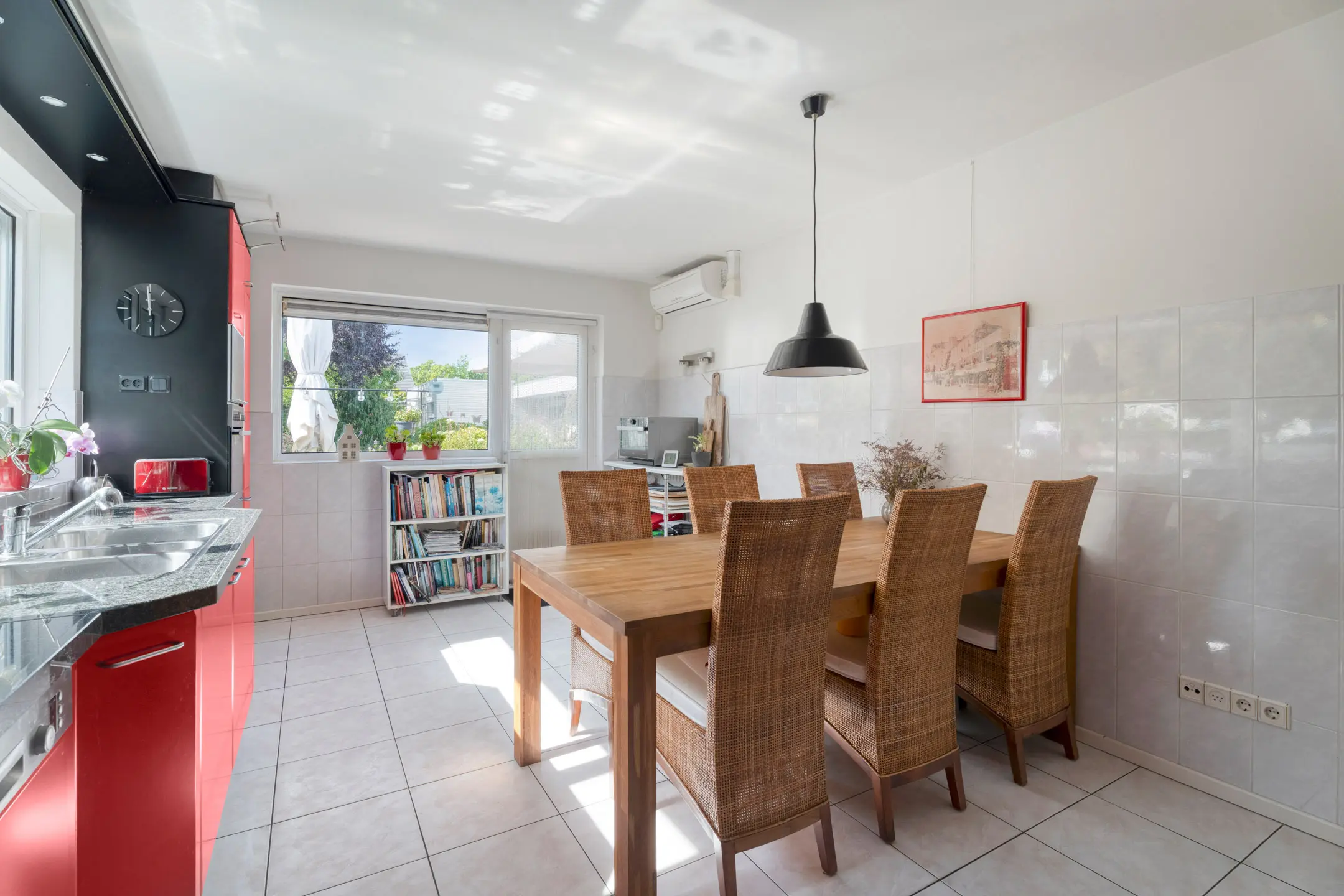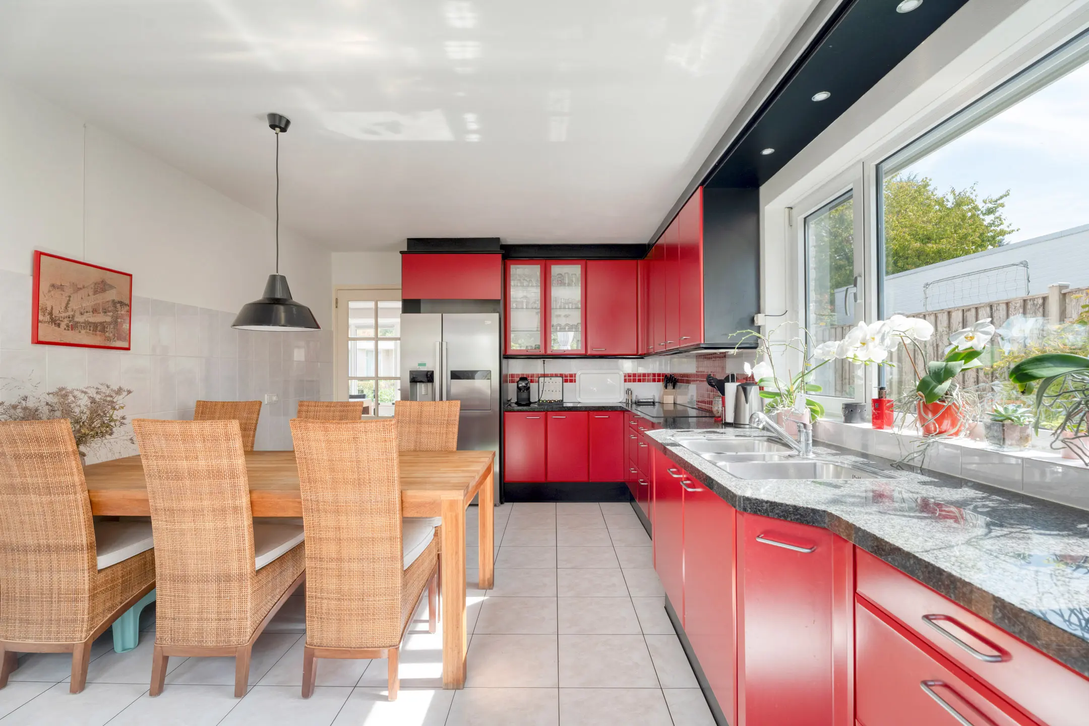 De ruime, moderne keuken is voorzien van een opvallende rode kleurstelling en is uitgerust met hoogwaardige inbouwapparatuur, zoals een vaatwasser, oven, inductieplaat, dubbele gootsteen, inbouwkoelkast, en een inbouwafzuigkap. Het raam boven het aanrechtblad biedt een prachtig uitzicht op de tuin, wat koken hier tot een waar genoegen maakt. Bovendien is er voldoende ruimte voor een grote eettafel, zodat u samen met het gezin of vrienden kunt genieten van maaltijden in een open, gezellige sfeer.
