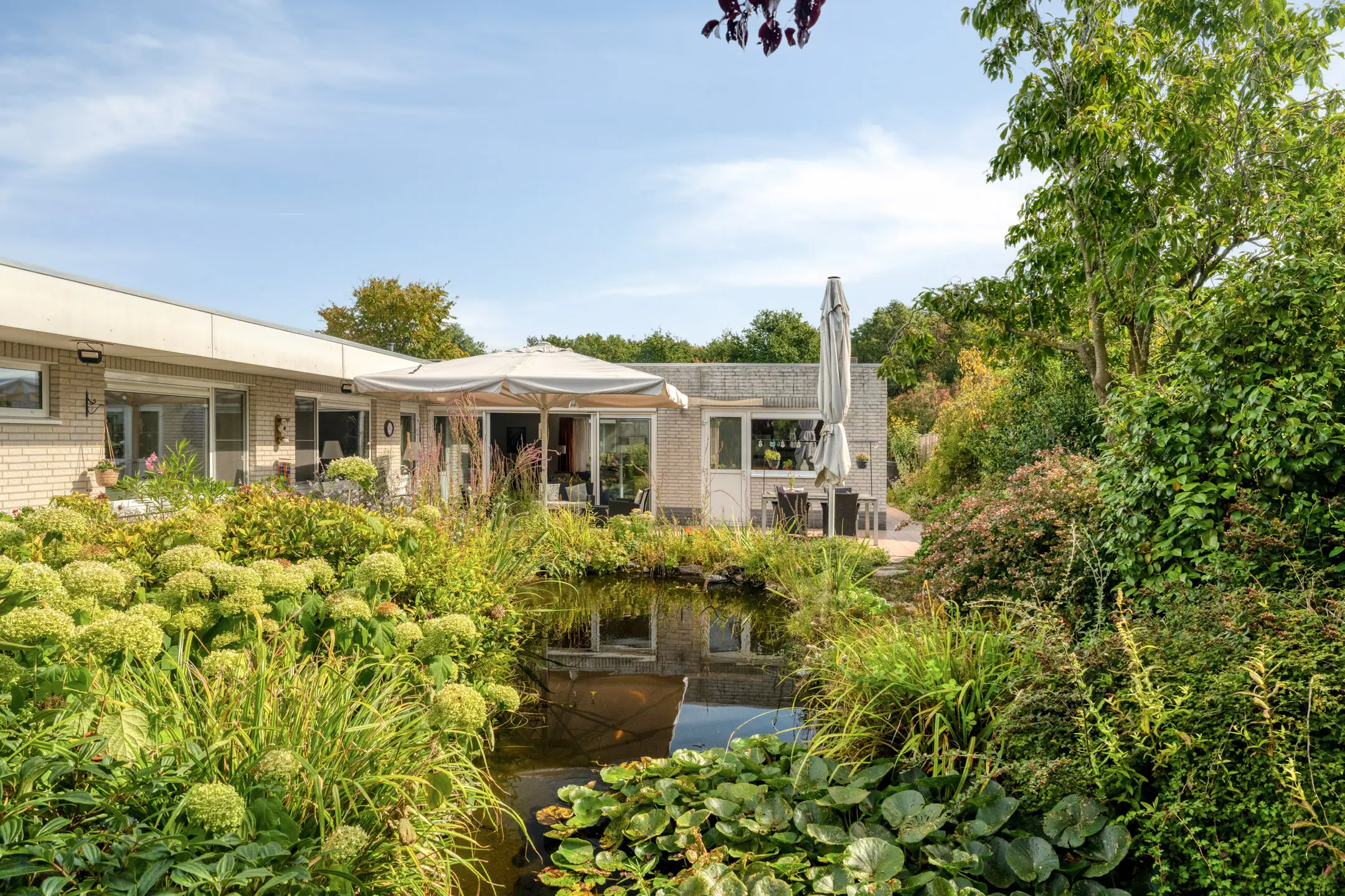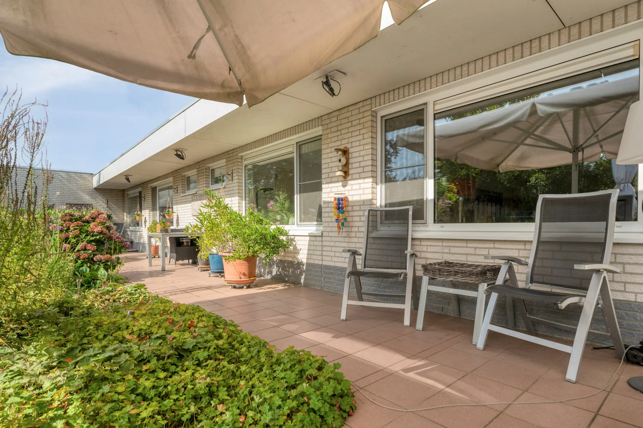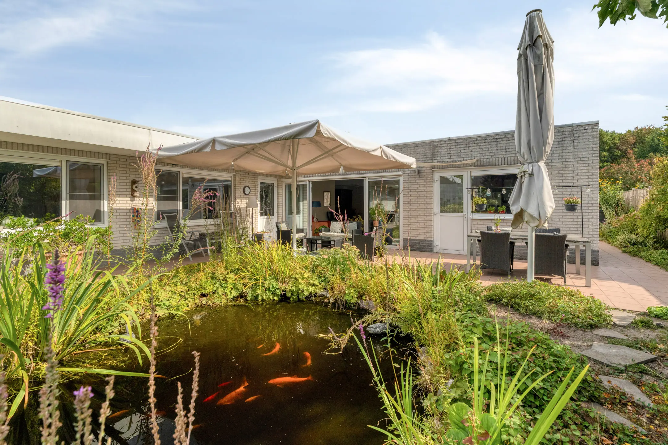 De buitenruimte is een ware oase van rust. De achtertuin is fraai aangelegd en biedt volop privacy. Het grote terras, voorzien van twee ingebouwde parasols van 4x4 meter, biedt aangename schaduw en is ideaal voor het buitenleven. De parasols zijn stevig in de grond verankerd en beschermen u tegen de zon. In het midden van de tuin vindt u een sierlijke vijver die zorgt voor een luxe uitstraling en een ontspannende sfeer. Dankzij de gunstige ligging kunt u hier vrijwel de hele dag genieten van de zon.
