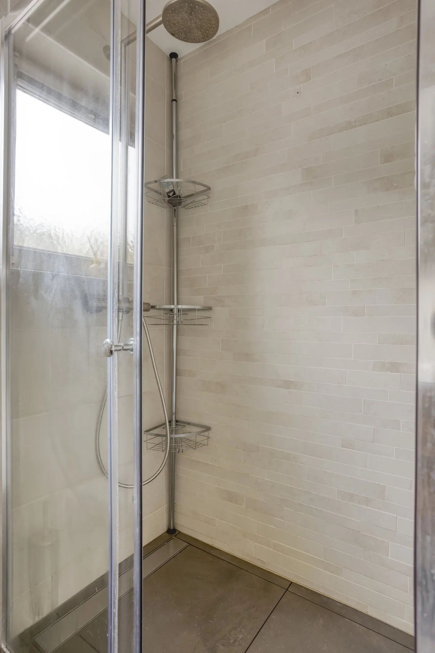 De keuken is modern en licht, uitgevoerd in een hoekopstelling met een mooi donker blad en voorzien van inbouwapparatuur. Er is bovendien ruimte voor een grote koel-vriescombinatie, waardoor je alles bij de hand hebt. Door de open verbinding met de woonkamer oogt de keuken extra ruim. Een raam boven de spoelbak biedt uitzicht naar buiten en laat het daglicht binnenstromen.