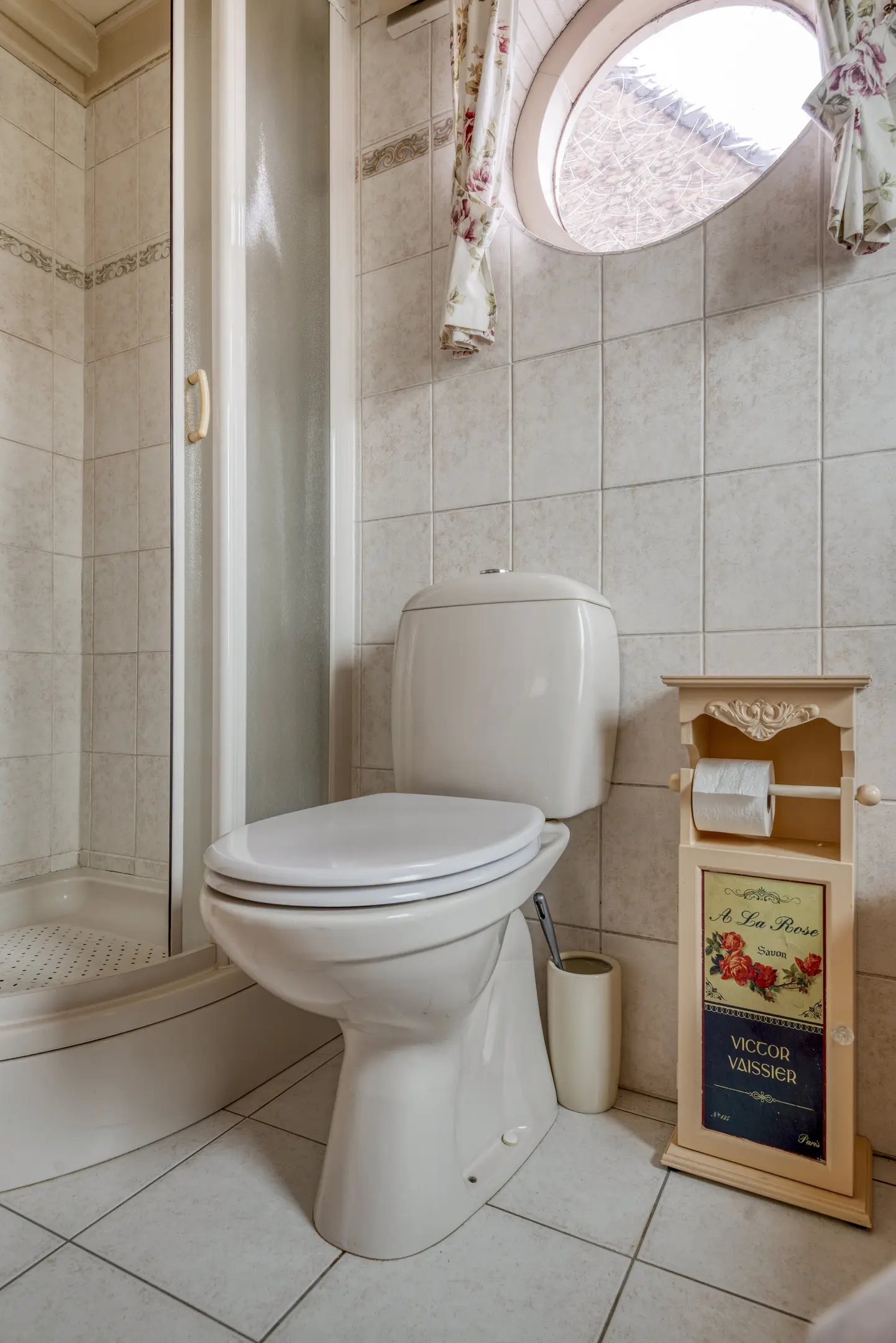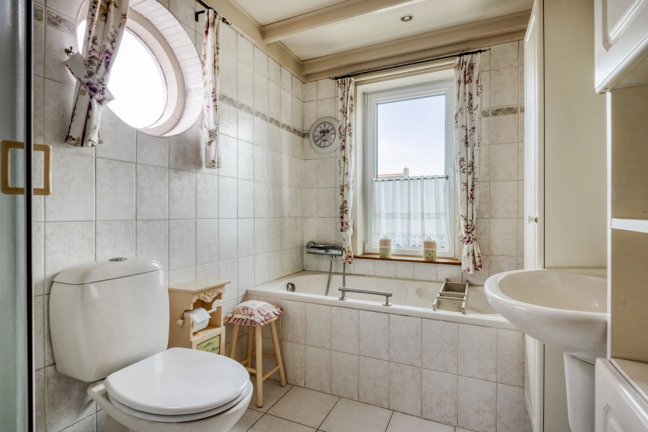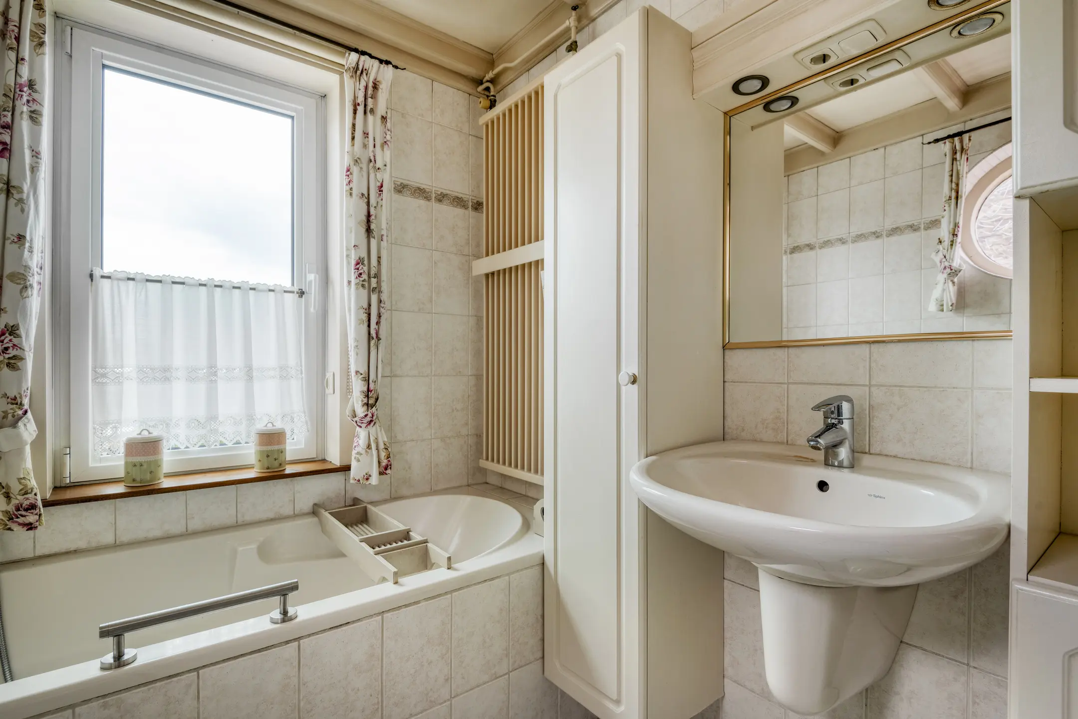 De badkamer is compleet uitgerust met ligbad, wastafel, toilet en douche.