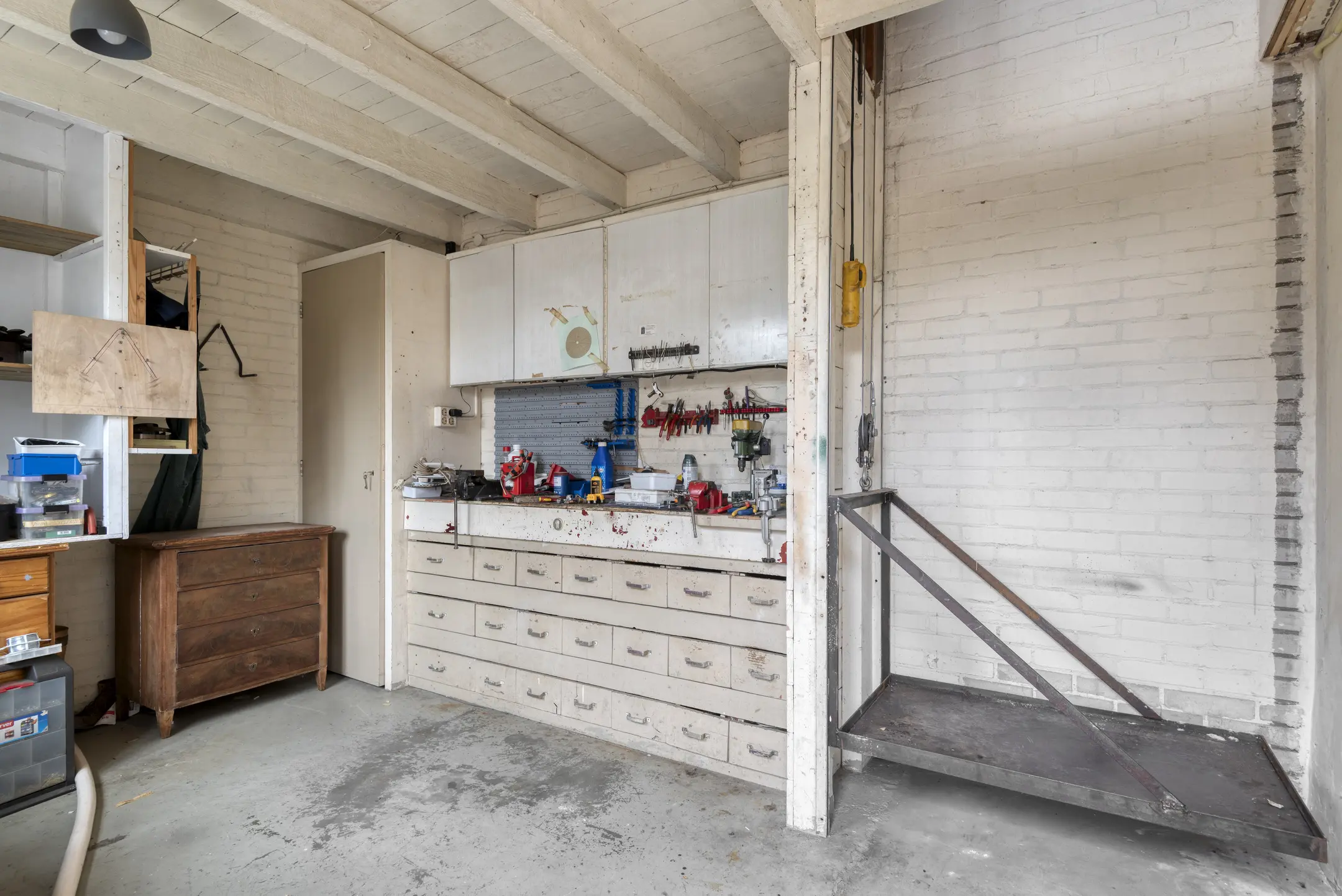 Vanuit de keuken bereikt u de aangebouwde garage, met daarachter een werk- of hobbyruimte. Via een lift is de vliering van de garage bereikbaar voor extra opslag.