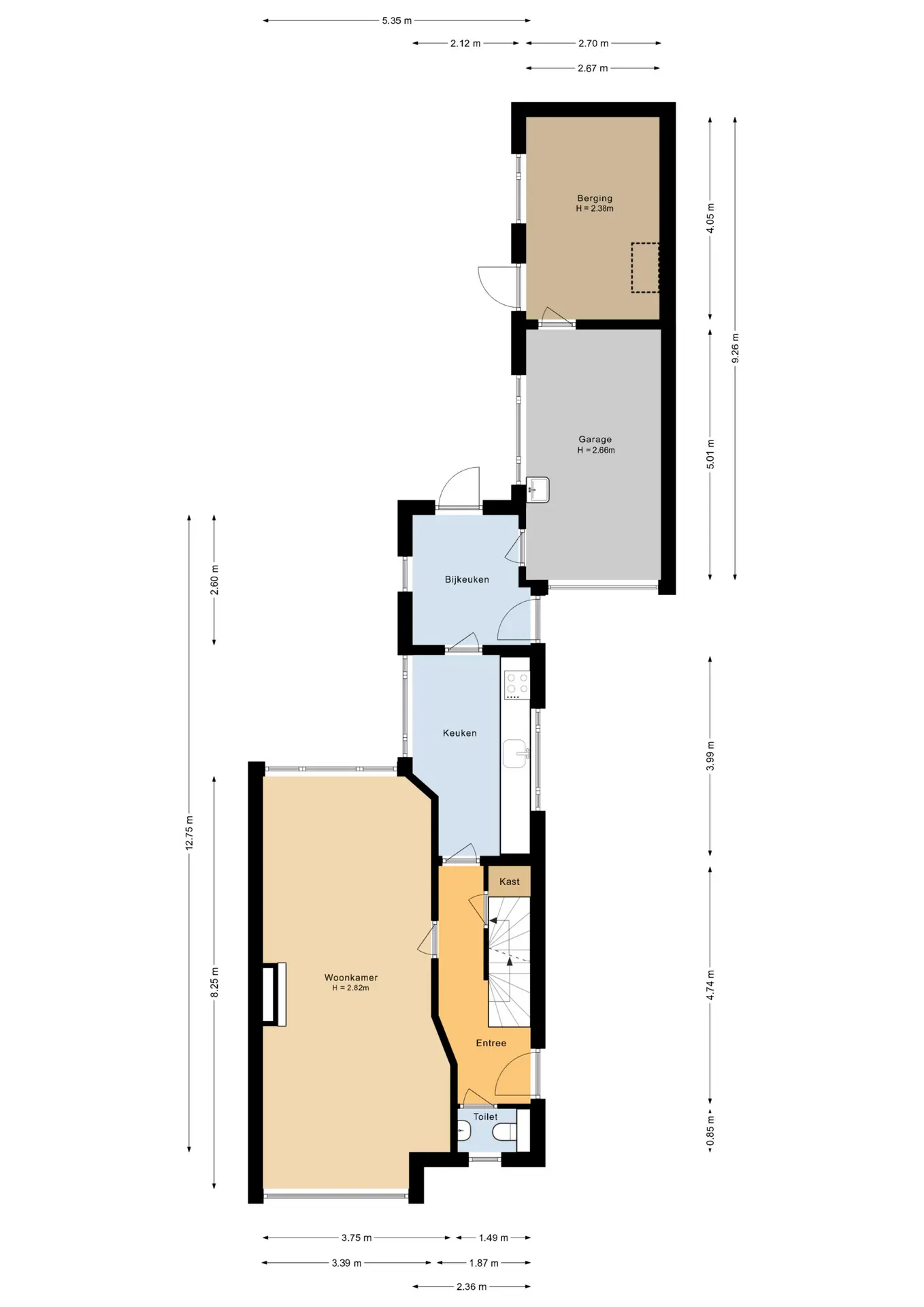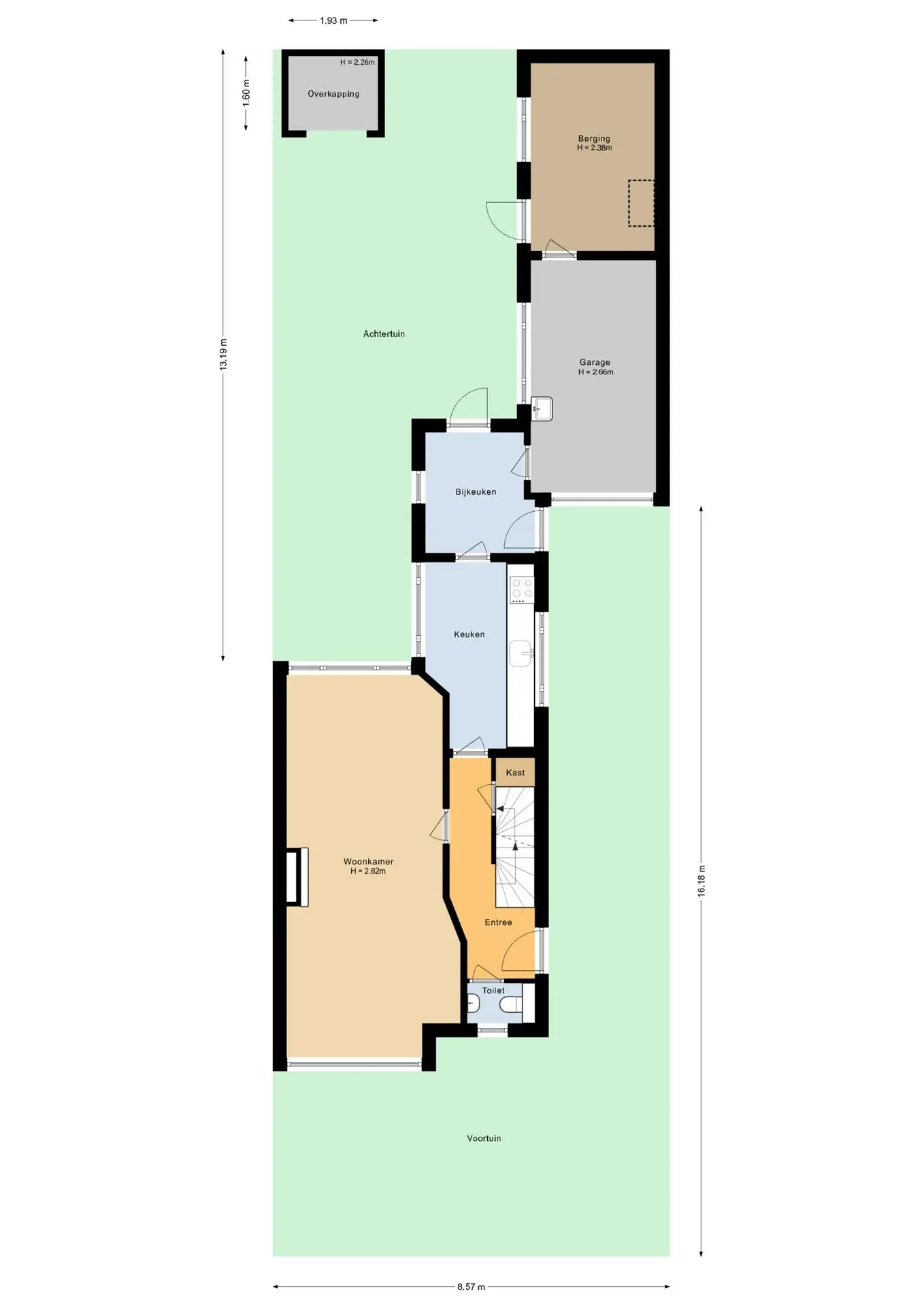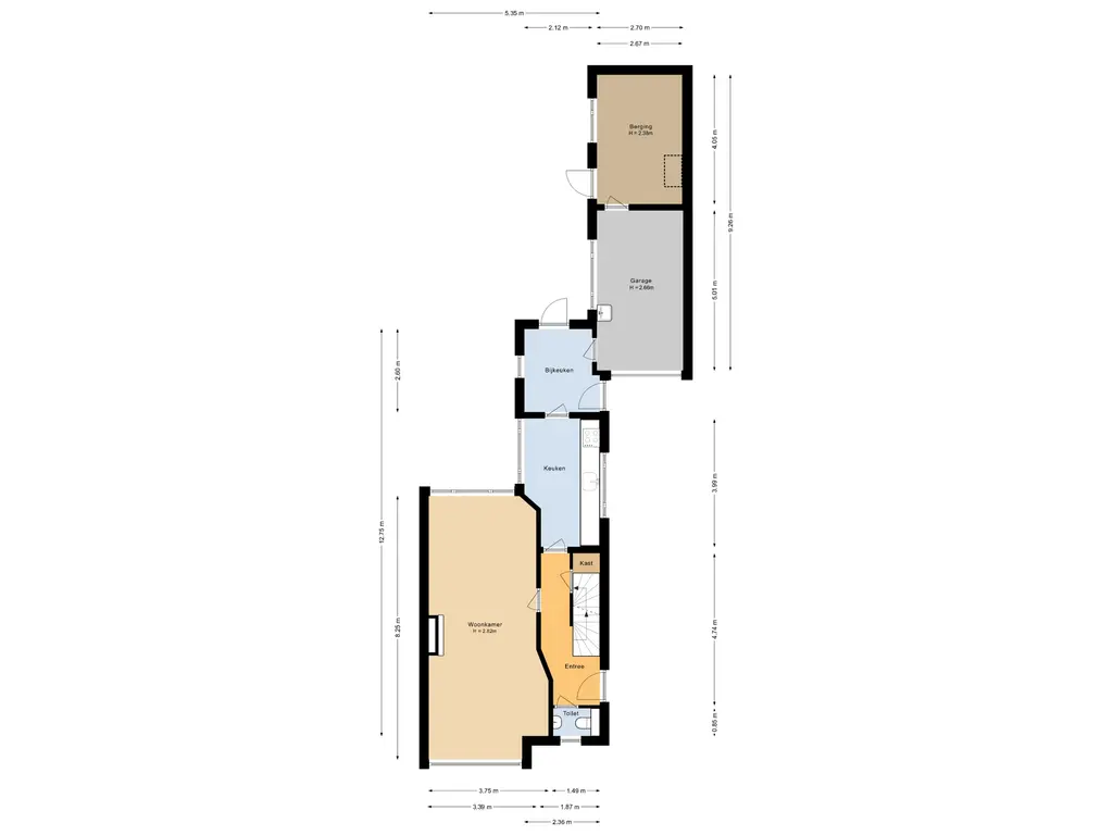 U betreedt de woning via de hal met toilet, trapopgang en toegang tot de kelder. Vanuit de hal komt u in de royale woonkamer. Met aan de voorkant zicht op de Heezerweg en vanuit de achterkant kijkt u uit op de achtertuin.