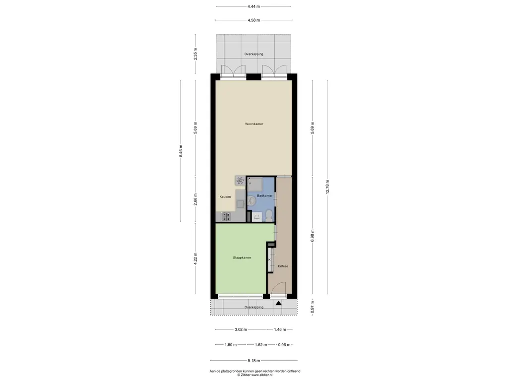 Je betreedt de woning via een eigen overdekte entree aan de voorzijde van het complex, waardoor je niet via een centrale hoofdingang hoeft. Direct binnen kom je in een lange gang met laminaatvloer en praktische inbouwkasten. Vanuit deze gang zijn de slaapkamer, badkamer en woonkamer bereikbaar.