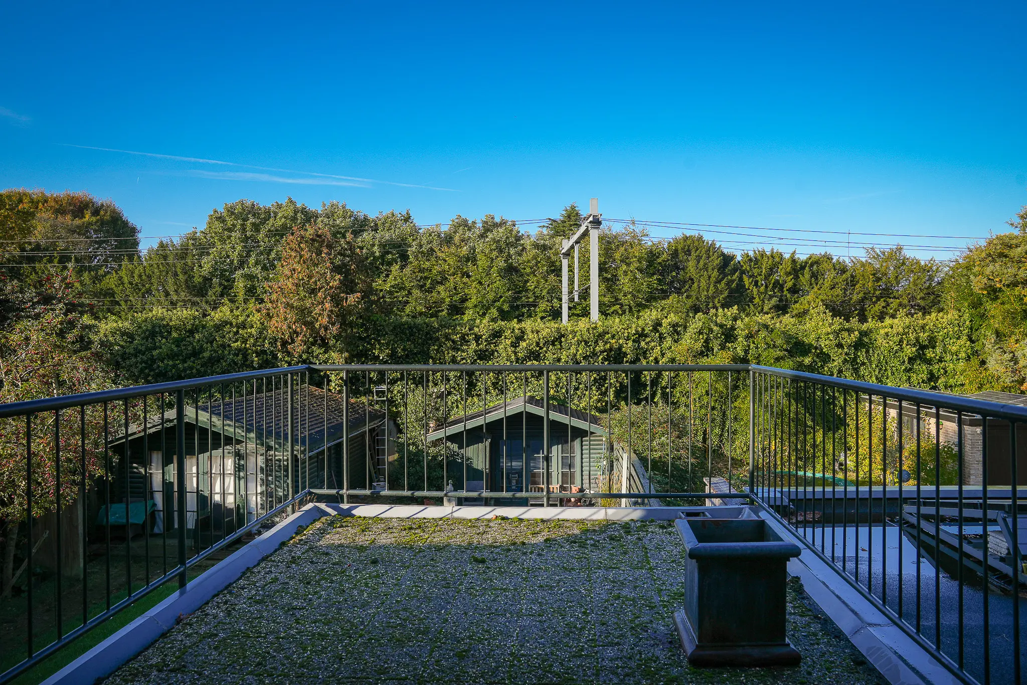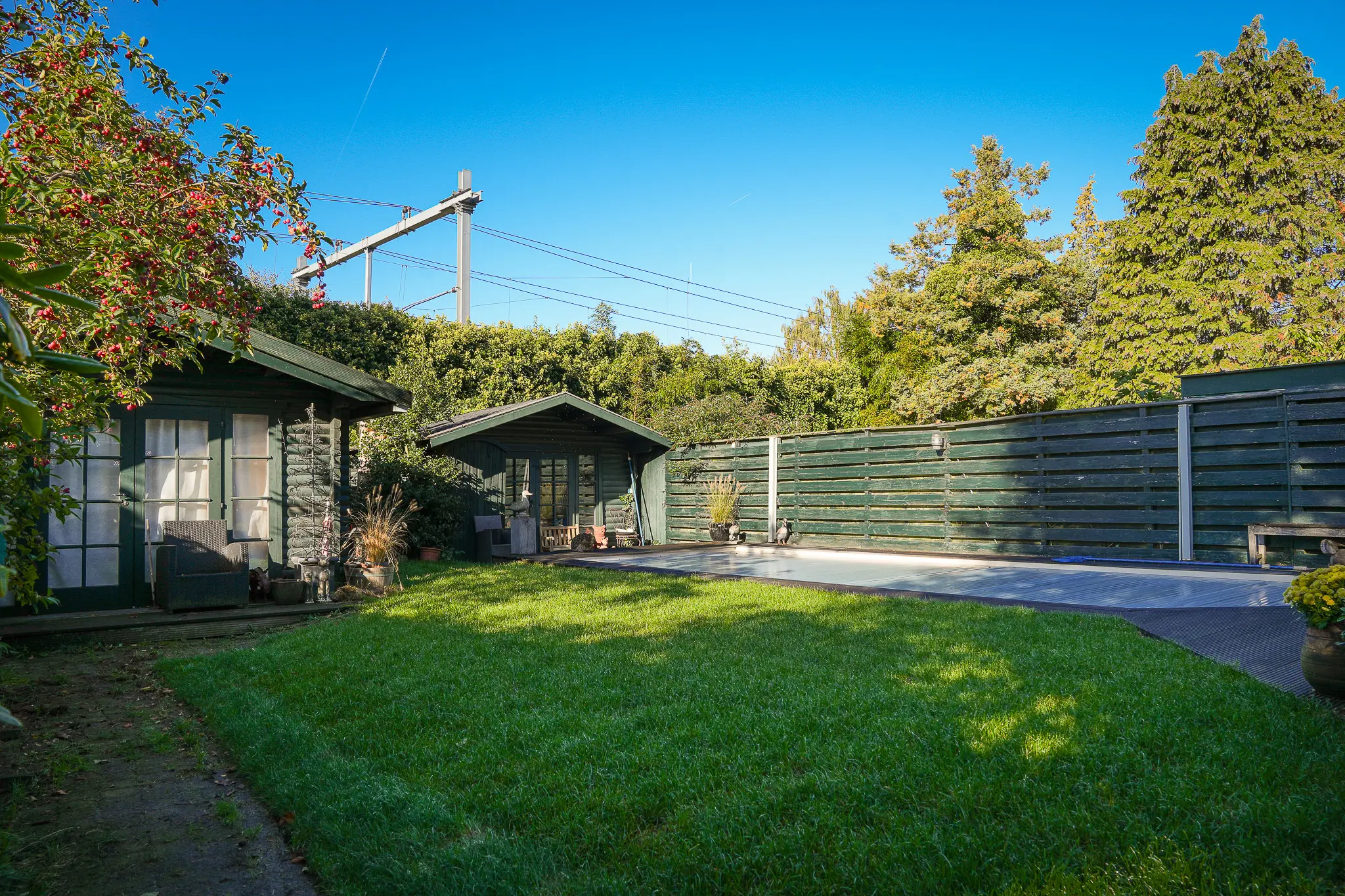 De achtertuin is werkelijk een verlengstuk van het woongenot. Gelegen op het zuiden, met volop zon en privacy, een zwembad en een jacuzzi als echte blikvangers. Het zwembad is voorzien van een elektrisch bedienbare solardek, pomphuis met glasfilterinstallatie en verlichting. Daarnaast zijn er meerdere zitgedeeltes en twee tuinhuisjes, het grote tuinhuis kan gebruikt worden als kantoorruimte, deze beschikt over een eigen toilet, wateraansluiting en een eigen verwarmingsketel (2020). Het kleinere tuinhuis is voorzien van opslagruimte en de 5 persoons jacuzzi. De oprit aan de voorzijde biedt ruimte voor twee auto’s.