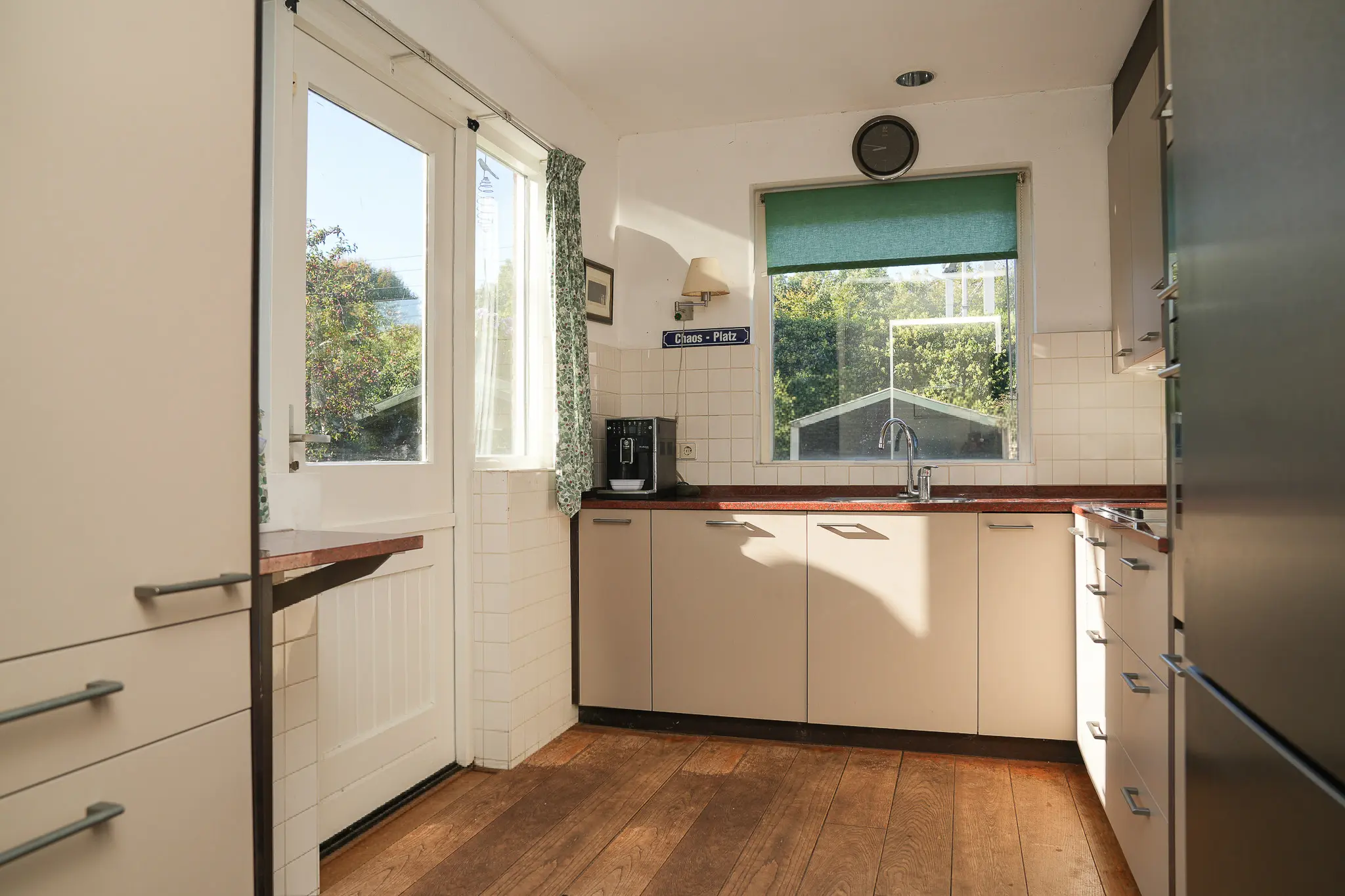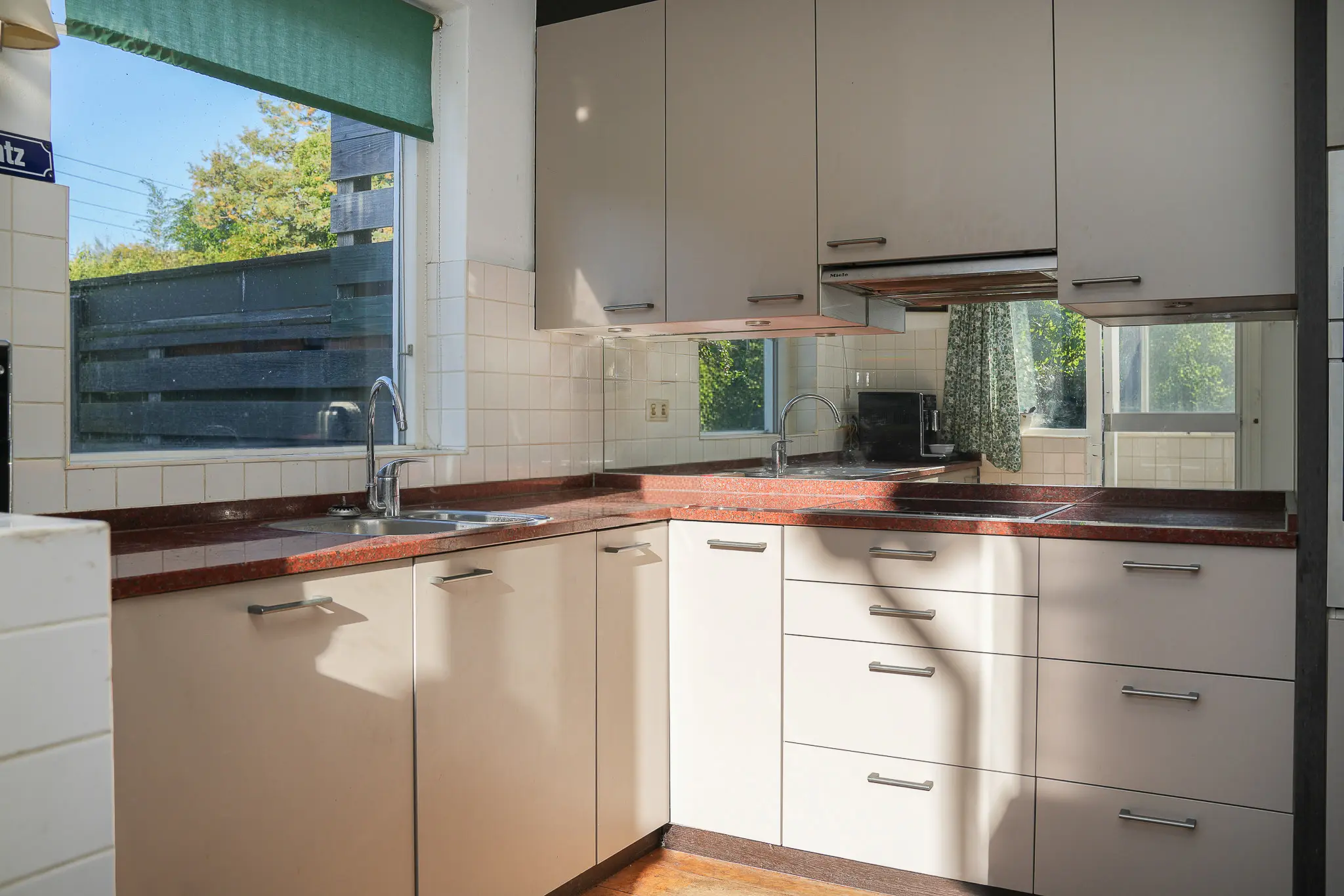 Aan de achterzijde ligt de keuken, uitgevoerd in taupe met een gemêleerd granieten werkblad. Voorzien van alle benodigde inbouwapparatuur, waaronder een keramische kookplaat, oven en steamer en toegang tot het terras. De praktische indeling en directe verbinding met de eethoek maken dit een heerlijke plek om samen te koken en te tafelen. Via de schuifpui stap je zo de tuin in.