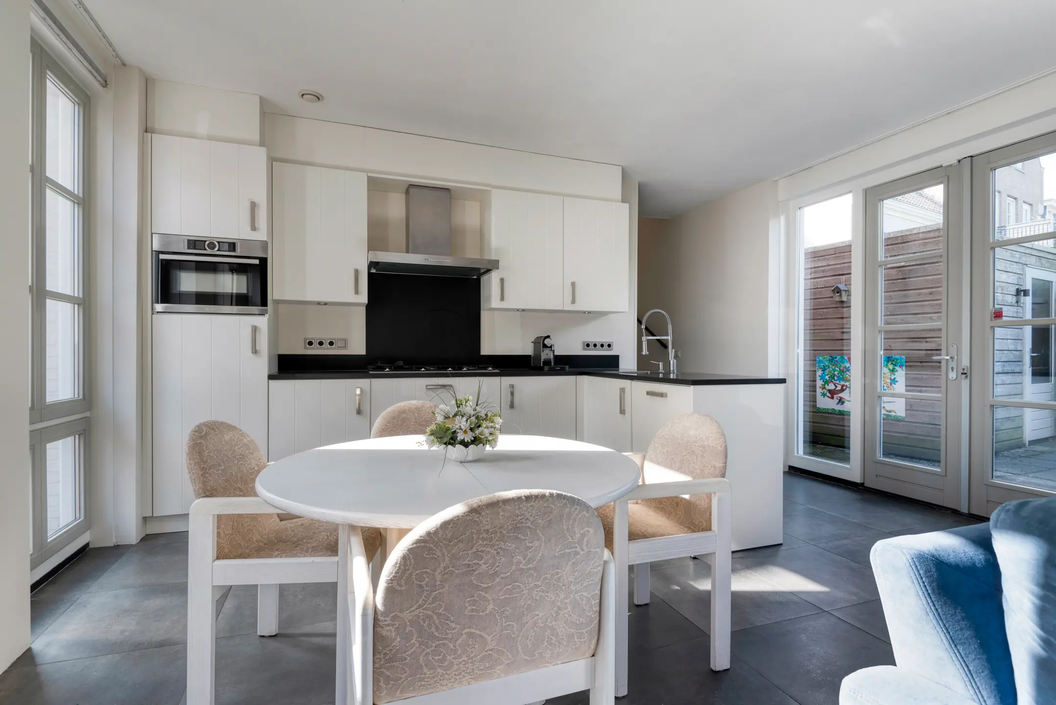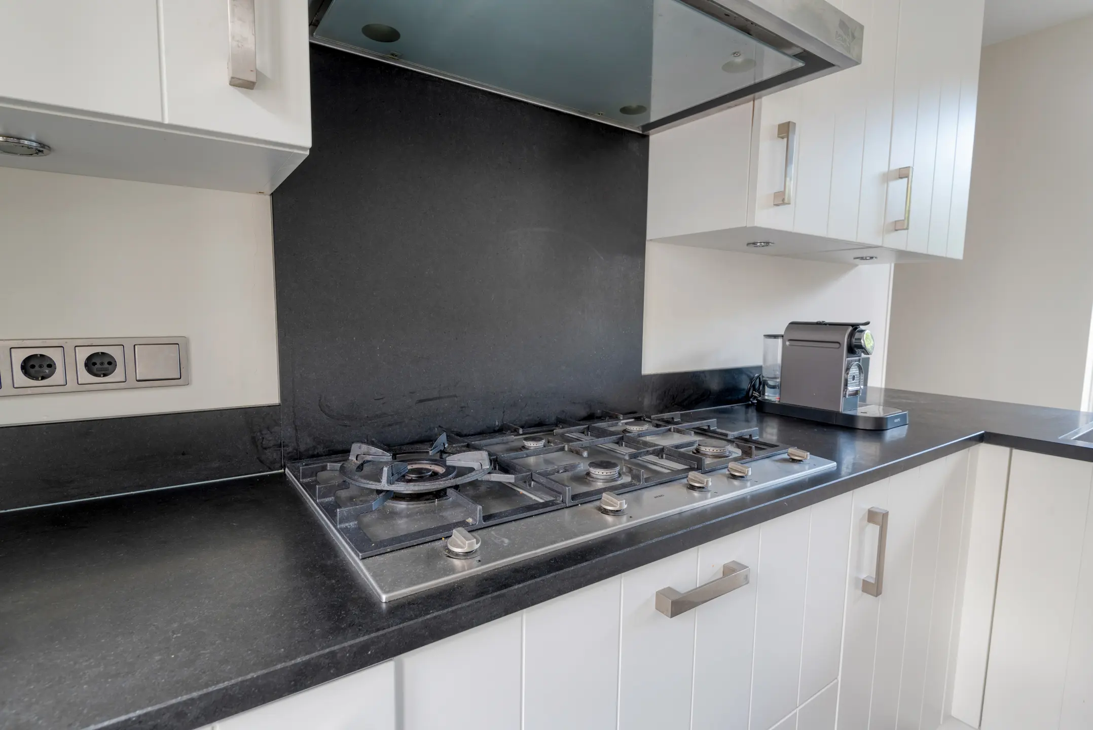 De open keuken is modern uitgevoerd en beschikt over diverse inbouwapparatuur. Ideaal om gezellig te koken en tegelijkertijd contact te houden met gezinsleden of gasten. De keuken is voorzien van onder andere een kookplaat, oven, vaatwasser, koelkast en een kokend waterkraan.