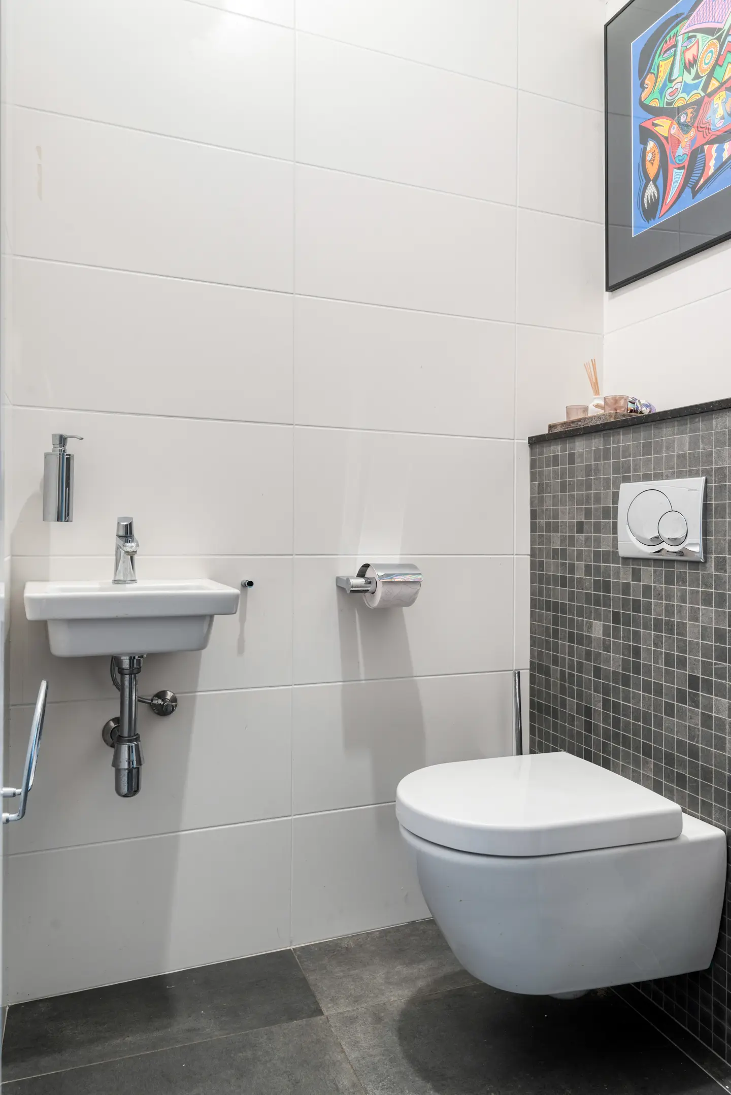 Moderne badkamer voorzien van een ligbad, wastafel met wastafelmeubel, hangtoilet en een douche. De badkamer is goed onderhouden en netjes verzorgd.