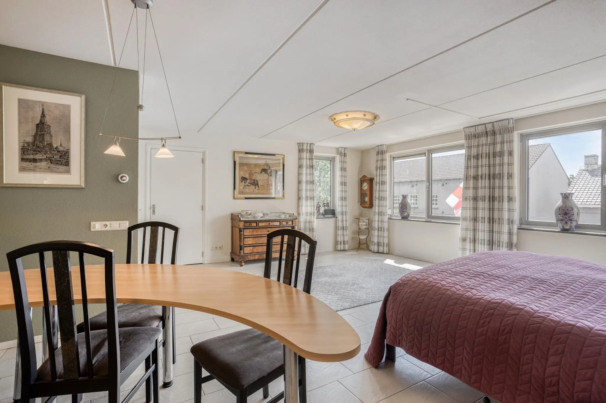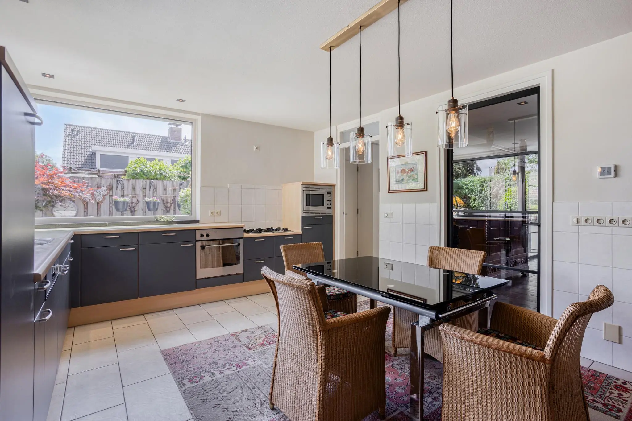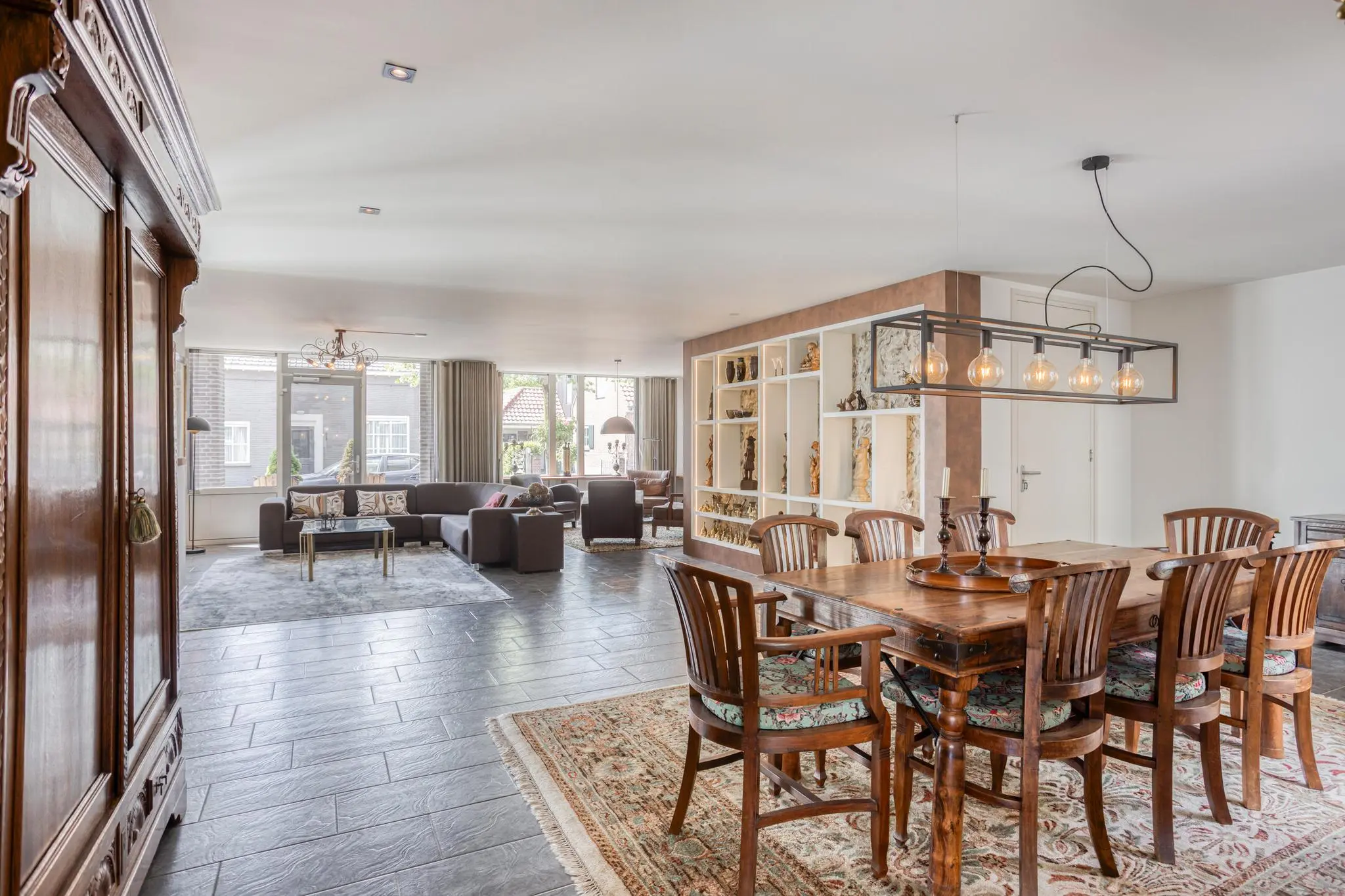 Eetkamer in het hart van de woning – open maar beschut, met doorkijk naar de keuken