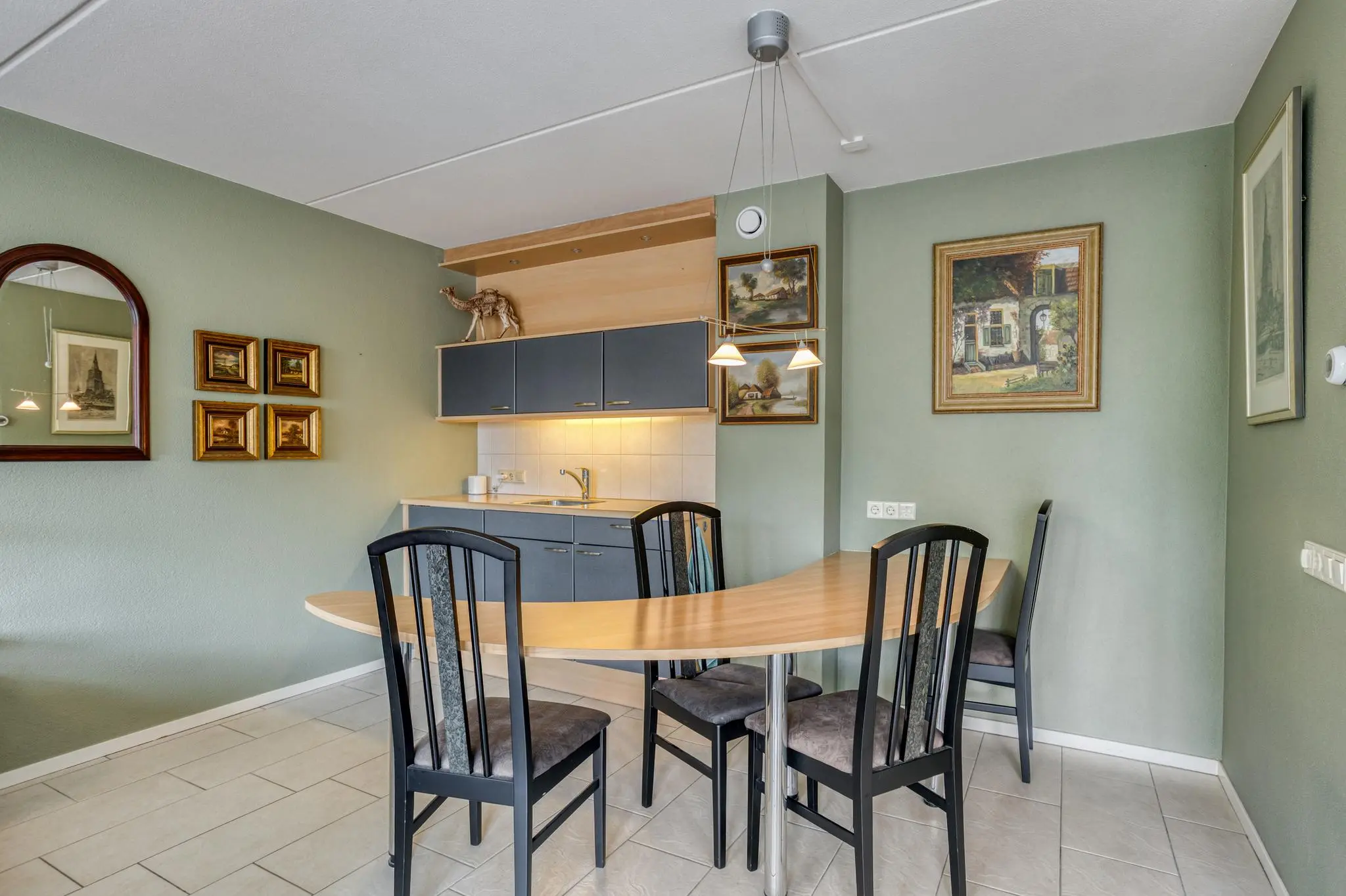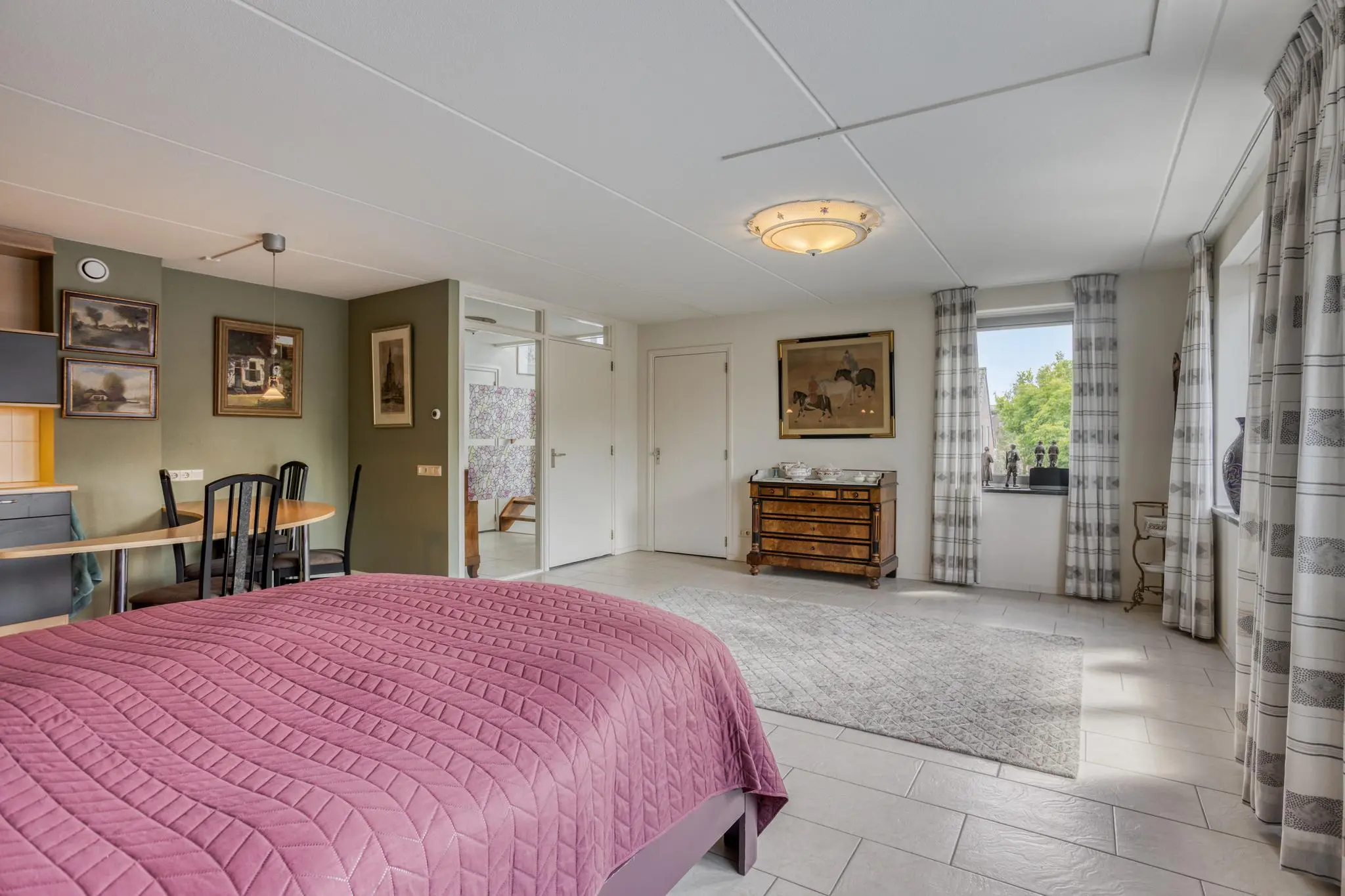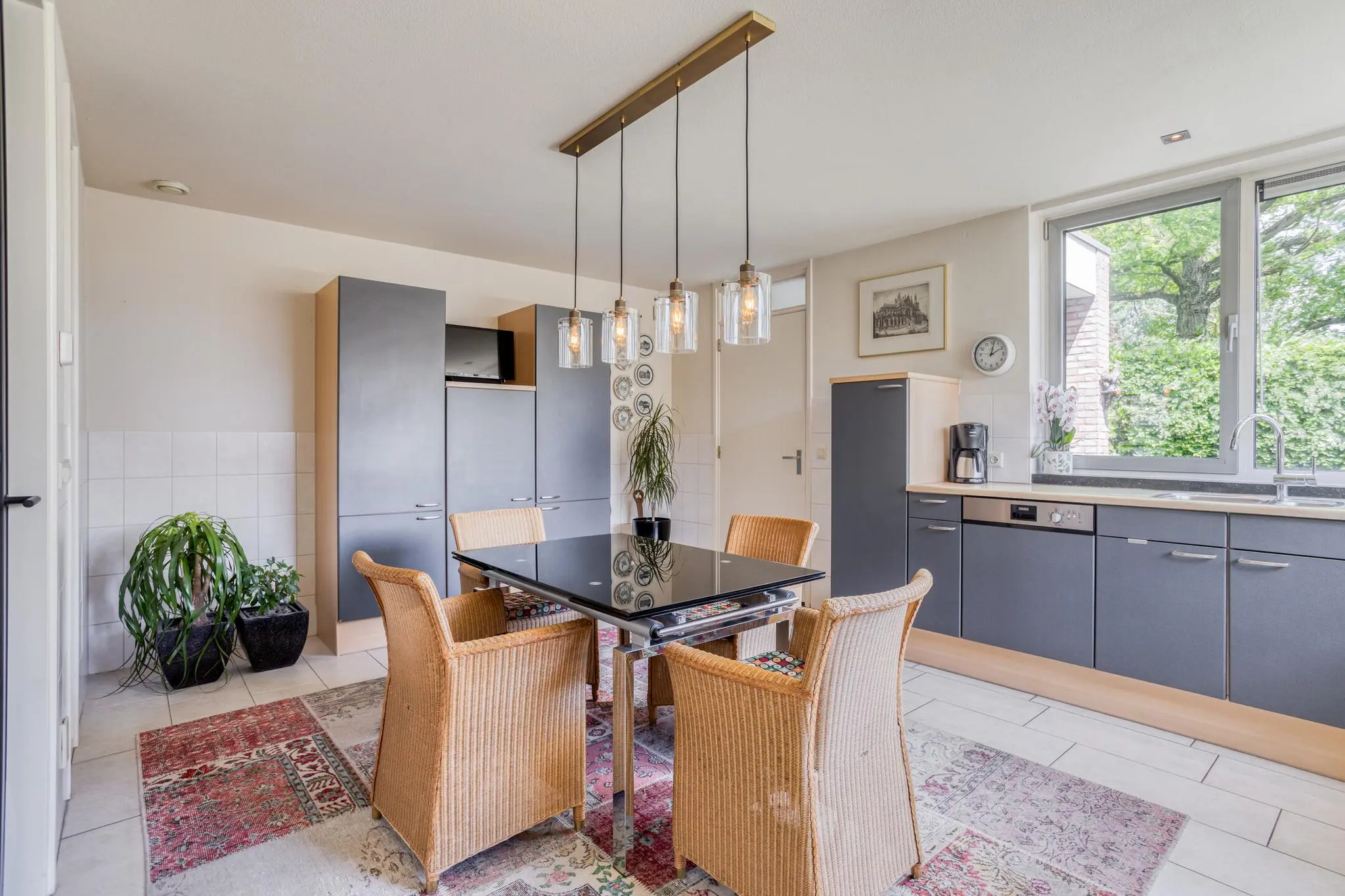 Eetkamer in het hart van de woning – open maar beschut, met doorkijk naar de keuken