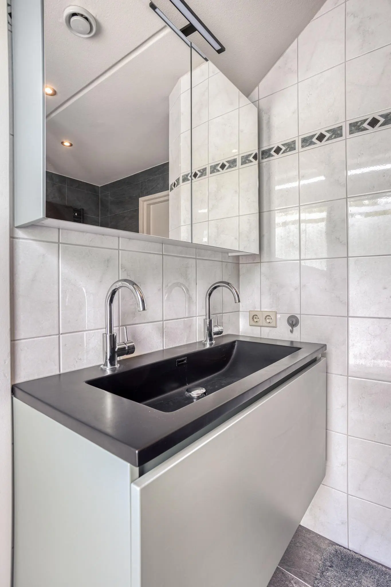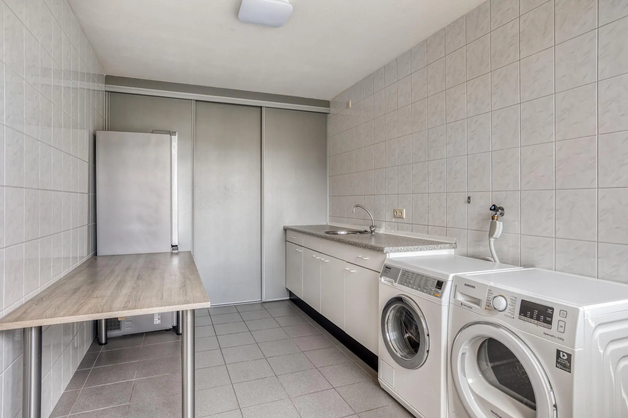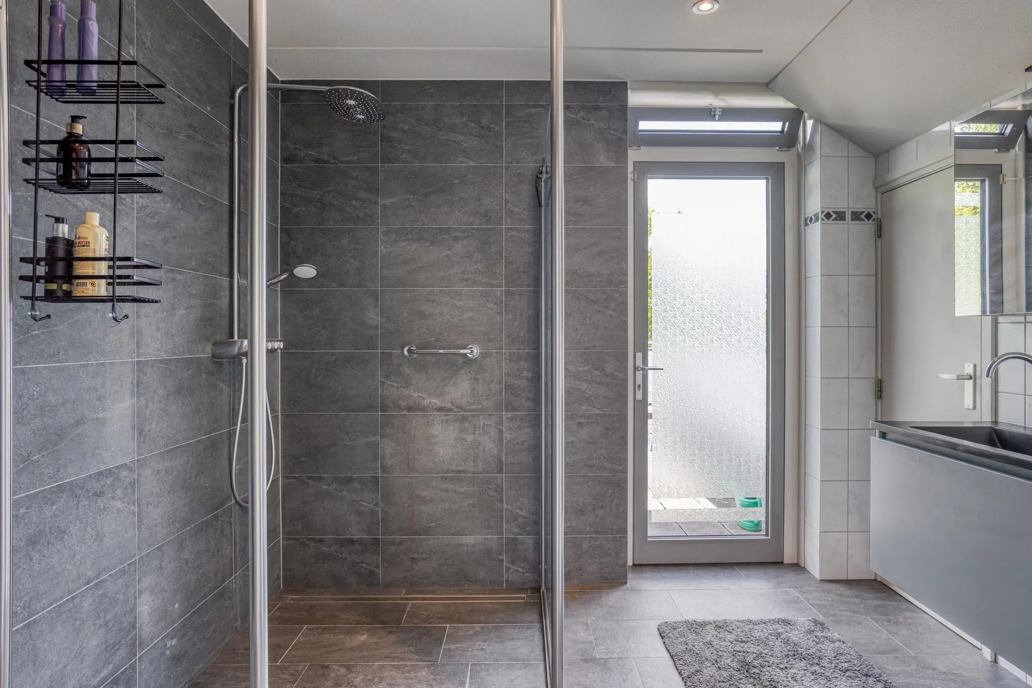 Volwaardige badkamer met douche, wastafel en bergruimte