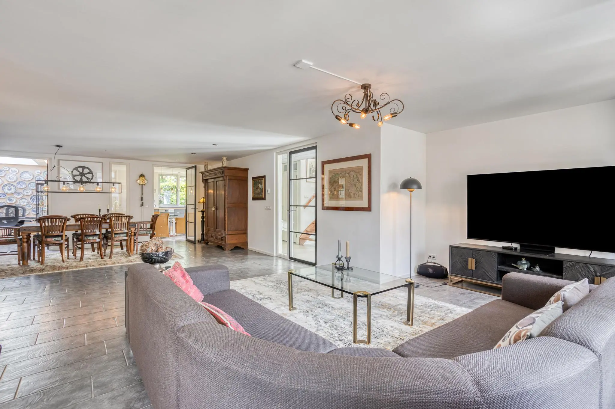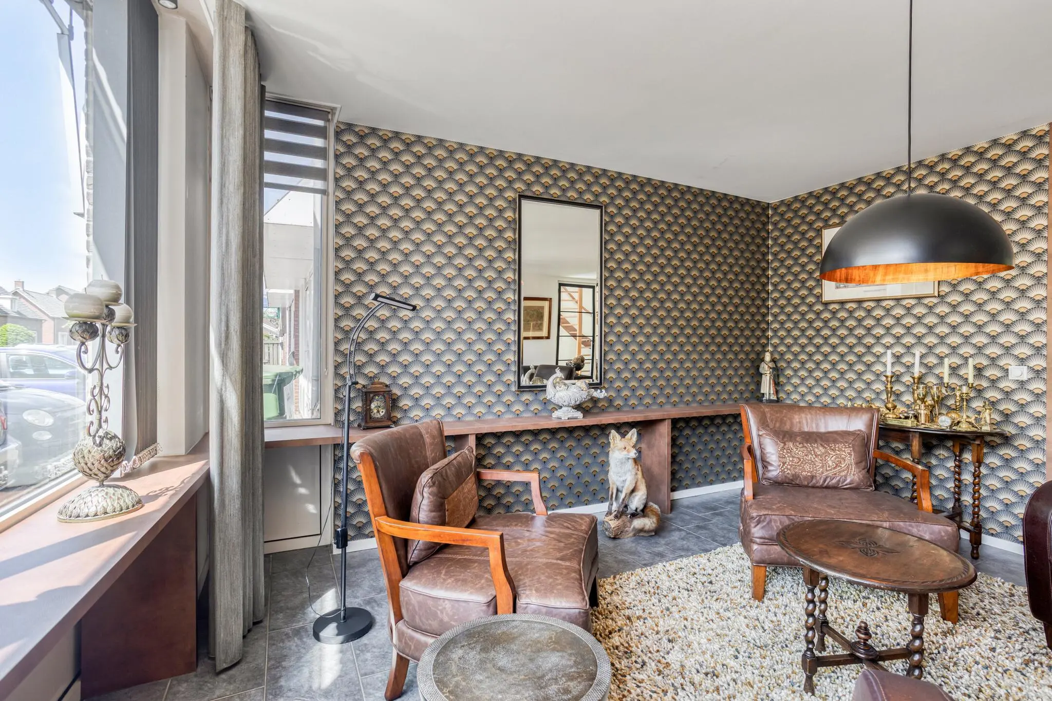 Woonkamer aan de voorzijde met grote raampartijen en een gezellige indeling