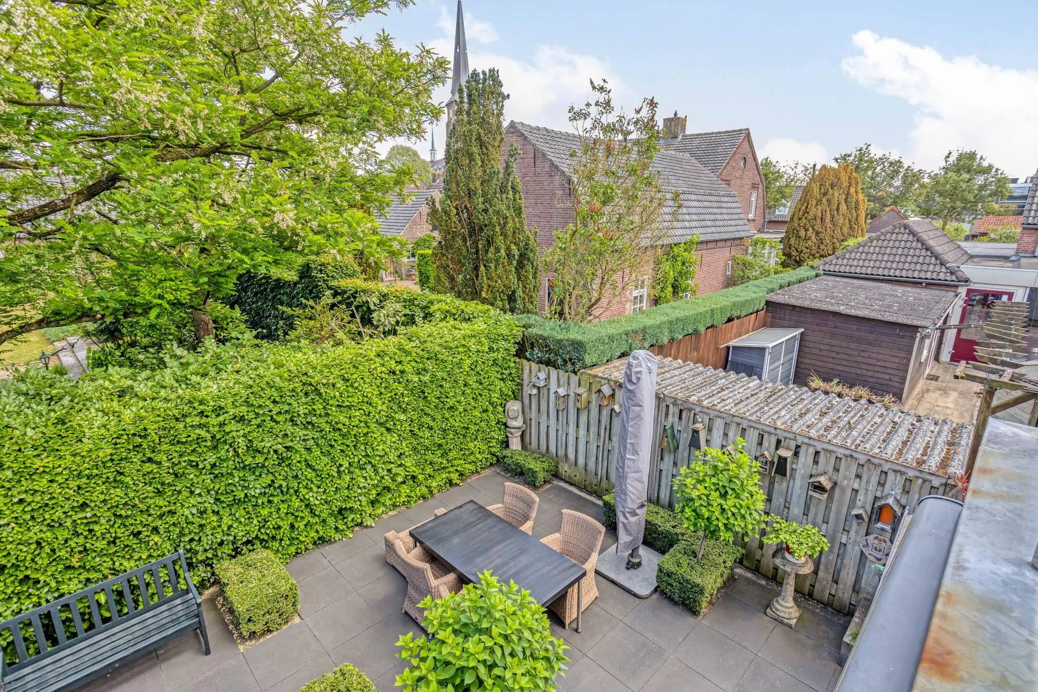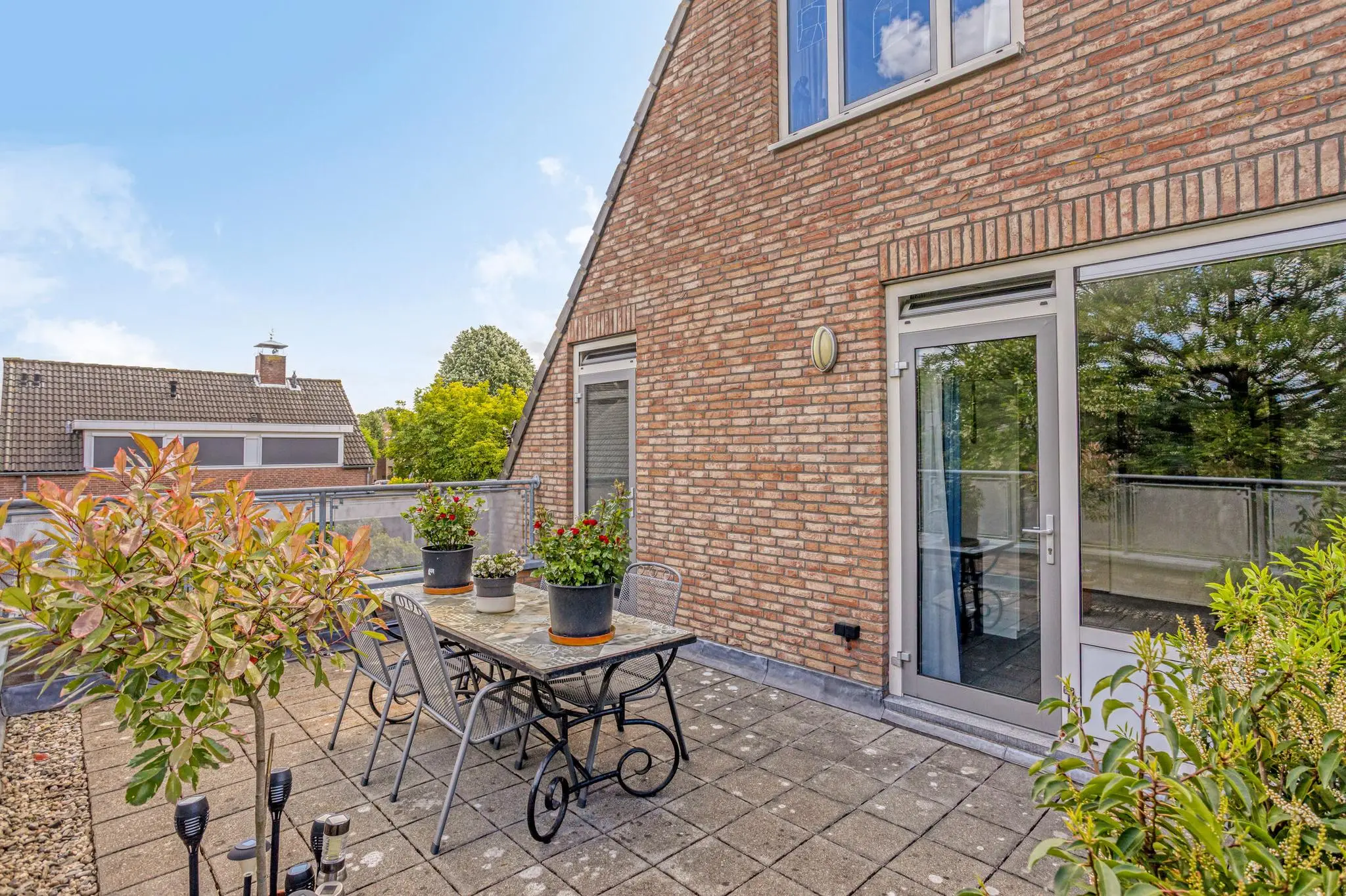 Dakterras aan de achterzijde, bereikbaar via dubbele deur vanuit de overloop – een heerlijke plek in de zon met veel privacy