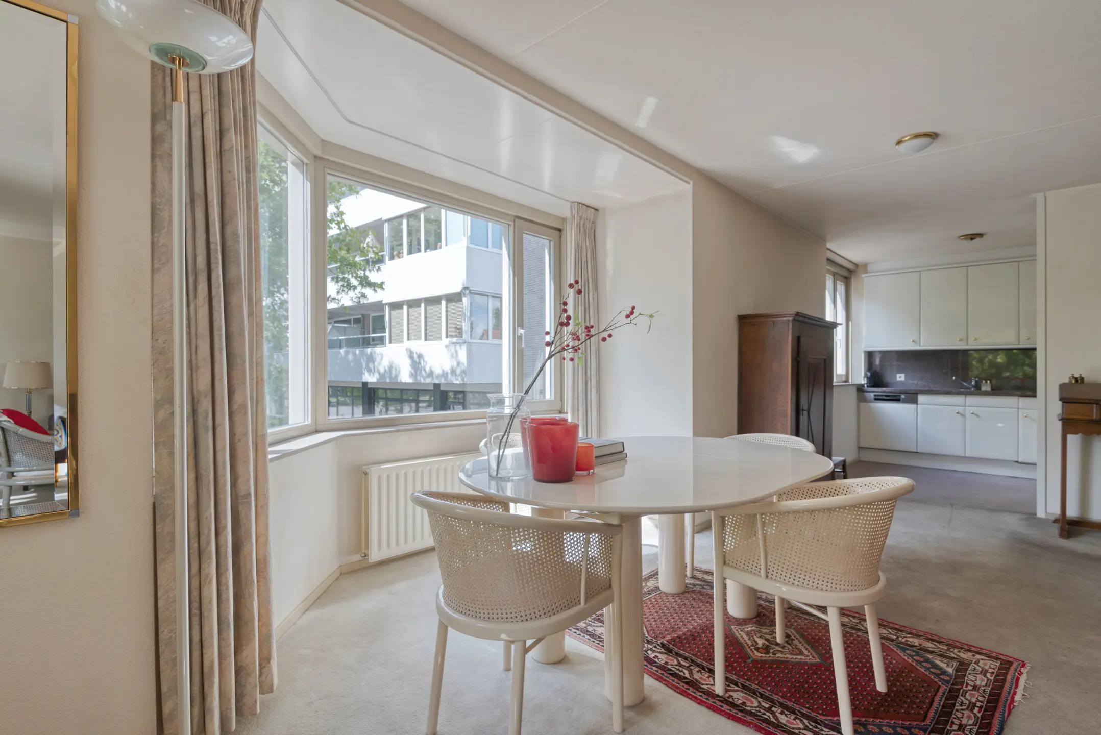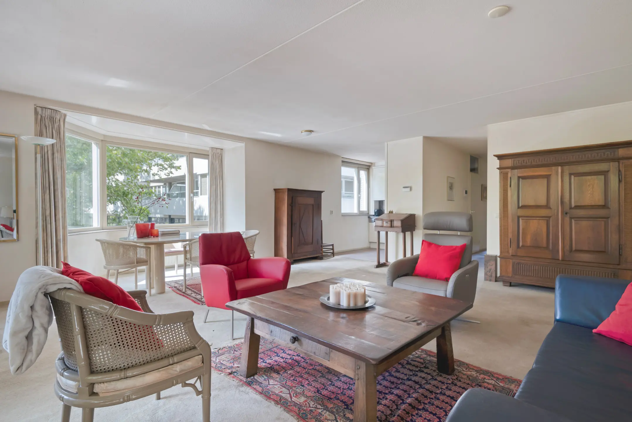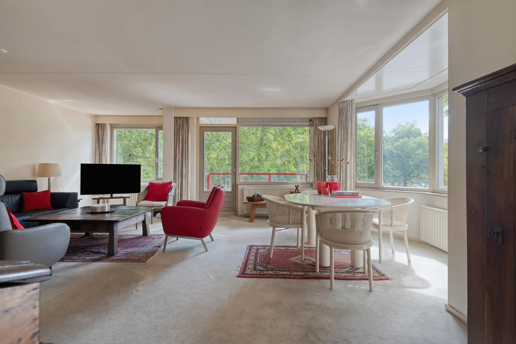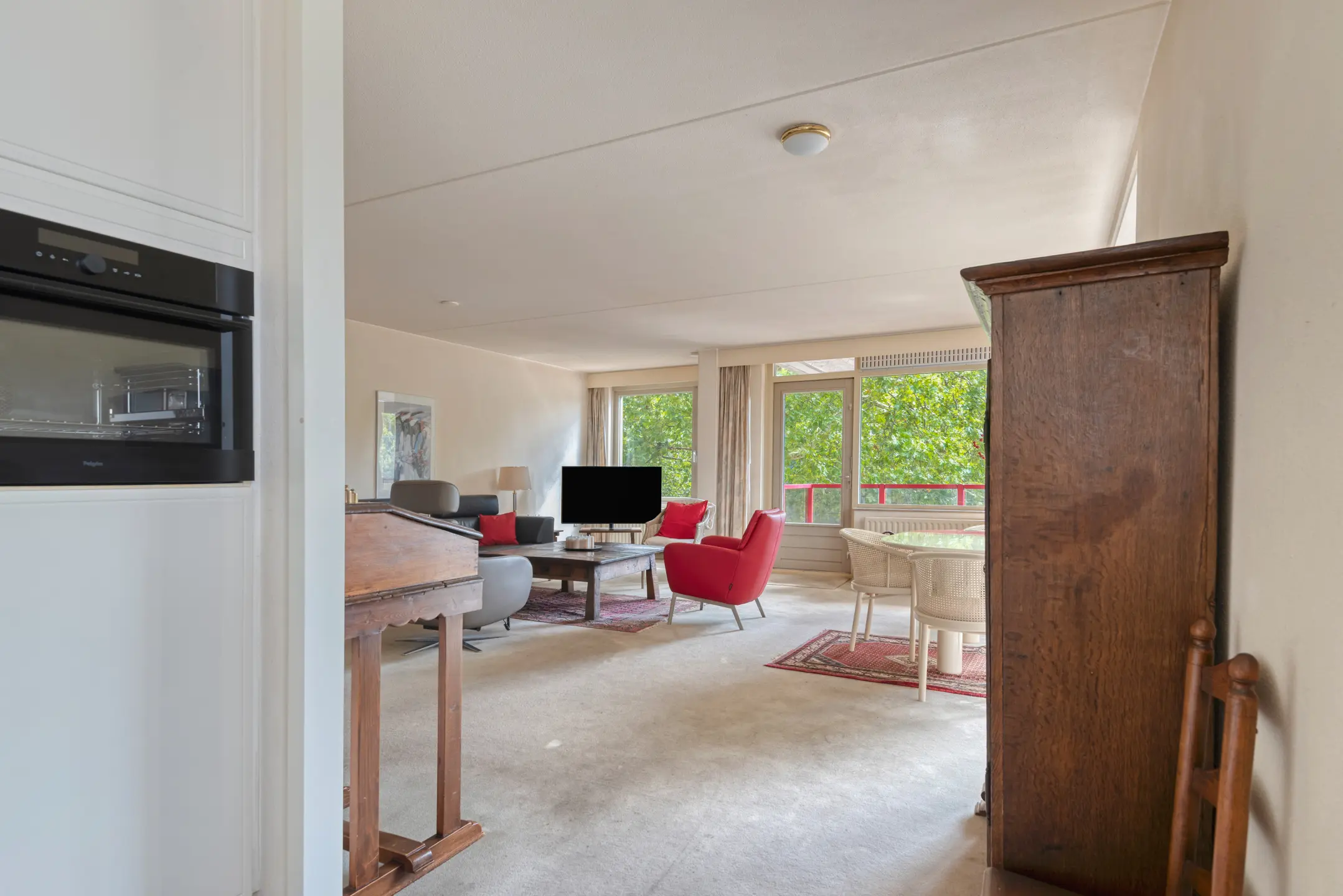 De royale woonkamer biedt veel lichtinval door de grote raampartijen voorzien van HR+ glas en geeft direct toegang tot het balkon. Hier heeft u alle ruimte voor zowel een zit- als eetgedeelte.