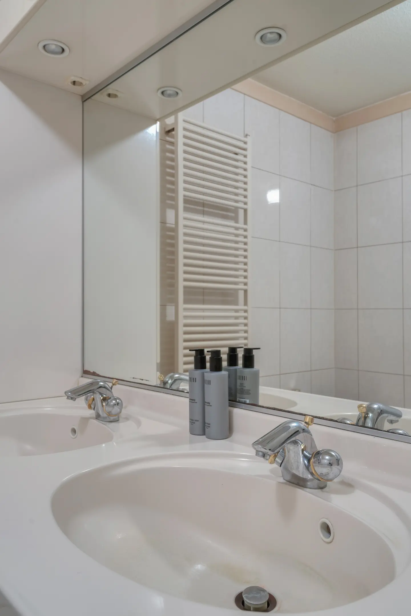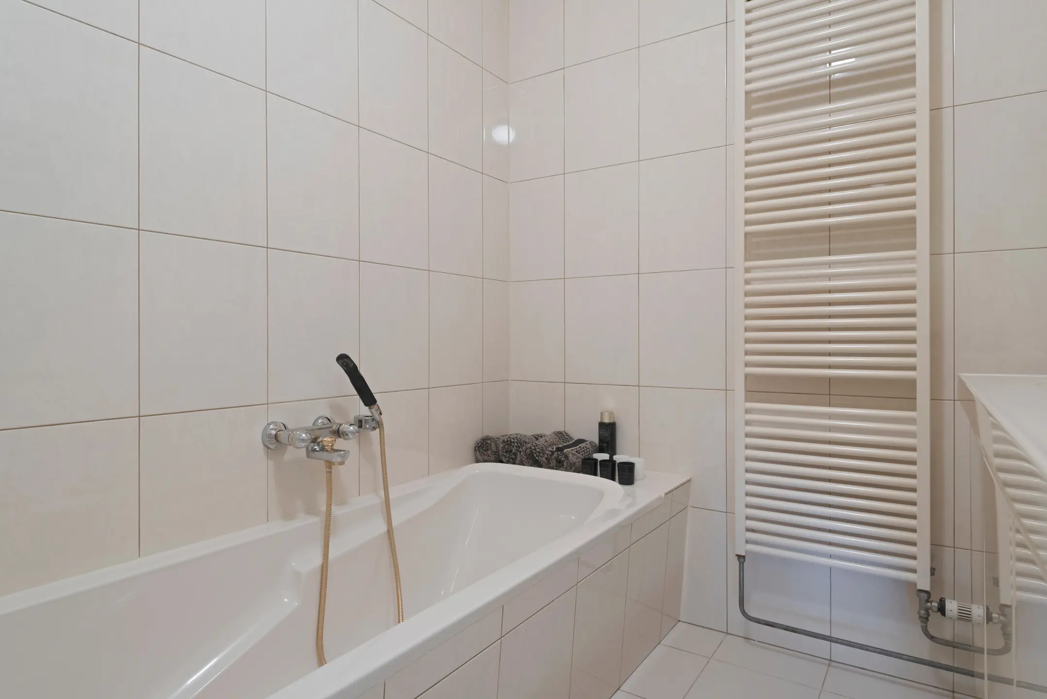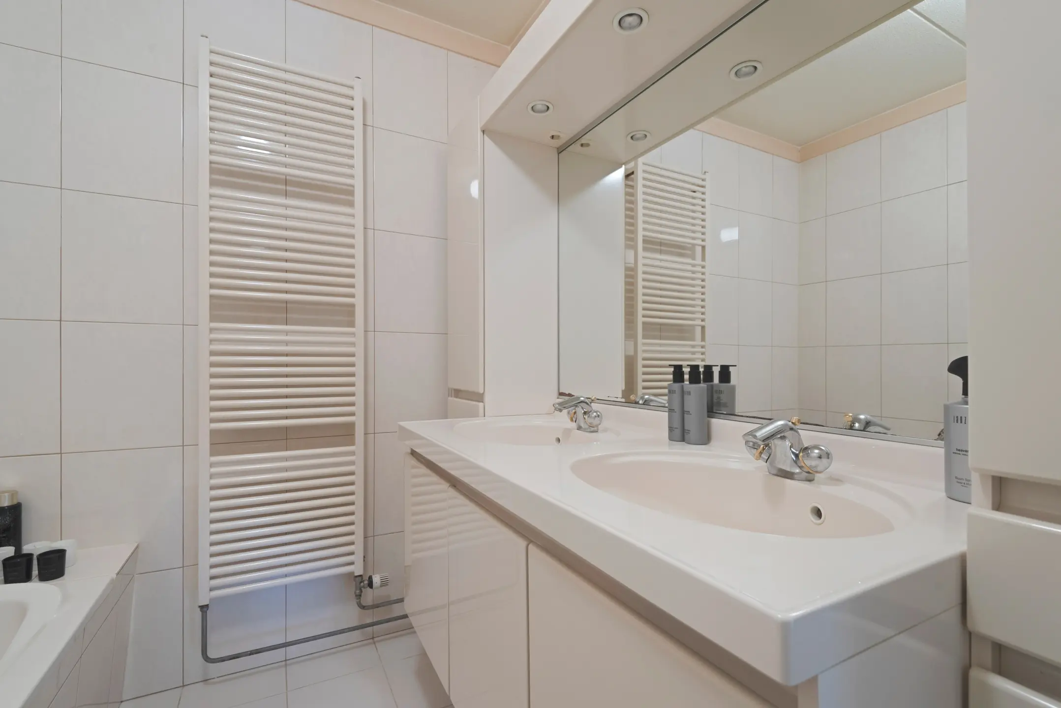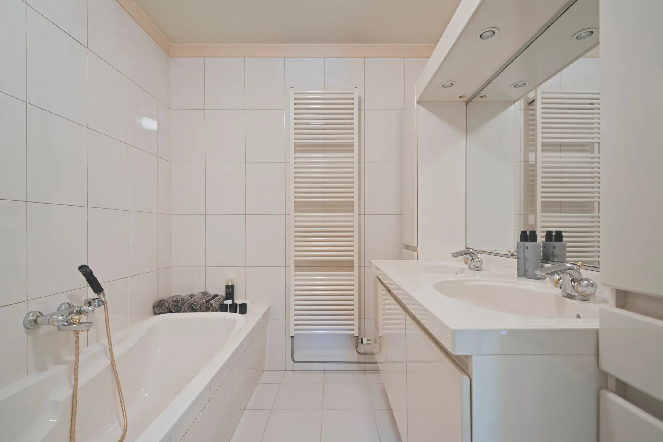 De badkamer is voorzien van een ligbad, douche, dubbele wastafel, badkamermeubel en design radiator.
