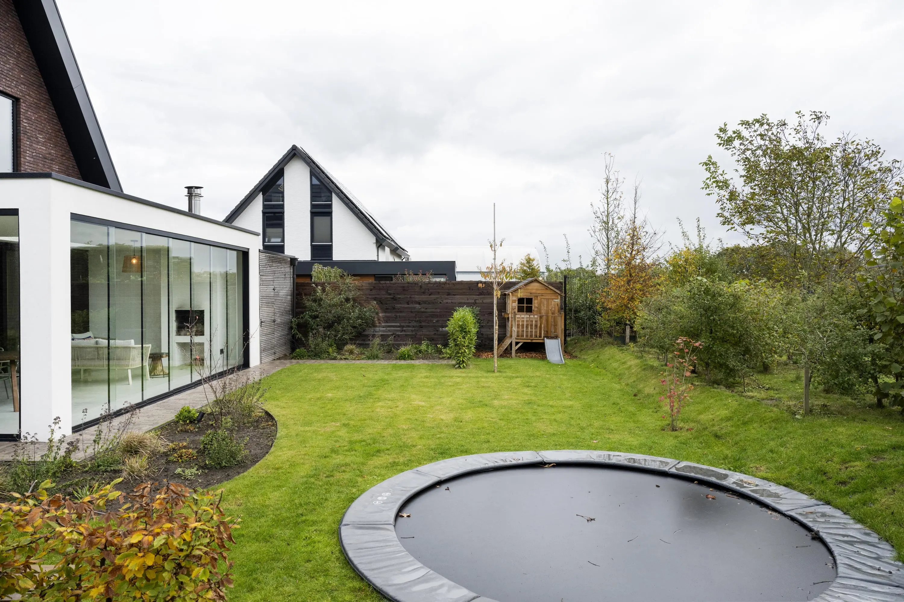 Buiten vind je een goed onderhouden tuin met zowel een achtertuin, voortuin als een zijtuin. De achtertuin met vrij uitzicht is voorzien van een tuinhuis, zandbak, trampoline en een kippenren. Tevens is de er een Rainbird bewateringsysteem in zowel de voor- en achtertuin.