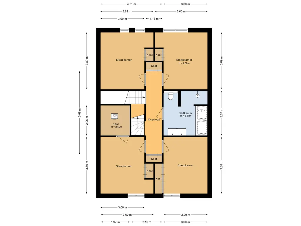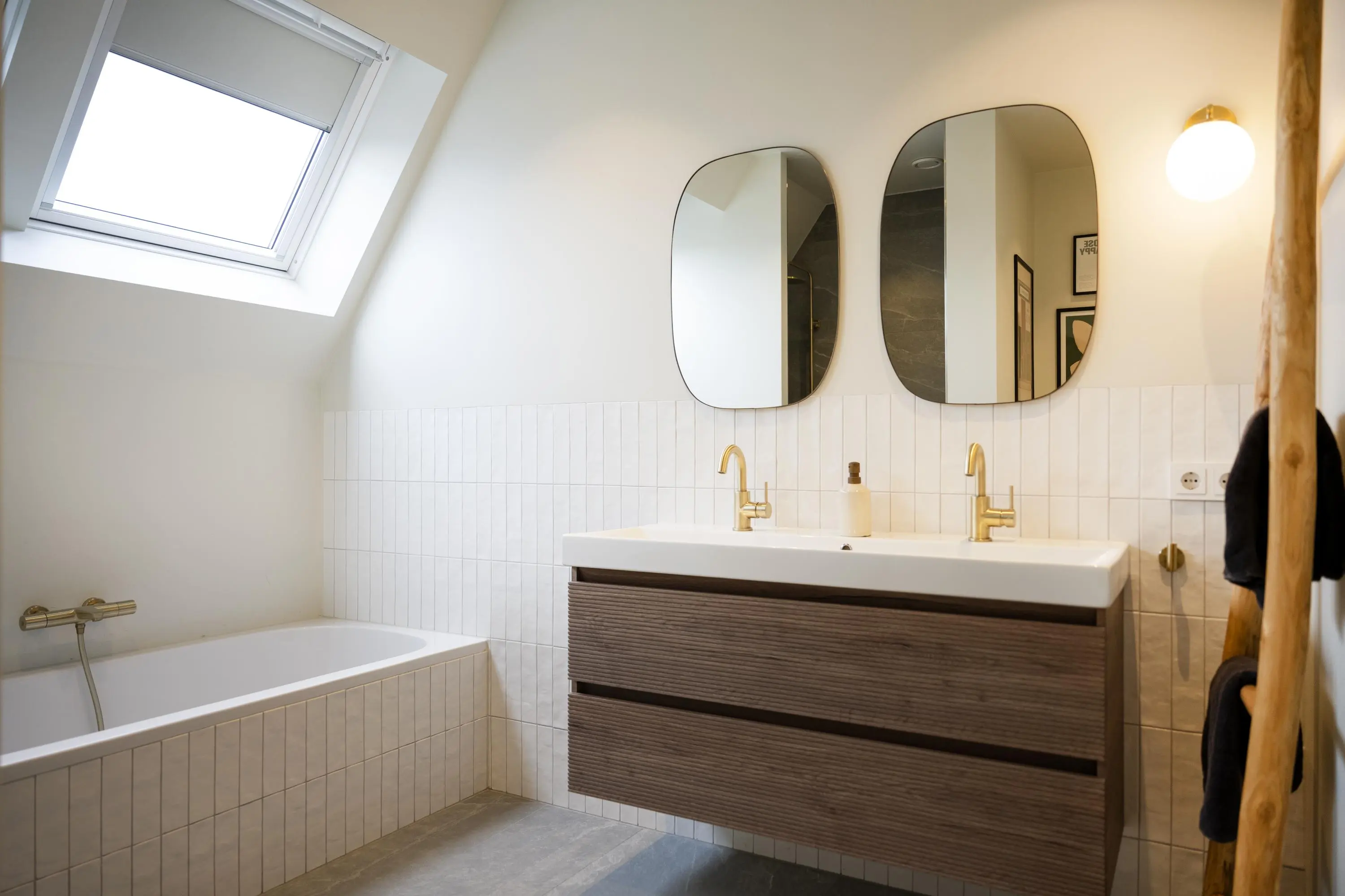 Op de eerste verdieping vinden we een viertal kamers welke allen zijn voorzien van een praktische inbouwkast, tevens biedt een van de slaapkamer ook toegang tot de stookruimte. De badkamer (2023) is voorzien van een hangend closet, dubbel wastafelmeubel, ligbad en inloopdouche met hand- en regendouche.