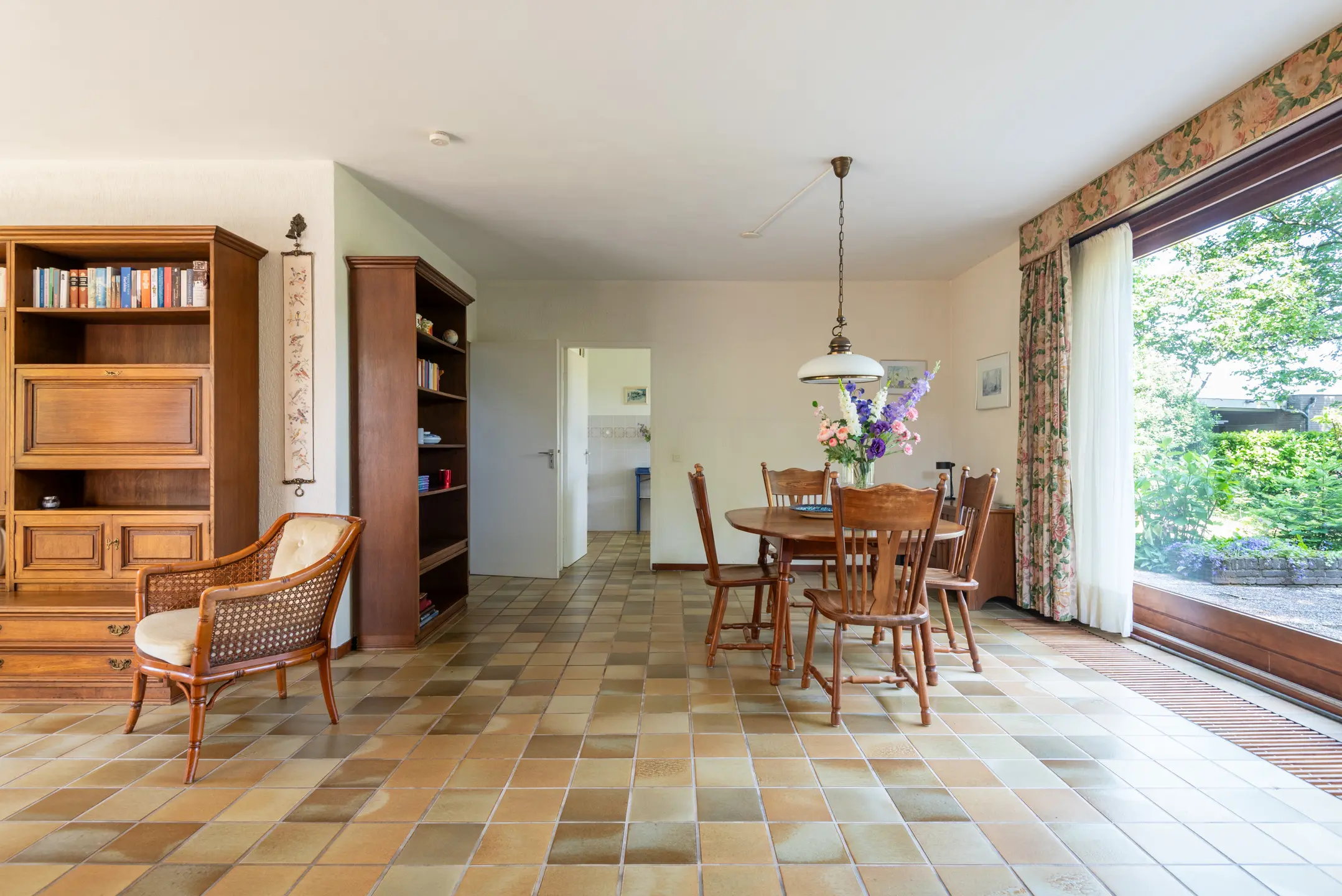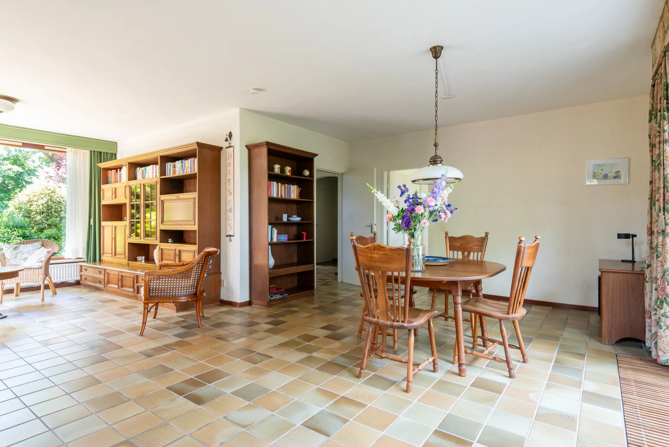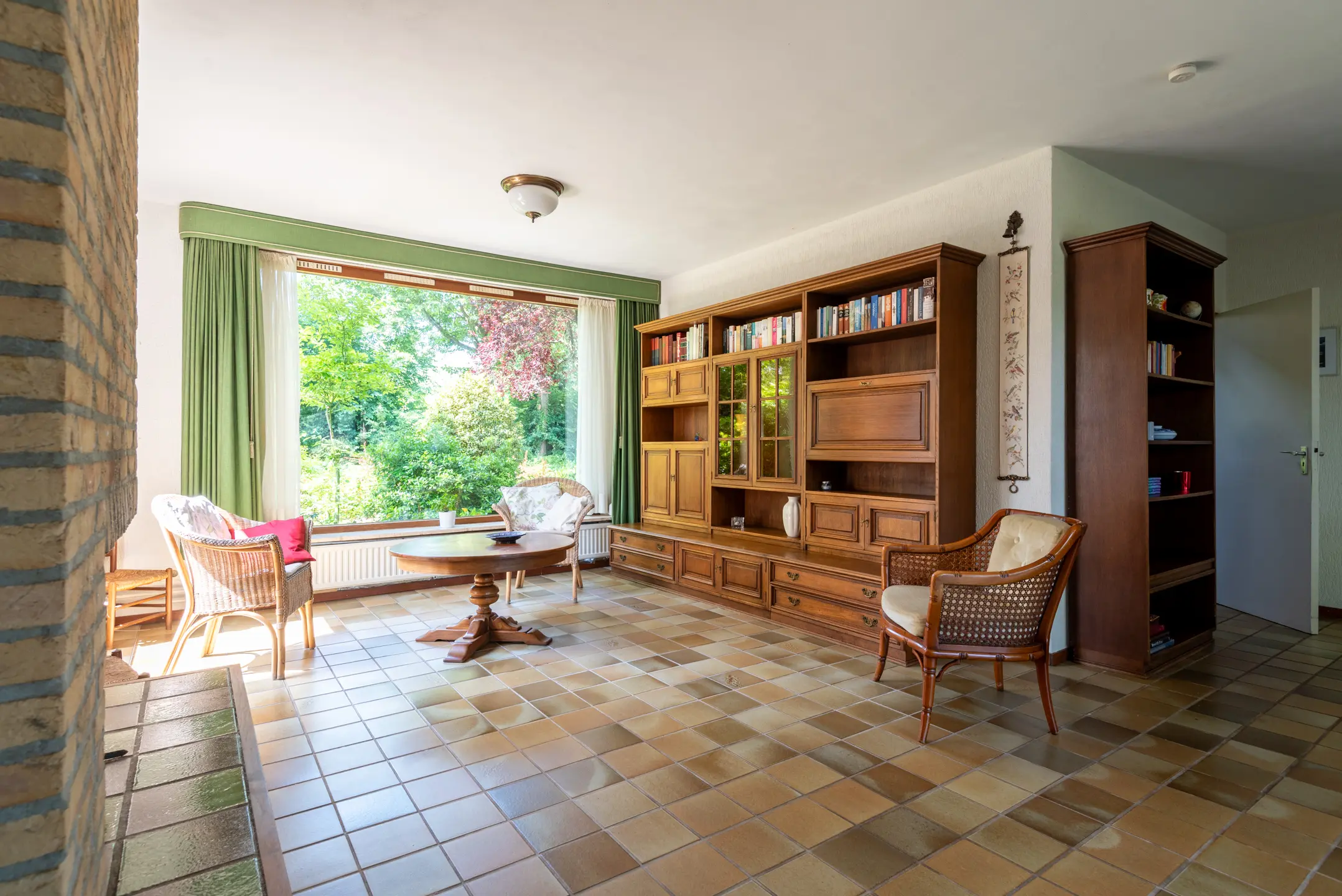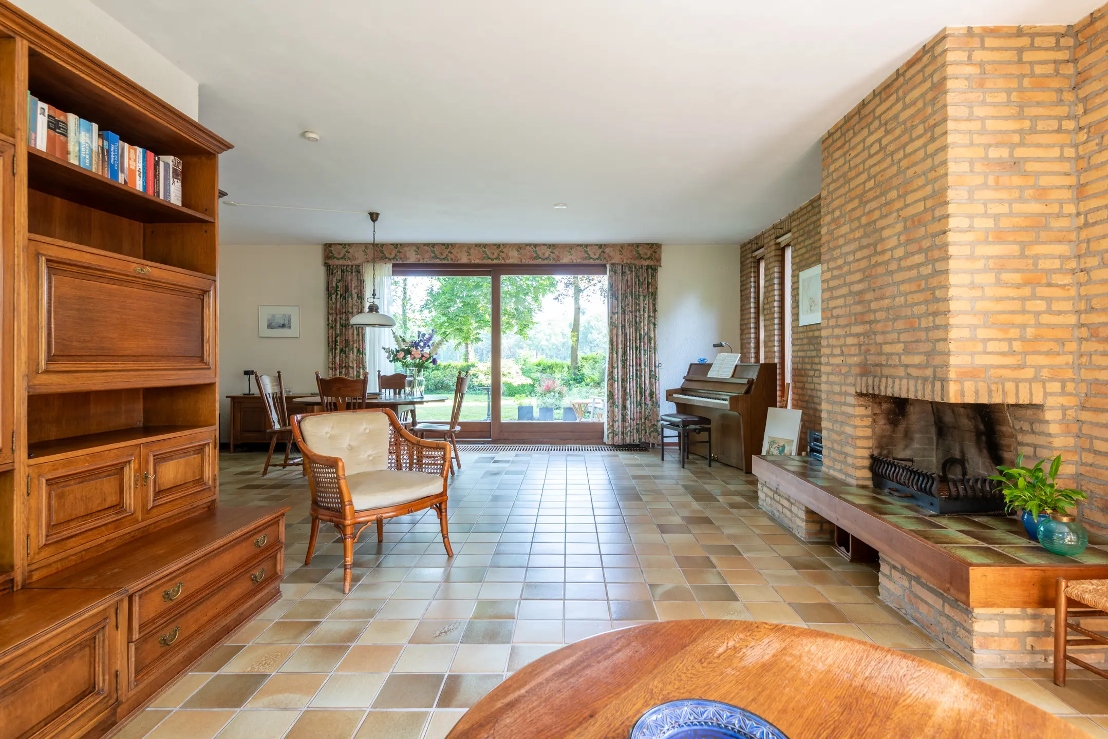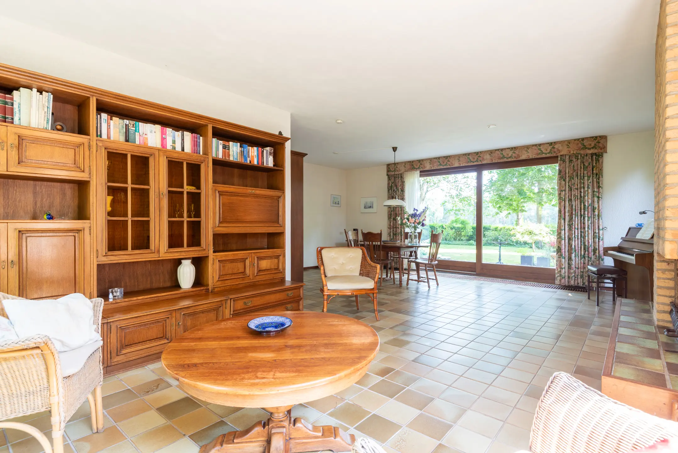 De living geniet van volop natuurlijk lichtinval, een prachtig zicht op de diepe achtertuin.