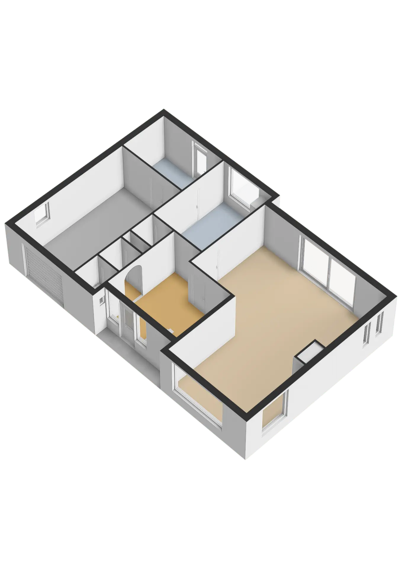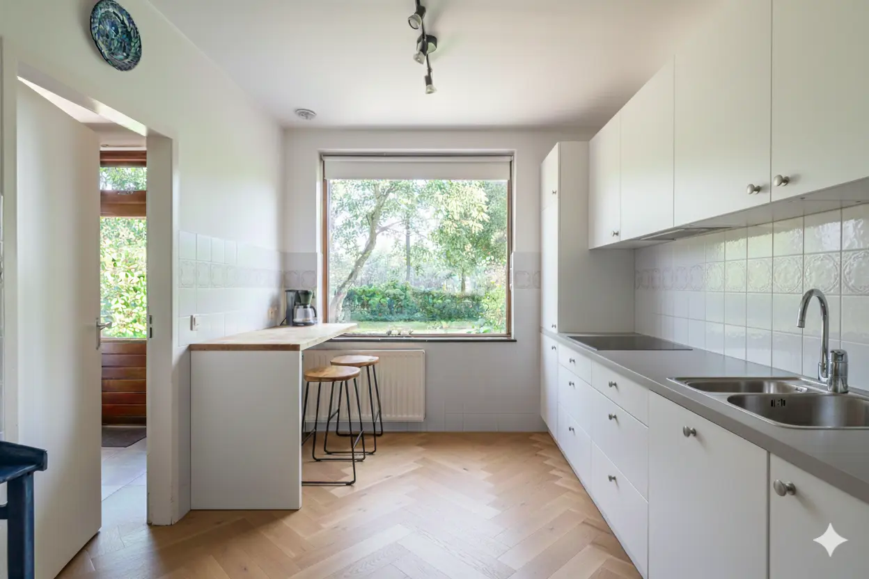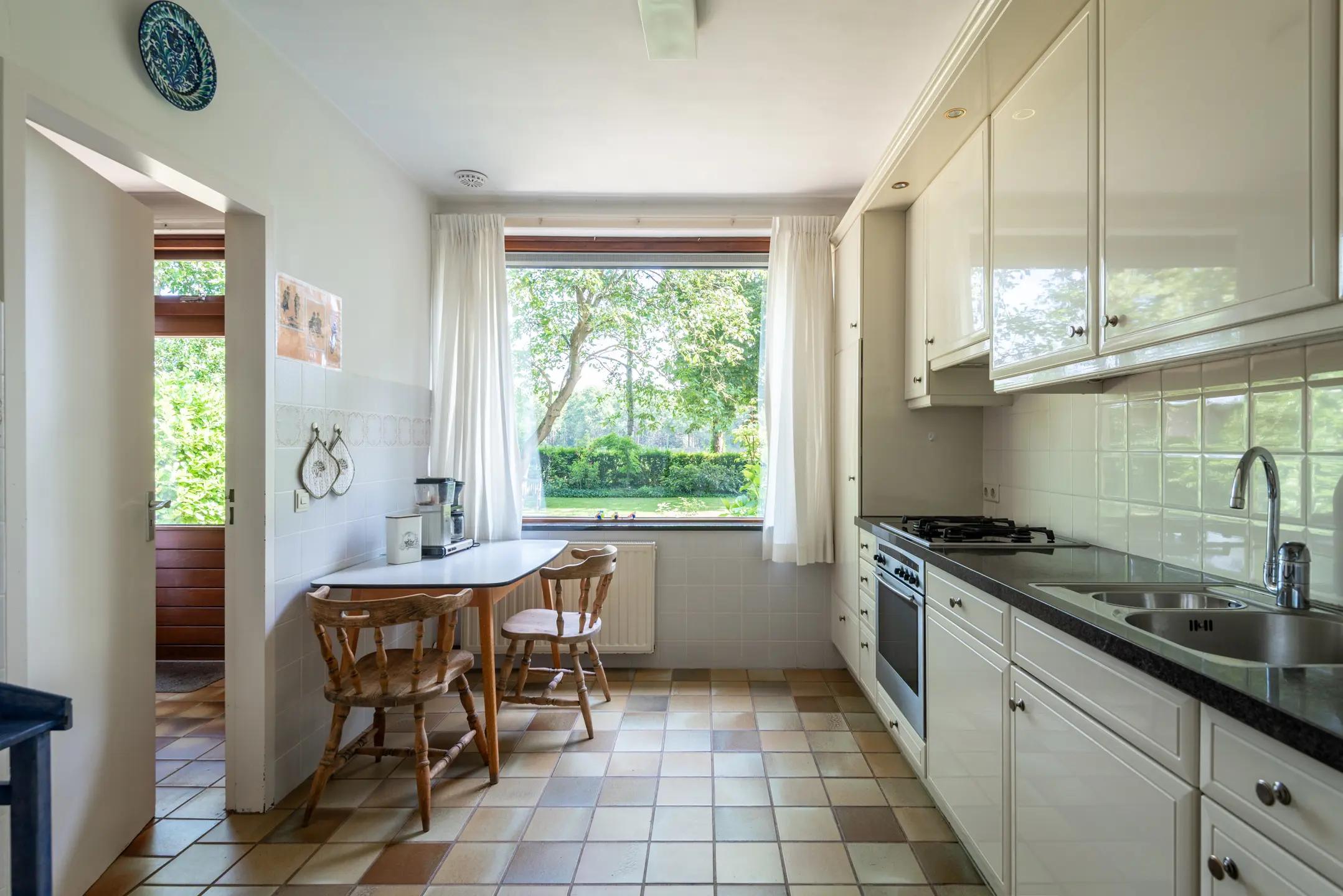De keuken is functioneel en biedt direct toegang tot de bijkeuken, van waaruit je doorloopt naar de inpandige garage. Deze garage is royaal, verwarmd en ideaal voor hobbyruimte, extra opslag of het stallen van voertuigen. Ook biedt deze ruimte veel potentieel voor het realiseren van een kantoor of praktijk aan huis.