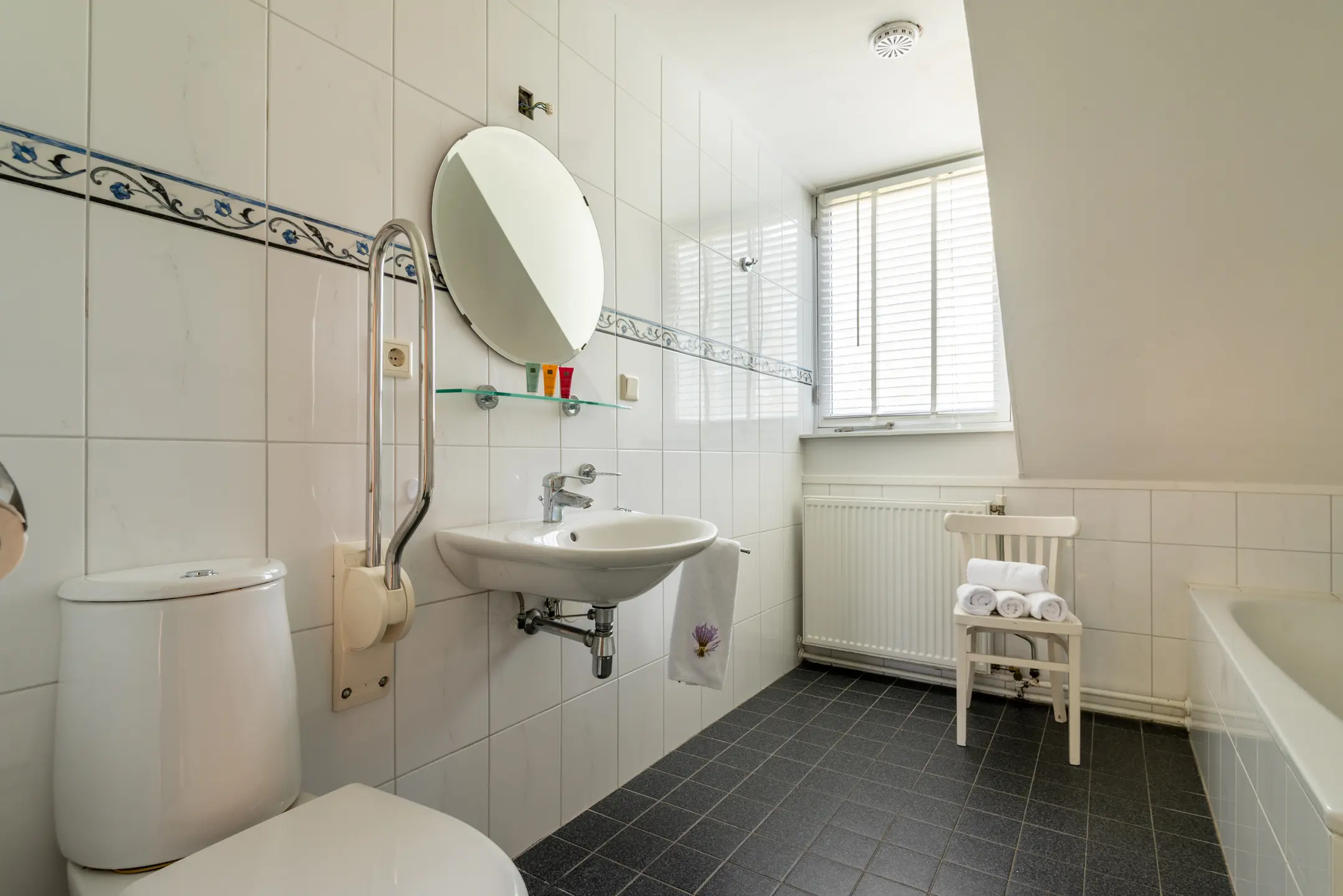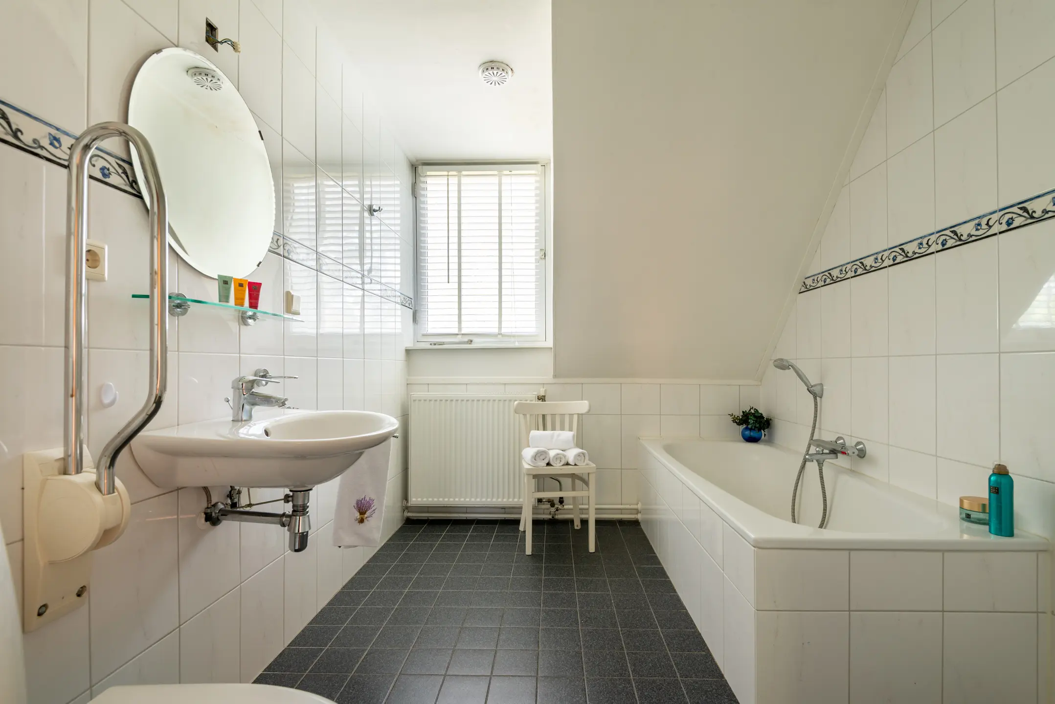 De ruime badkamer is compleet ingericht met een ligbad, aparte douche, tweede toilet en wastafel. Door het formaat is er bovendien ruimte voor modernisering naar jouw eigen wensen.